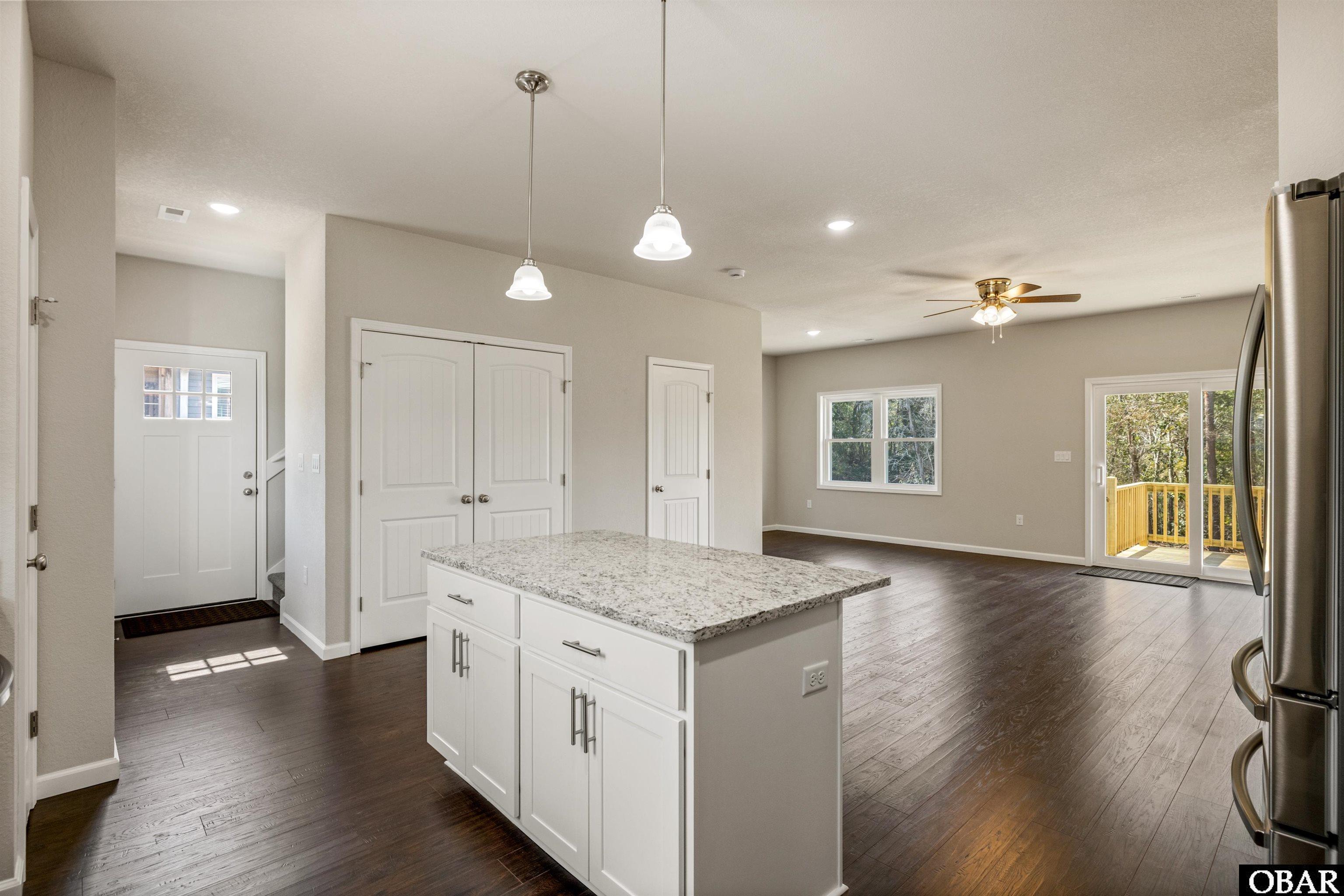 This Newly constructed beautiful home is located in one of the most popular neighborhoods on the Outer Banks. It is situated in the X Flood Zone and does not require flood insurance. There are nine foot ceilings throughout the home giving it an air of spaciousness and has three bedrooms and two and a half bathrooms. The first level great room has beautiful wood floors and a sliding glass door that opens onto a sun deck for outdoor enjoyment. The well equipped modern kitchen includes a brand new stainless steel range oven, microwave, dishwasher and refrigerator with an ice maker. There is also a nice island for extra room for food preparation or presentation while entertaining. All of the countertops are durable and beautiful granite. There is ample soft close cabinetry as well a pantry. The convenient half bath is located just off the great room for your convenience. The carpeted stairs lead to the second level with all three bedrooms. The master ensuite bedroom has a large walk-in closet and the bathroom has tiled floors and a double granite top vanity. The two additional guest bedrooms share a bath and also have tile floor and a granite top vanity. Heating and cooling is provided by two zoned HVAC systems. There is a spacious utility room on the ground level for tools and extra storage. An outside shower is a must and is located in the carport. The exterior of the house is smart low maintenance vinyl siding. The amenities include a community soundfront park shaded by ancient beautiful live oaks and a sandy beach, perfect for swimming or just chillin'. There is also a nice boat ramp for launching your boat for a "Harbour Cruise" as well as access to Albemarle, Currituck, Roanoke and Croatan Sounds. These waters are great for fishing, crabbing, sailing, kayaking, windsurfing, paddleboarding and kiteboarding. The sunsets and moonsets are spectacular! For added enjoyment join the club! It gives you access to the large outdoor pool, tennis court and clubhouse. You won't find a better year 'round affordable community on the Outer Banks. Live the good life! You deserve it.