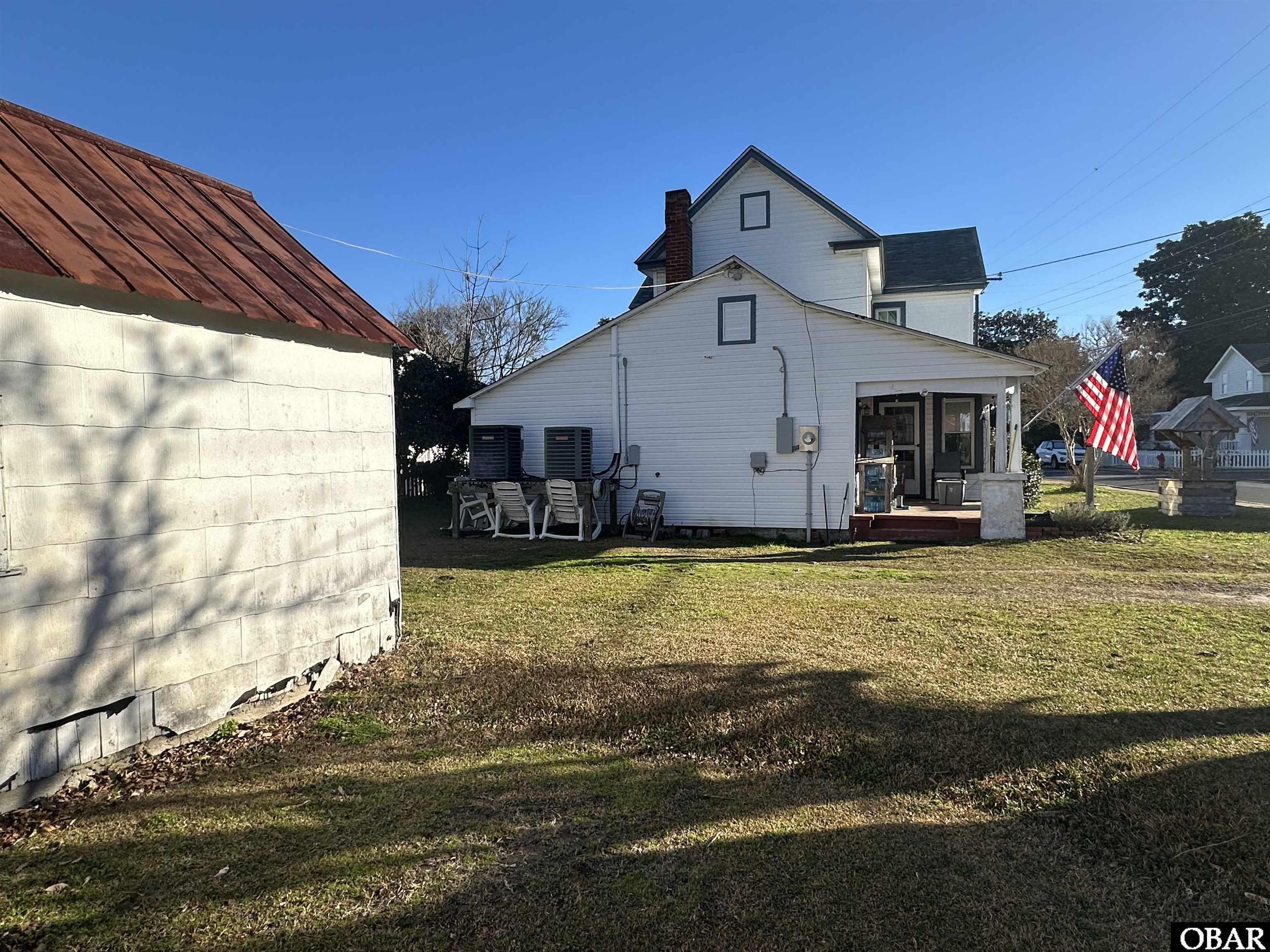 Located in the heart of Manteo, this 1900-built home is designated Historic Residential and reflects the character and craftsmanship of a bygone era while offering generous space and timeless appeal. Situated on a large corner lot, the property features a classic two-story bungalow design with a welcoming covered porch, mature landscaping, and a detached outbuilding ideal for storage or a workshop. Inside, original hardwood floors, beadboard walls and ceilings, a traditional staircase, and vintage door hardware highlight the home’s timeless charm. The home offers spacious living and dining areas, with the living room featuring cased openings and classic columns that create separation while maintaining an open feel. The kitchen includes a farmhouse style sink, vintage cabinet details that reflect its history, and a walk-in pantry with ample shelving. With four bedrooms and two full baths, the home provides flexibility for family, guests, or a home office. The outdoor space offers room to garden, entertain, or simply enjoy the peaceful setting. From the inviting front porch to the deep backyard, there is plenty of space to relax and gather. The detached structure adds both function and character to the property. Whether you are seeking historic charm, comfortable living space, or a prime location, this home offers a rare opportunity in the heart of Manteo, ideal for full time living, a coastal retreat, or an investment opportunity. Conveniently located near downtown shops, the waterfront, restaurants, and local attractions, this property brings together history, space, and location in one offering.