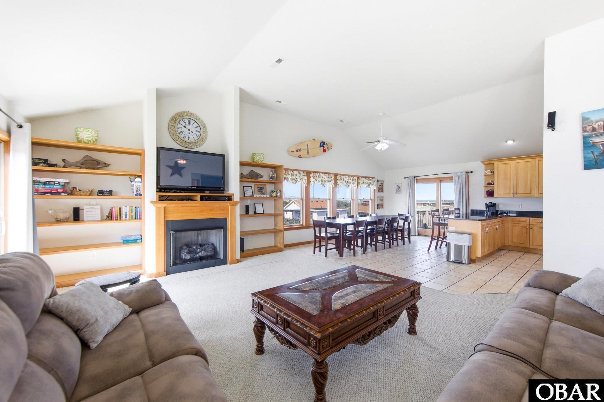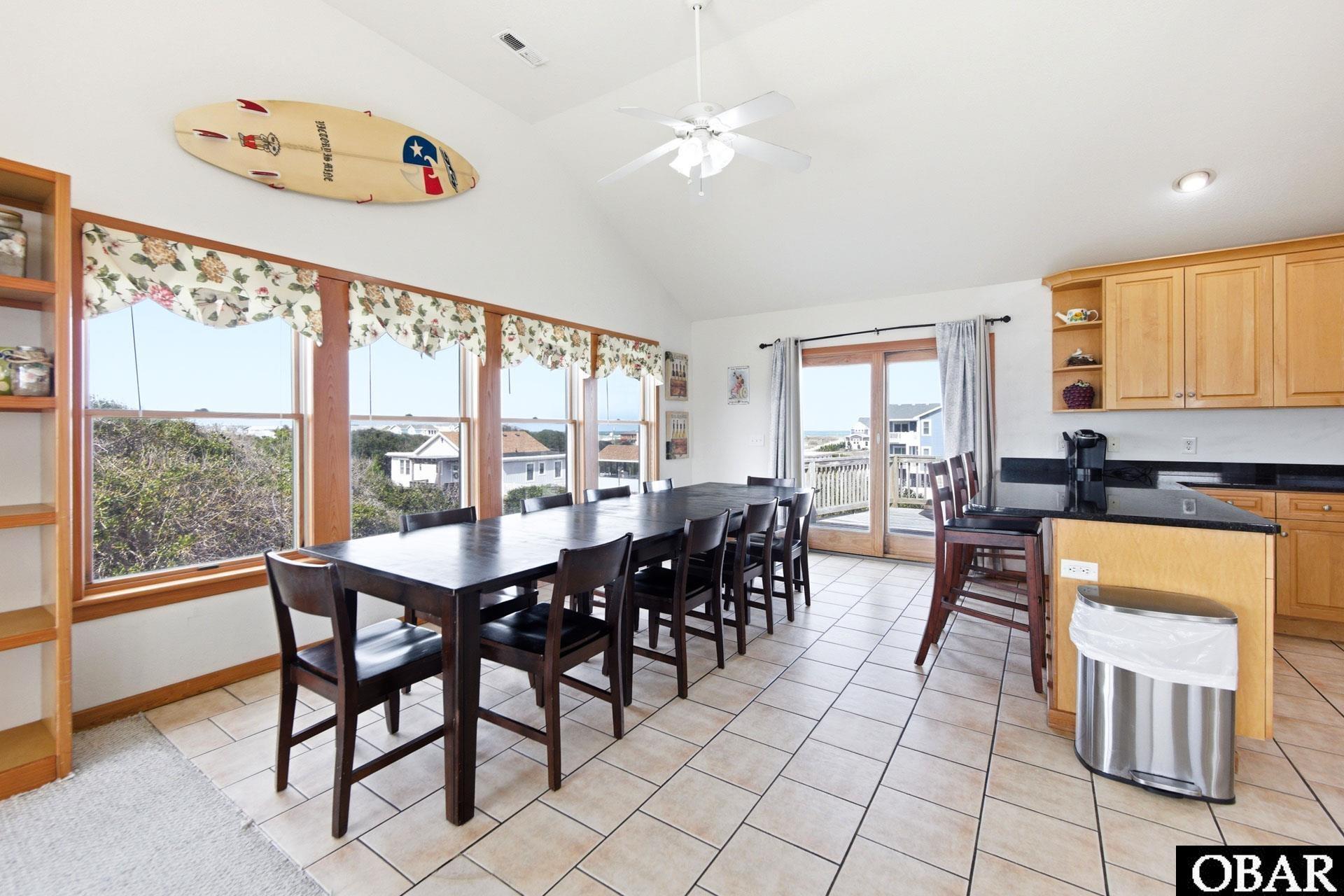 The top level is designed for connection and coastal living, featuring vaulted ceilings and an open-concept layout that brings everyone together. The spacious great room flows seamlessly into the dining and kitchen areas, where multiple seating options—including a dining table for ten, additional table for four, and bar seating—make hosting effortless. Step outside onto the sun deck to enjoy ocean breezes and horizon views. Two king ensuite bedrooms are also located on this level, offering privacy and convenience. An elevator provides easy access to all floors, making arrivals, groceries, and luggage a breeze.