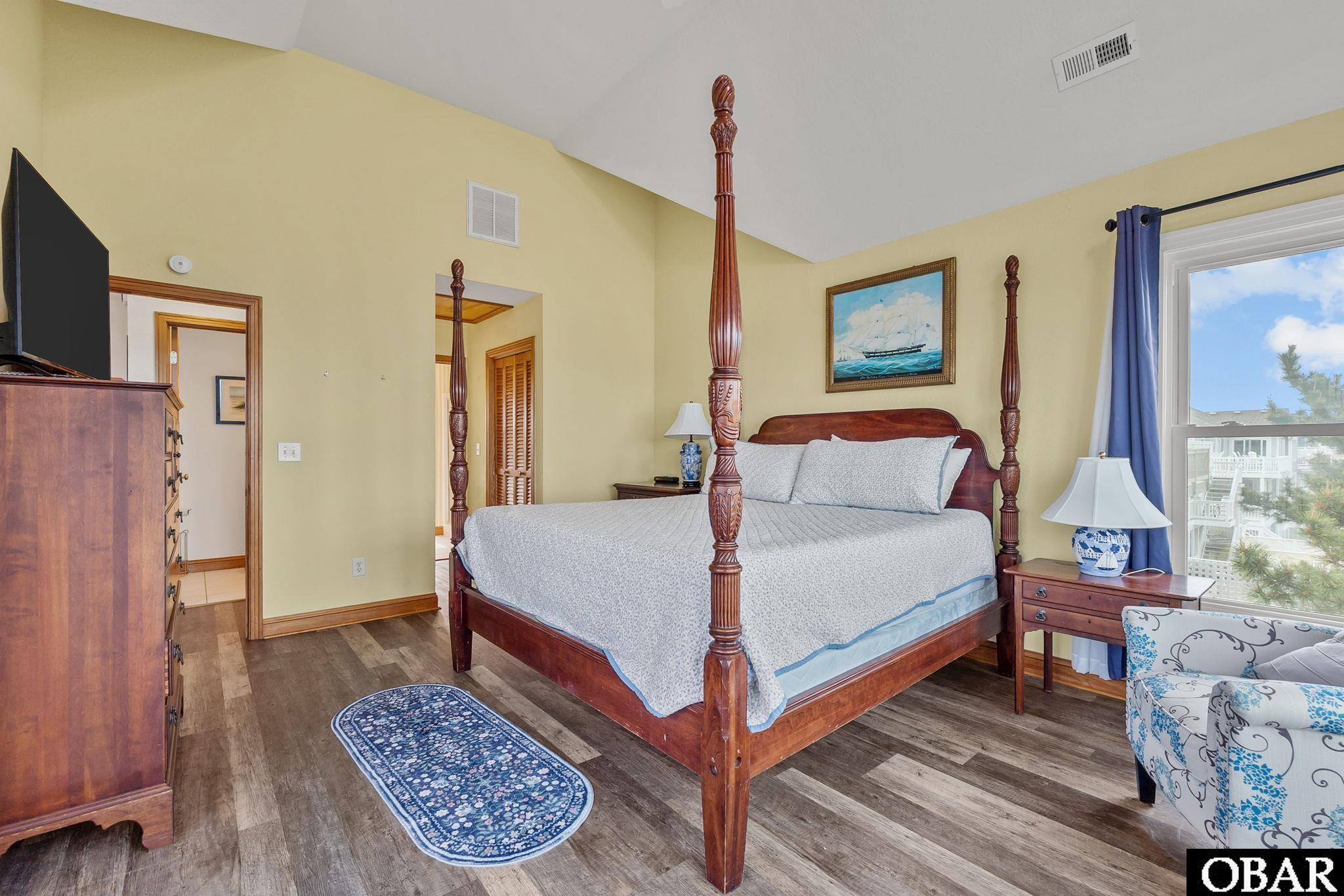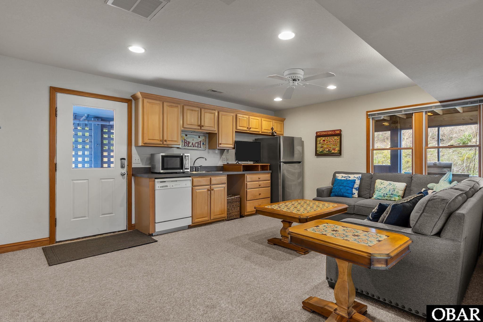 Beautifully furnished in a classic New England nautical theme, the home features a reverse-style floor plan that maximizes ocean views. The top level showcases an inviting living area, where the well-appointed kitchen, spacious dining area, and living room seamlessly flow together. It is ideal for gathering, entertaining, and relaxing.