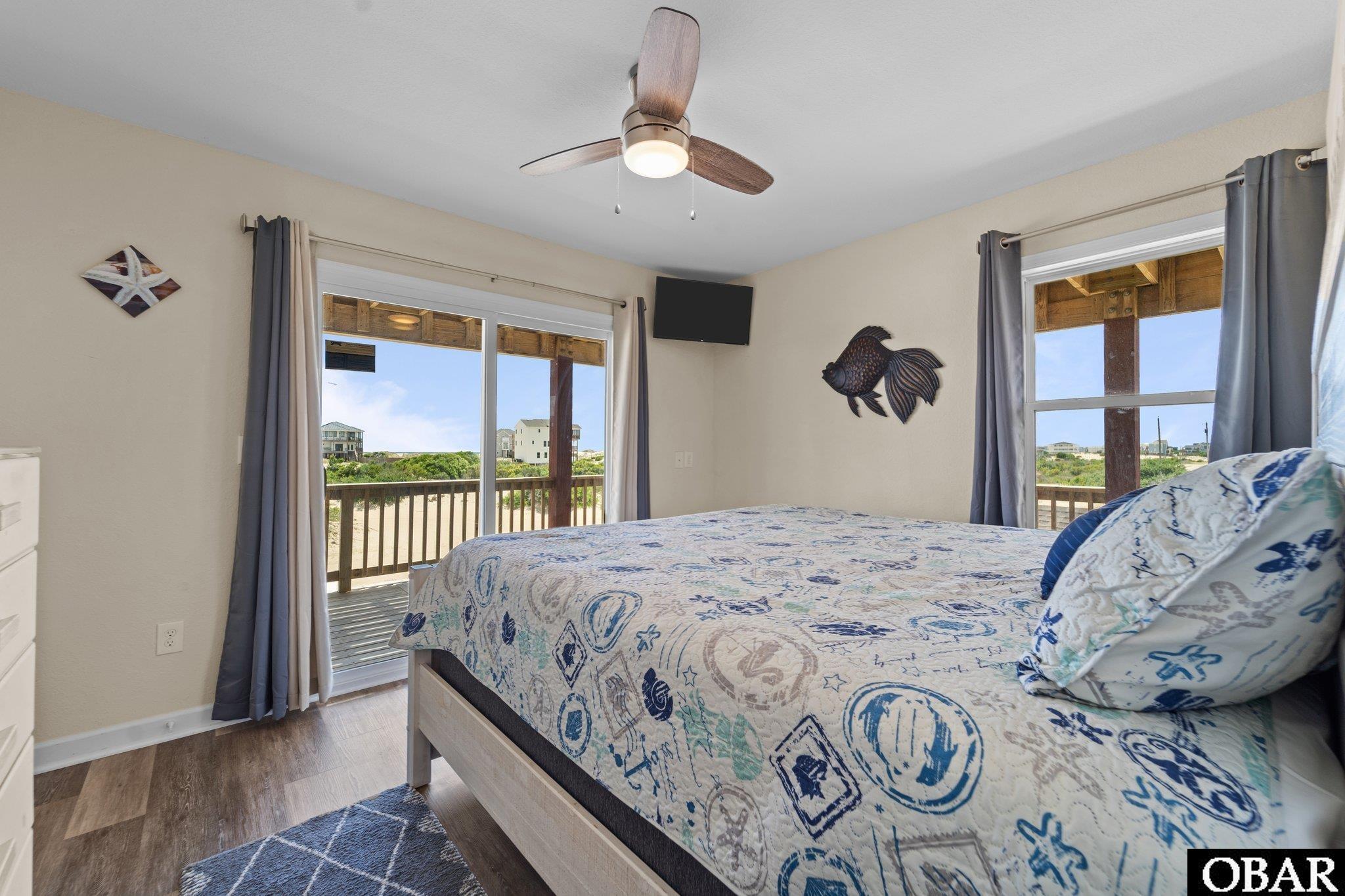 Welcome to Nauti Pelican, a charming and spacious beach retreat located approximately 3.3 miles up the 4WD-access-only beaches of the Outer Banks. Designed with coastal comfort and family fun in mind, this light-filled home boasts stunning ocean views, with expansive decks perfect for morning coffee, sunbathing, or stargazing. The top-level features a bright and open great room, a fully equipped kitchen with new appliances, a dining area, and a queen primary suite with a bath and shower/tub combo. The second level offers three additional bedrooms: a king suite with a private bathroom and deck access, a queen bedroom, and a bunk room with a duo bunk and a twin—ideal for kids. A full hall bath with a shower/tub combo serves the queen and bunk rooms. On the ground level, guests will enjoy a rec room with a pool table and an additional den with two daybeds, perfect for lounging or overflow sleeping. This home is equipped as a smart home, featuring WiFi-enabled Alexa voice control, EcoBee thermostats, and other smart features to enhance comfort and convenience. Recent upgrades include new flooring, new decking, and a TPO (thermoplastic polyolefin) roof on the screened porch, ensuring durability and style. After a day of tailgating on the beach or exploring the coast, unwind in the private hot tub and take in the ocean breeze. Decorated with whimsical nautical touches throughout, Nauti Pelican offers everything you need for an unforgettable Outer Banks getaway.