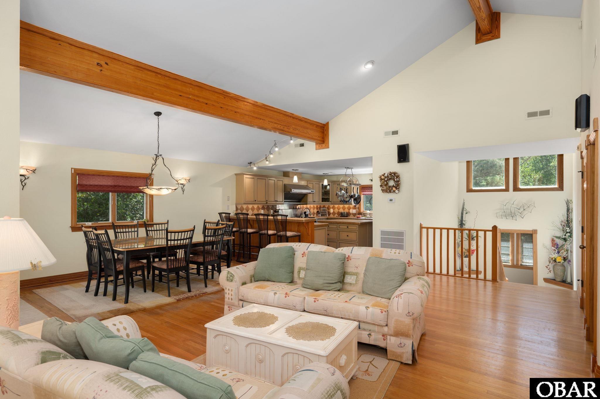 This 4-bedroom, 3.5-bath home in the sought-after Southern Shores community offers over 3,600 sqft across three levels. Set on a wooded 20,000+ sqft homesite, the home features a reverse, open floor plan with an elevator. Beamed cathedral ceilings, a thoughtfully designed chef’s kitchen, a substantial mid-level den, and a dedicated game room define the interior. Expansive decking creates multiple outdoor living areas for dining, gathering, or relaxing, with a hot tub for outdoor enjoyment. A garden shed provides space for tools, beach gear, or gardening equipment. Turnkey, the home reflects clear pride of ownership, with quality design and construction and a layout well suited to the coastal lifestyle.