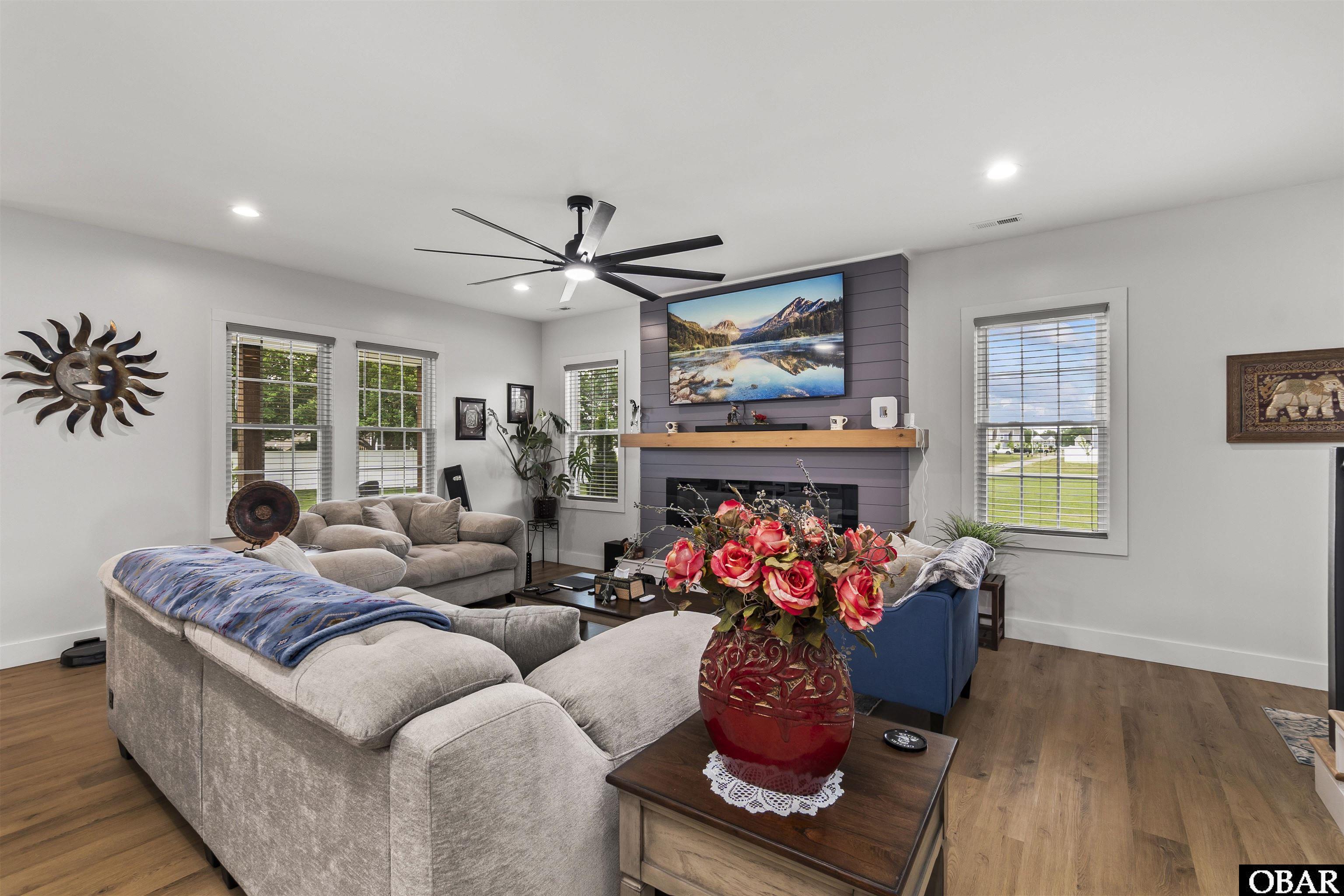 Better than new construction! Beautifully maintained 4-bedroom, 2.5-bath home offering modern upgrades, smart home features, and exceptional functionality throughout. This thoughtfully designed property includes a first-floor primary suite with dual vanities, water closet w/barn door, and a walk-in tiled primary shower. There is a convenient first-floor laundry room and soft close cabinets & drawers in kitchen & all bathrooms. The interior showcases durable LVP flooring, LED lighting with dimmer switches, and an inviting electric fireplace. The kitchen is a standout with an oversized island with sink, quartz countertops, soft-close cabinetry, and high-end Samsung appliances--including a microwave with air fryer, ultra-quiet dishwasher, and a convertible drawer refrigerator/freezer. Enjoy added comfort and efficiency with a tankless natural gas water heater, whole-house surge protector, whole house water filtration & water softener system, and a Generac whole-house generator with automatic transfer switch. Smart home capabilities include security, and appliance controls, along with a SimpliSafe and Ring system ready for expansion. Outdoor features include a covered patio, beautifully landscaped yard, irrigation for the garden area, and a 14x20 shed. The extended driveway offers reinforced 6-inch concrete--ideal for RV or additional vehicle parking--and includes a 30-amp hookup. Additional highlights include a garage refrigerator/freezer that conveys, regular HVAC maintenance, pest inspections every 90 days, Termite inspection yearly, and a remaining 7-year structural warranty. The property is in close proximity to the Coast Guard base, university, shopping & restaurants. Come see this beautiful property before it is gone!
