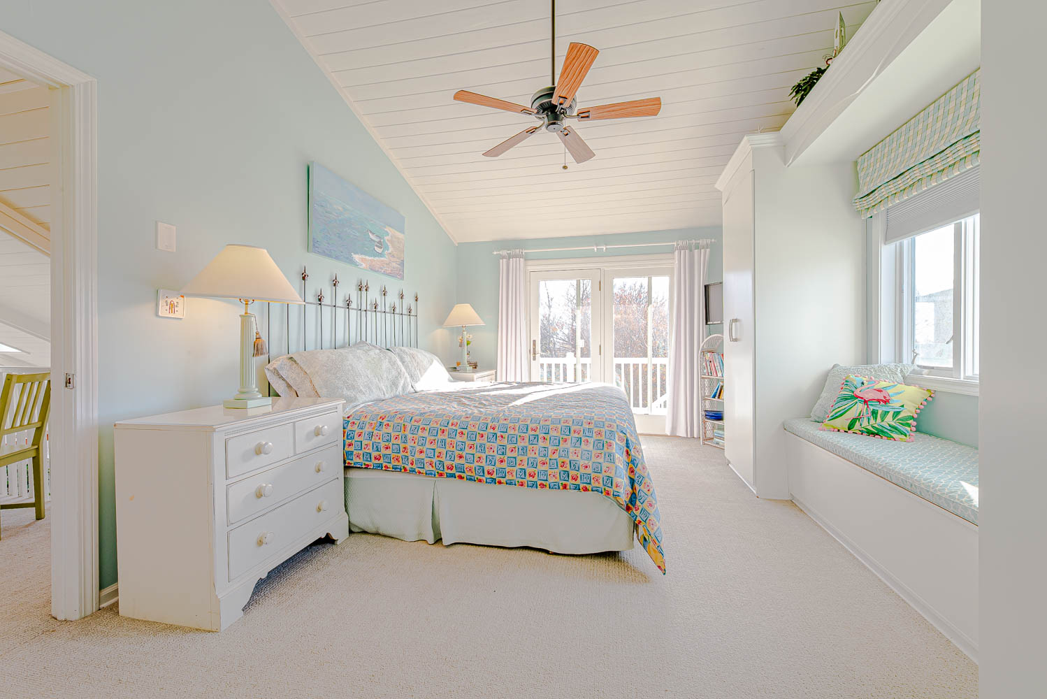 Top Level: Private Suite w/King, TV, Full Bath w/Walk-In Shower, Private Deck w/Sound Views; and Sitting Area, Queen Sleep Sofa, and Table and Chairs.