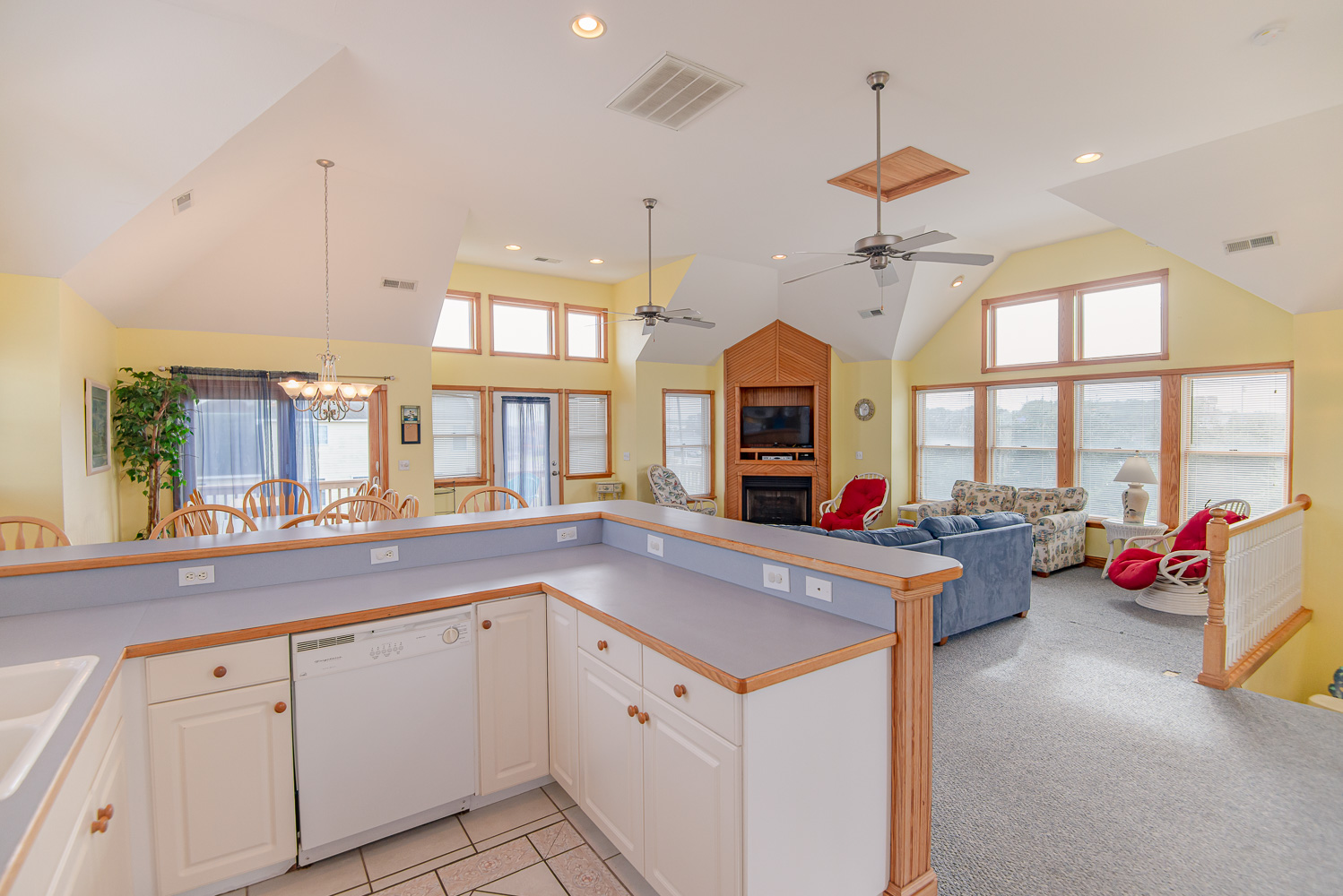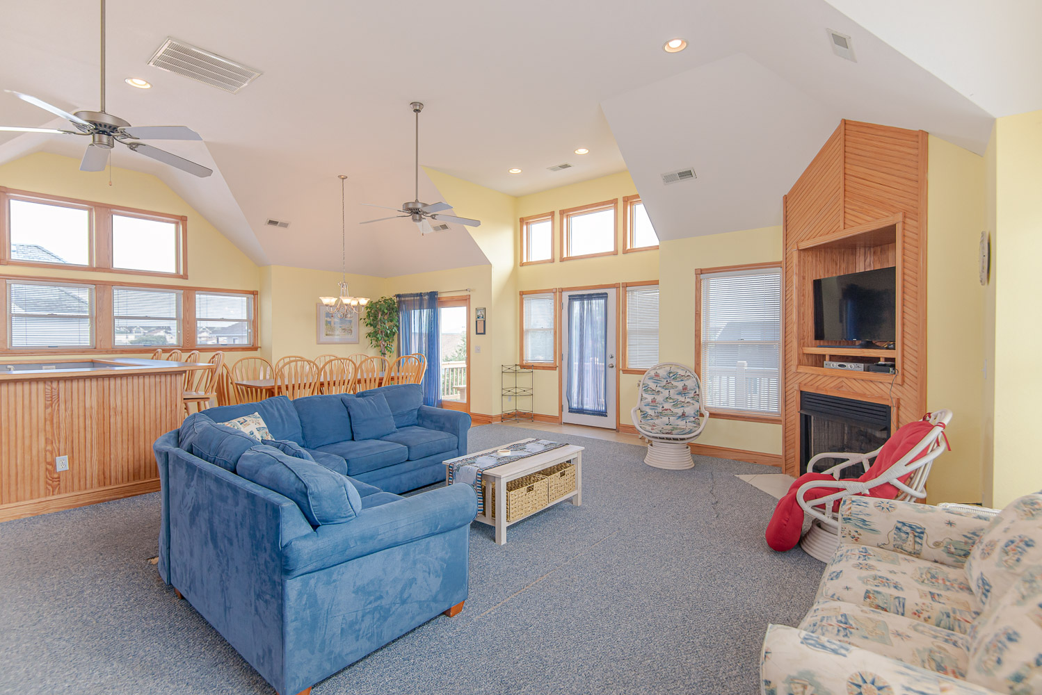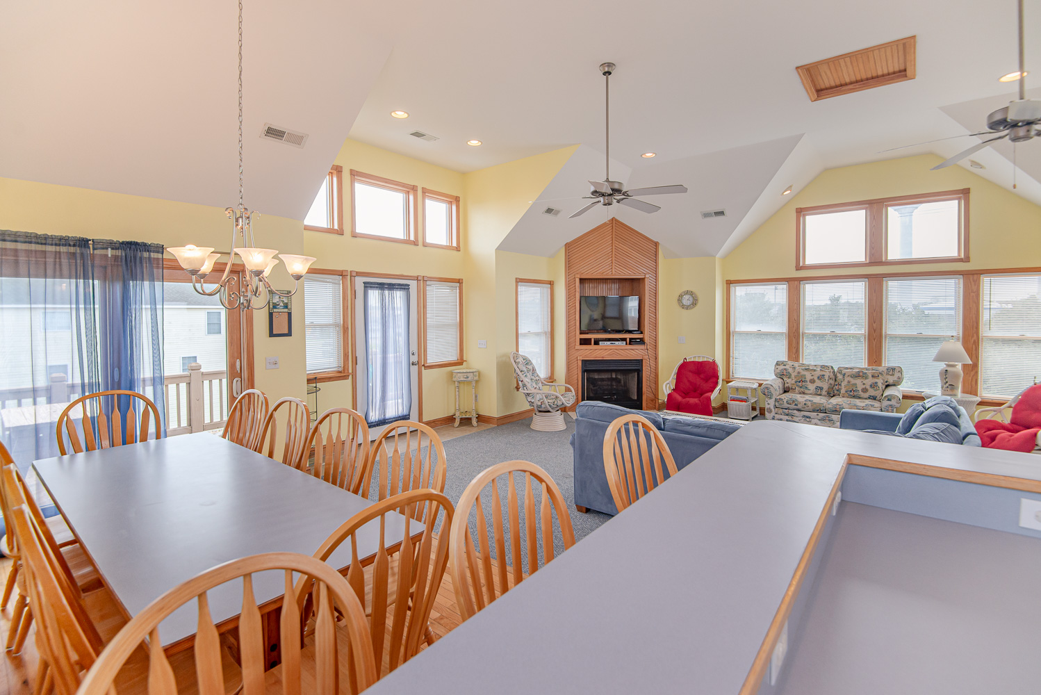 Top Level: Spacious Living Area, 42 Inch Flat Screen TV, Cathedral Ceilings, Ceiling Fan, Access to Back Sun Deck Overlooking Pool Area w/Deck Furniture, Dining Area w/Seating for Ten (10), Well Equipped Kitchen w/Bar Seating for Four (4), and Access to Front Sun Deck w/Deck Furniture.
