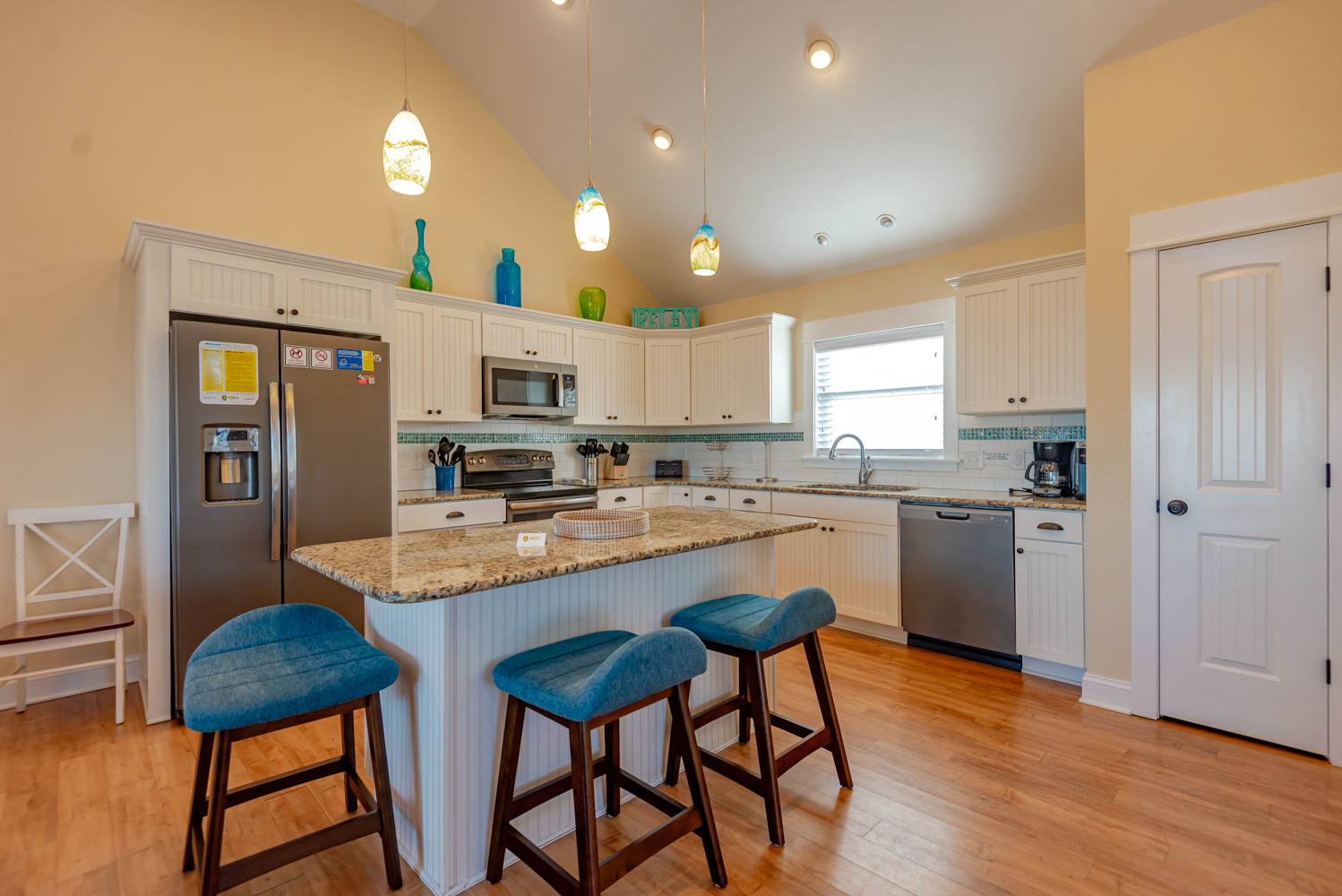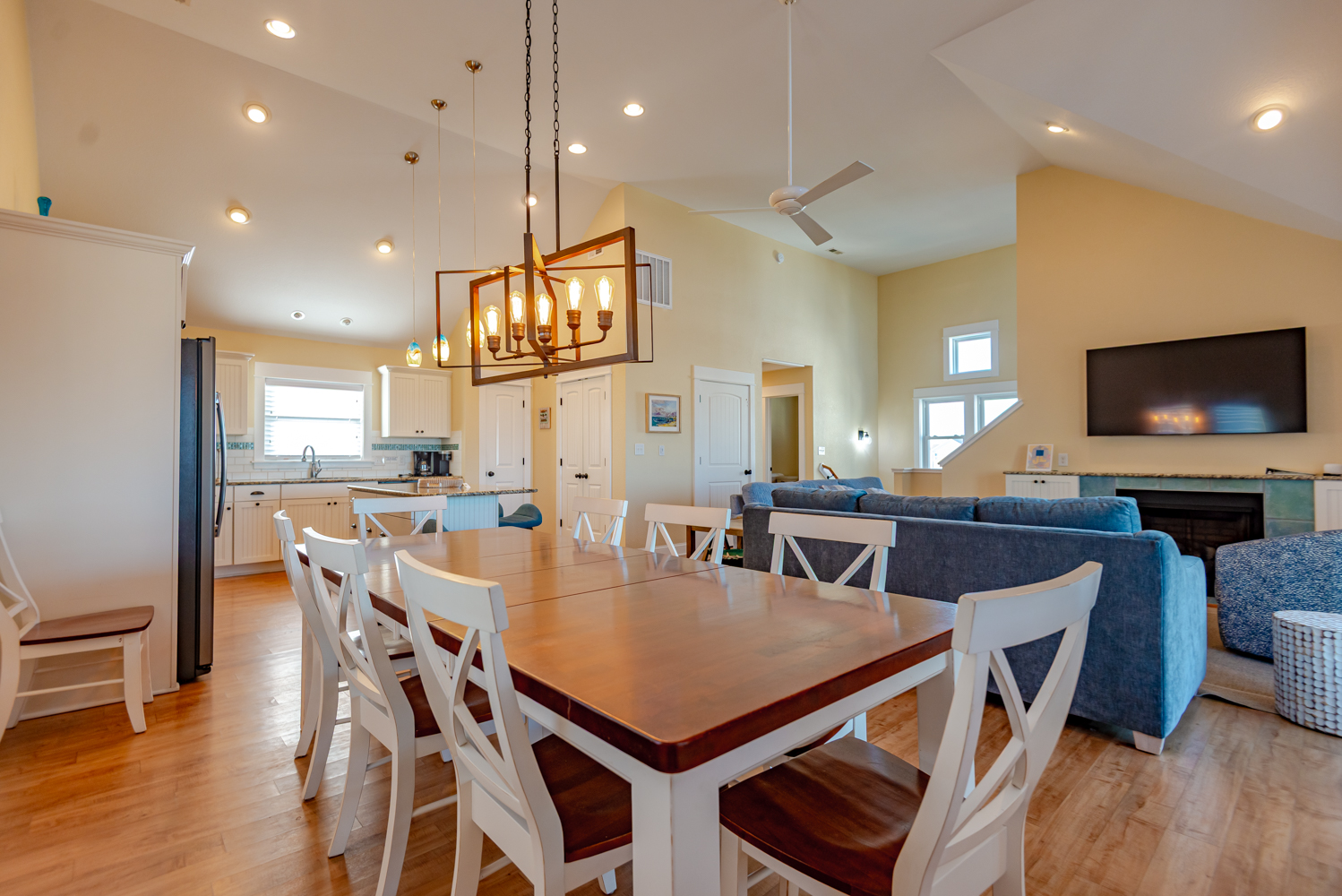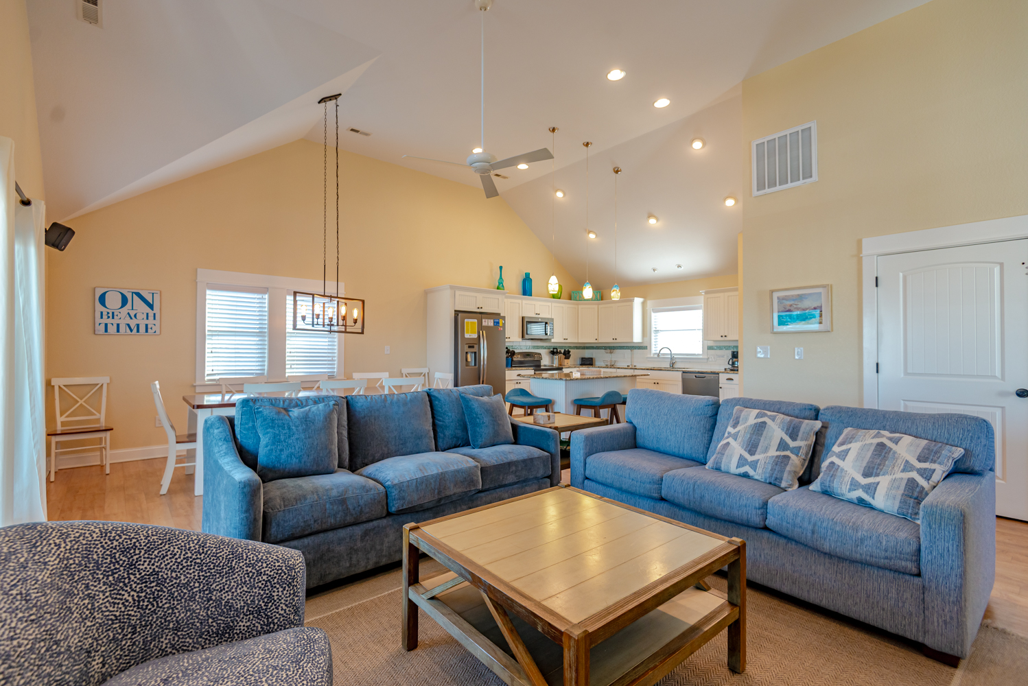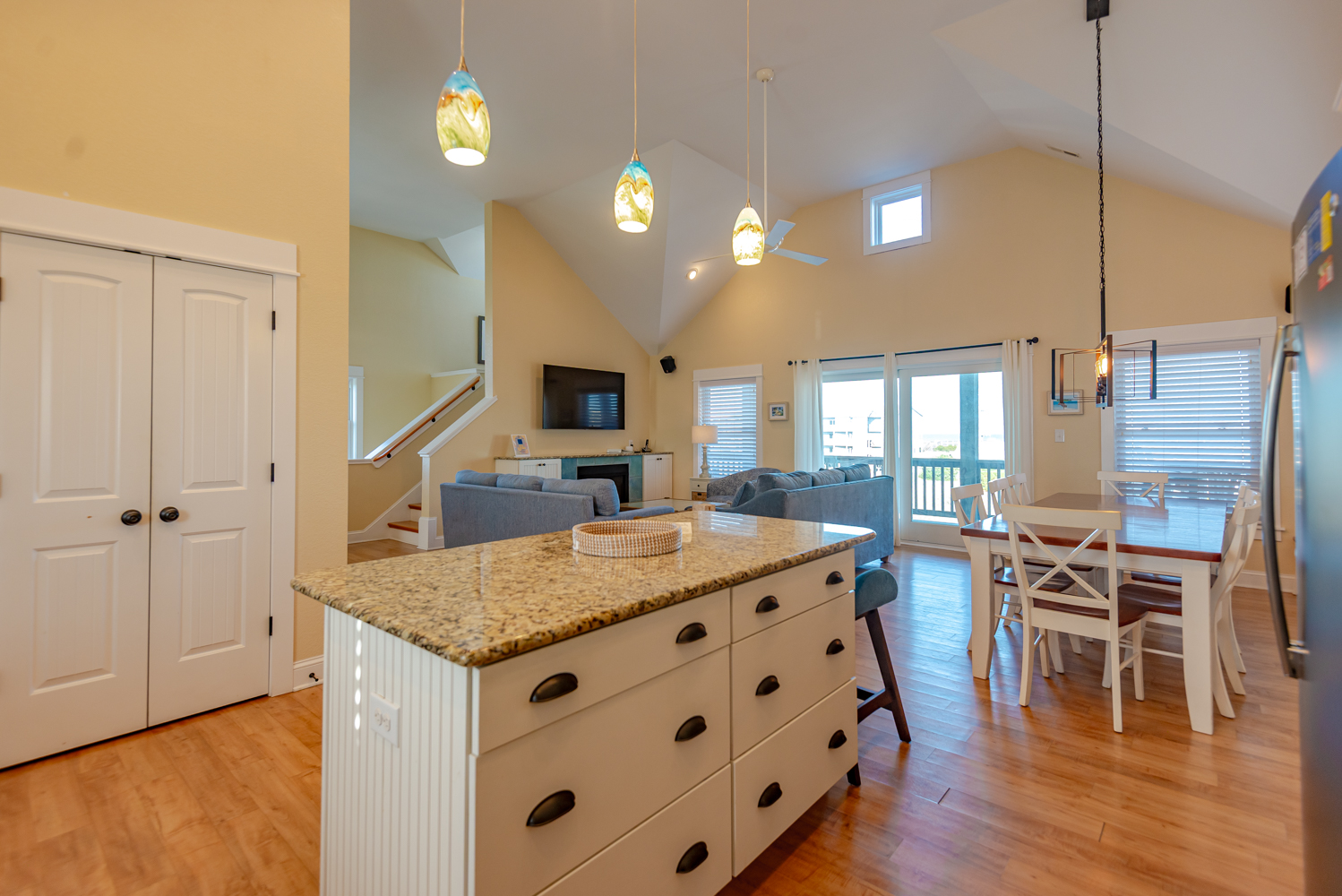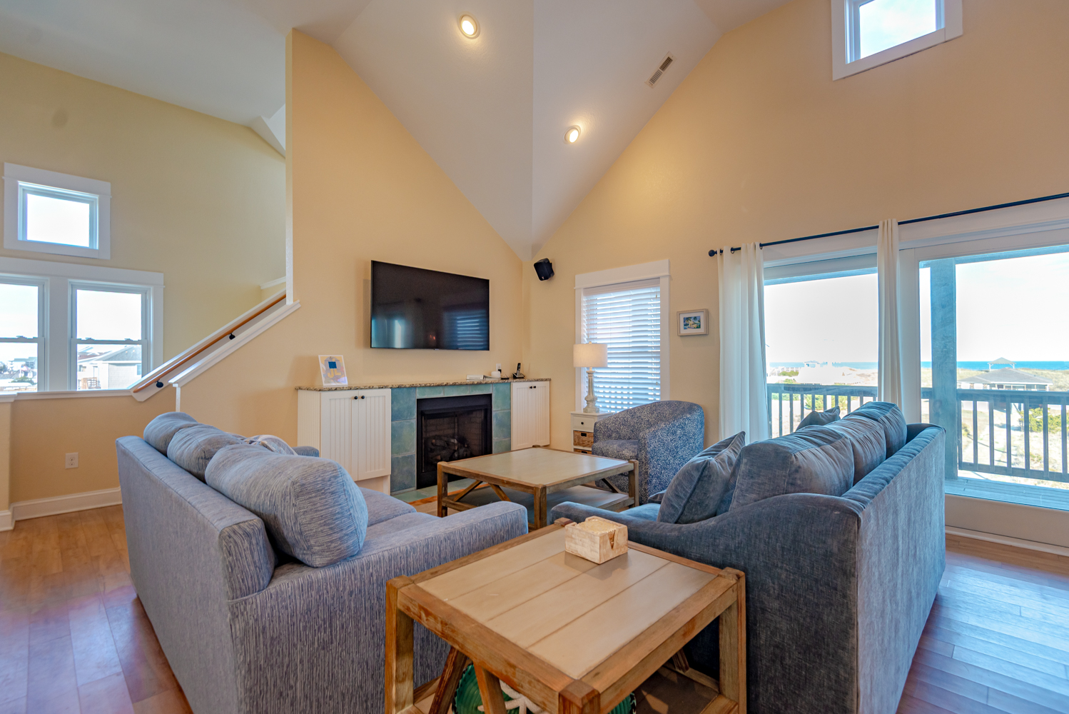 Top Level: Living Area w/55 Inch Flat Screen HDTV & new Couch & Chairs, Ocean Views, Gas Fireplace; Half Bath, Kitchen Area w/Stainless Steel Appliances, Island Bar w/Seating for Four (4); Dining Area w/Seating for Ten (10); Steps to Ship’s Watch w/Game Table, Chairs; Private Suite w/King, 36 Inch Flat Screen TV, Full Bath w/Walk-In Shower; Covered Deck w/Deck Furniture, Sun Deck w/Deck Furniture, Horizon Ocean Views.