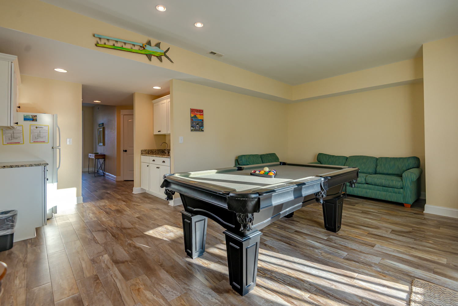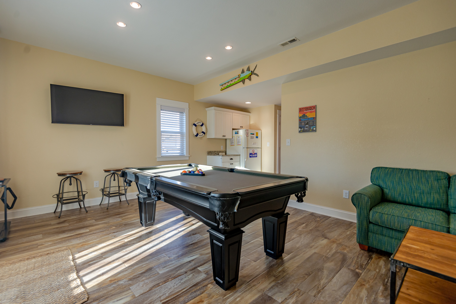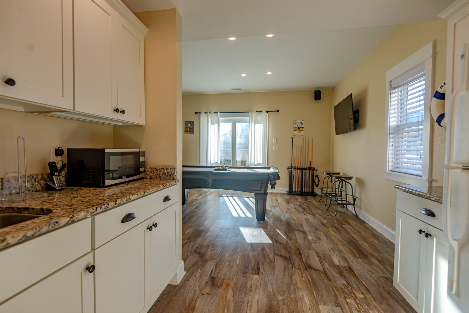 First Level: Rec. Room w/Pool Table, Elevator, 55 Inch Flat Screen TV, Wet Bar, Full Size Refrigerator, Microwave, Sitting Area, Bedroom w/Duo Bunk, 36 Inch Flat Screen TV, Full Bath w/Tub/Shower), Laundry Area, & Access to Pool Patio Area.