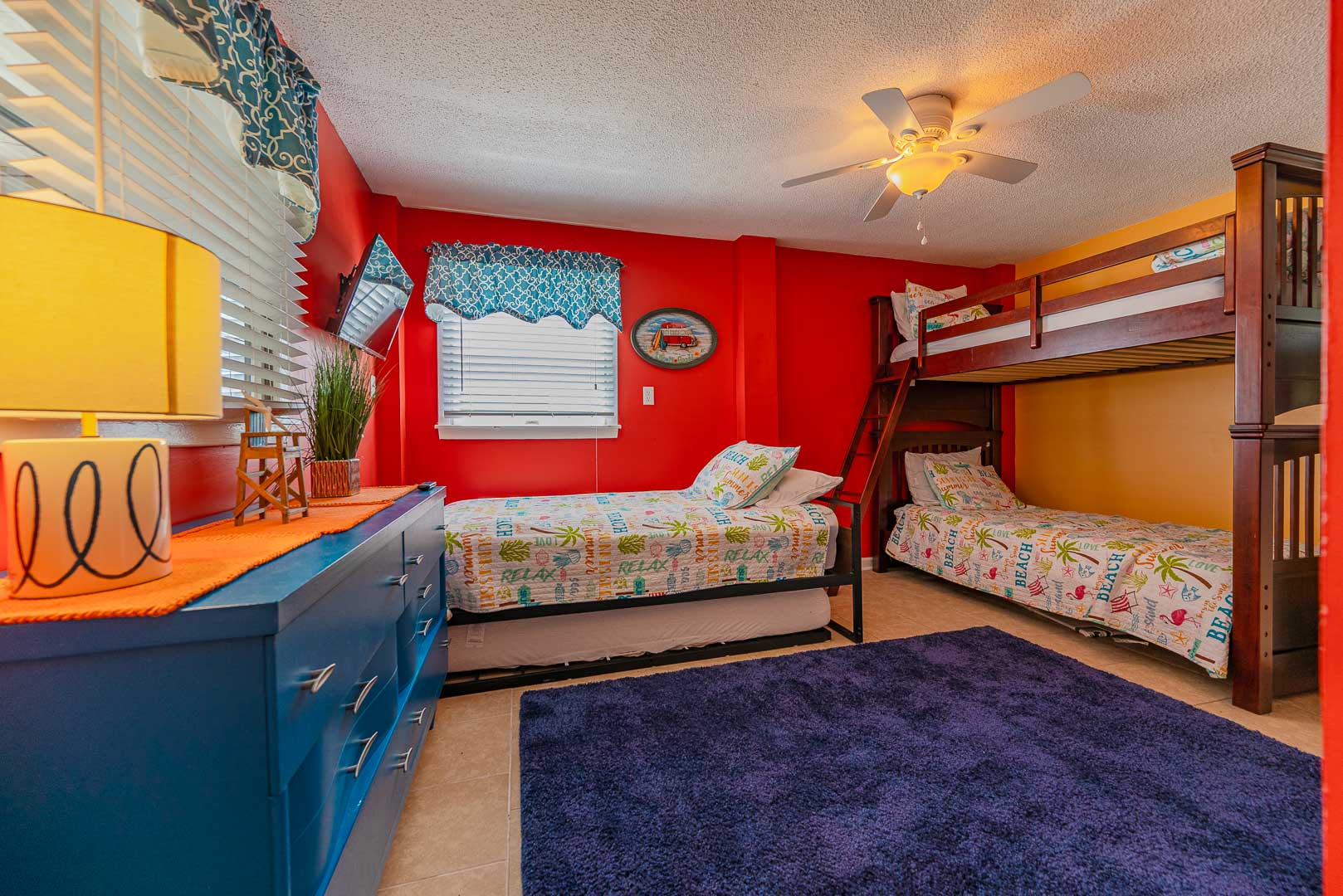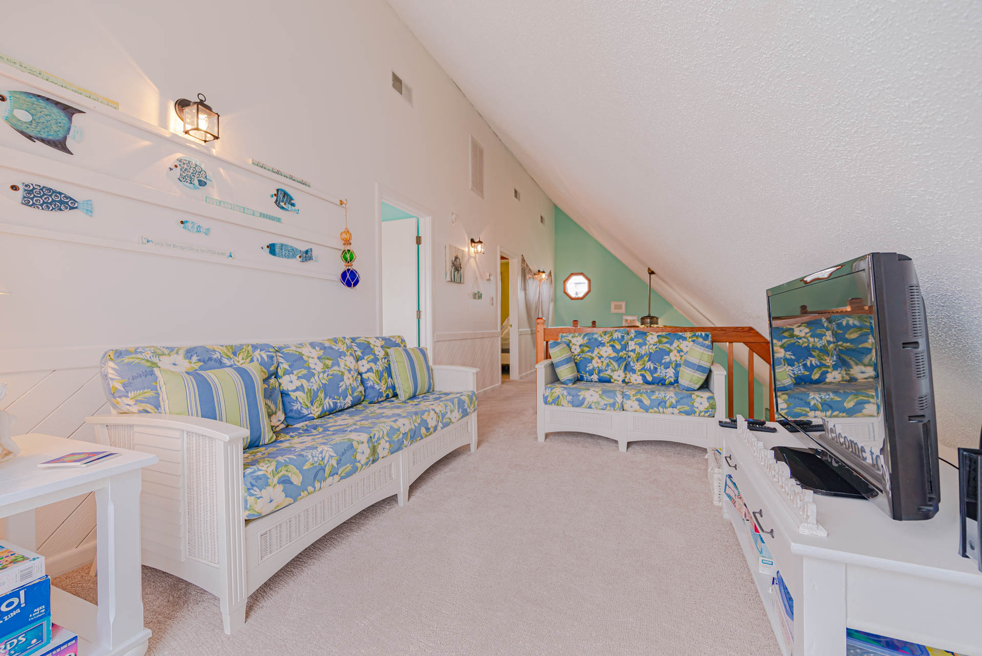 Top Level: Loft Sitting Area, TV, 2 Bedrooms (1 w/Queen, TV, Private Sun Deck; 1 w/Queen), and Jack-n-Jill Full Bath.