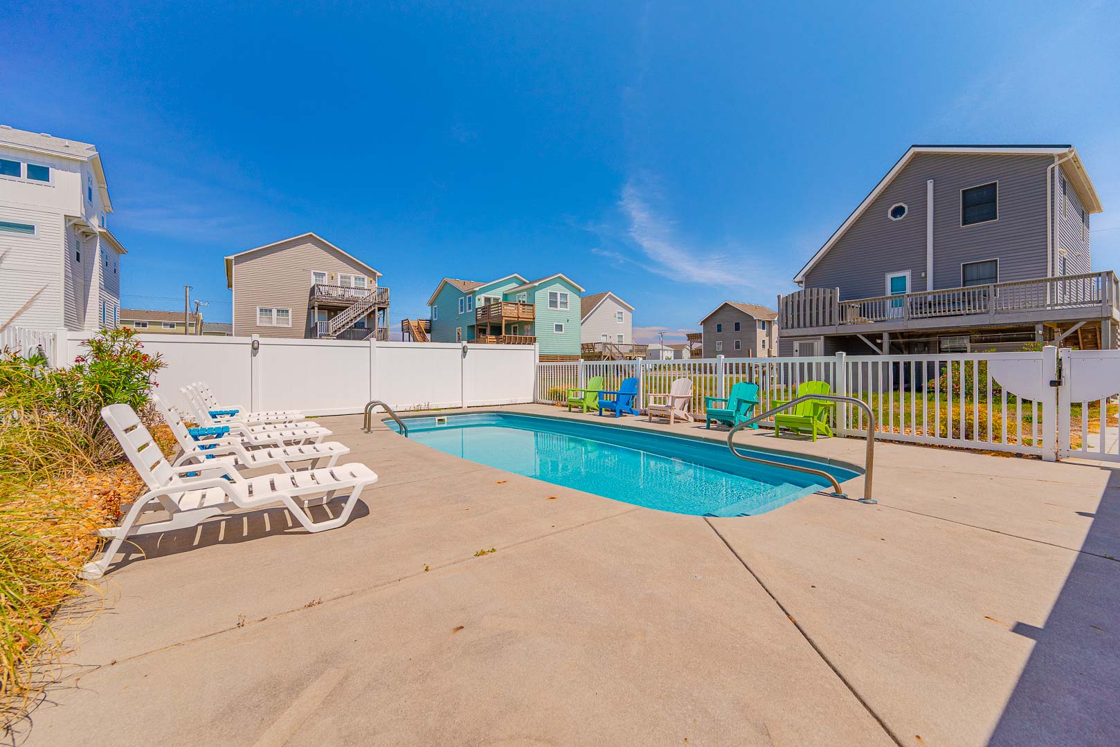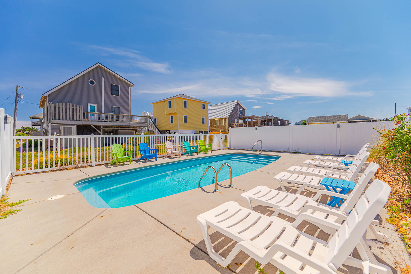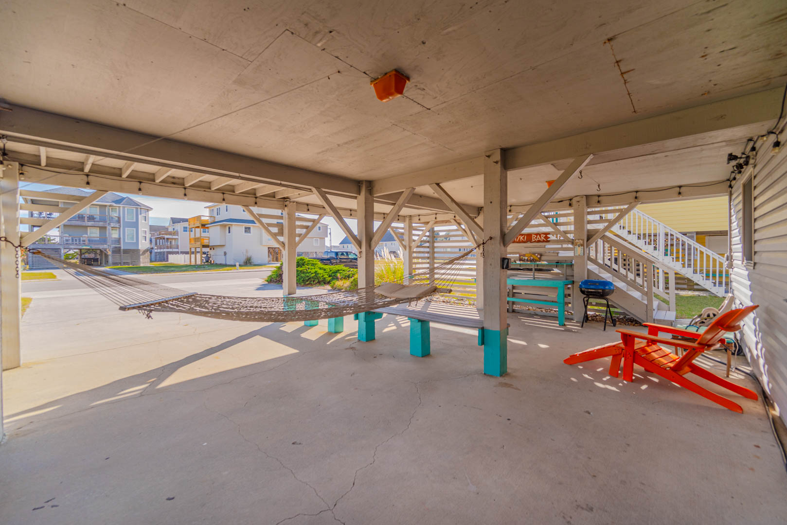 Ground Level: Parking for 4 Cars, Sitting Area, Covered Entry, Laundry Room, Refrigerator, Bedroom w/1 Bunk Set, and 1 Single w/Trundle, TV, Half Bath, Window AC Unit, Enclosed Outside Shower, and Private Swimming Pool (Open Seasonally), Lounge Chairs, and Pool Deck.