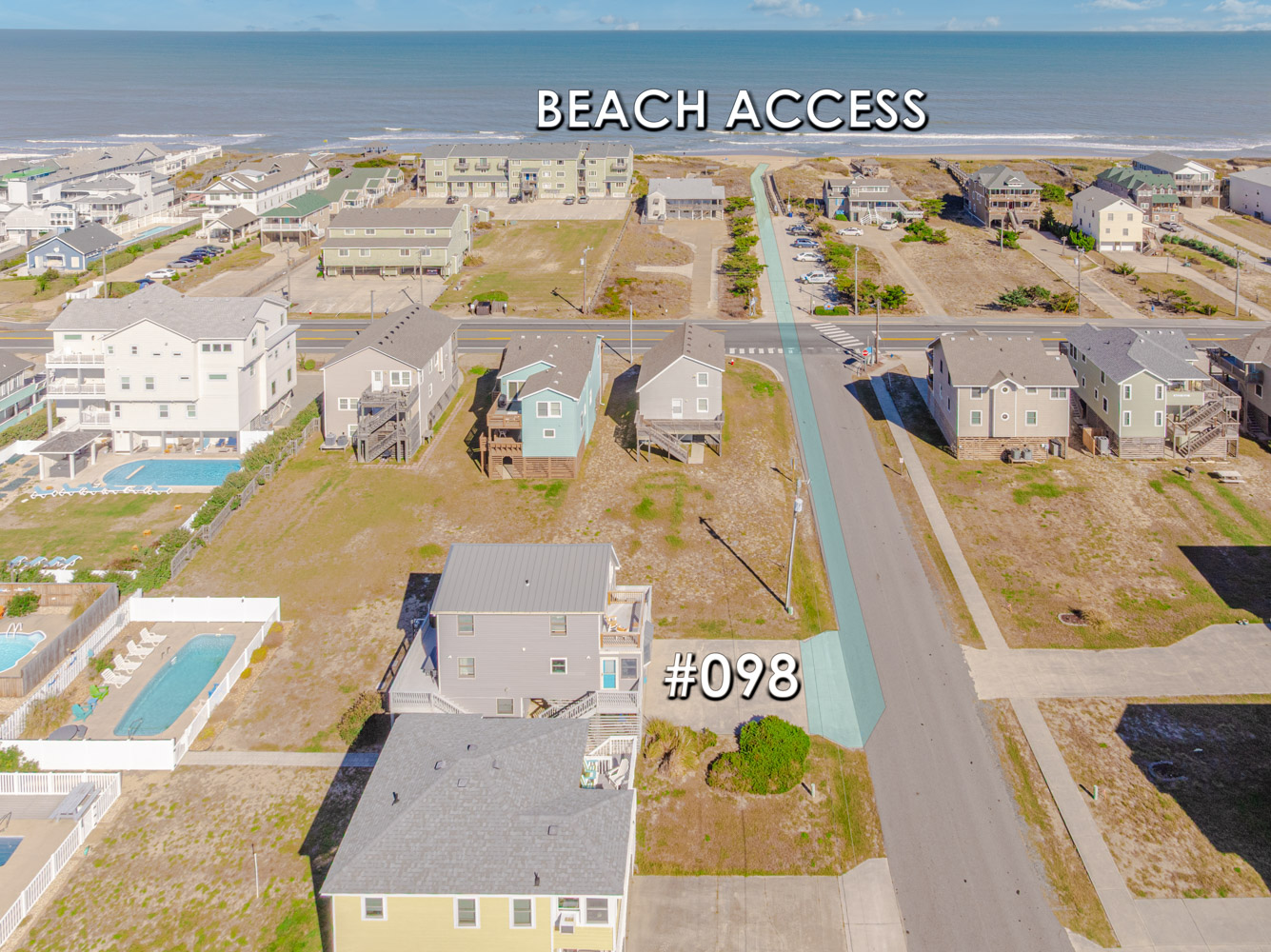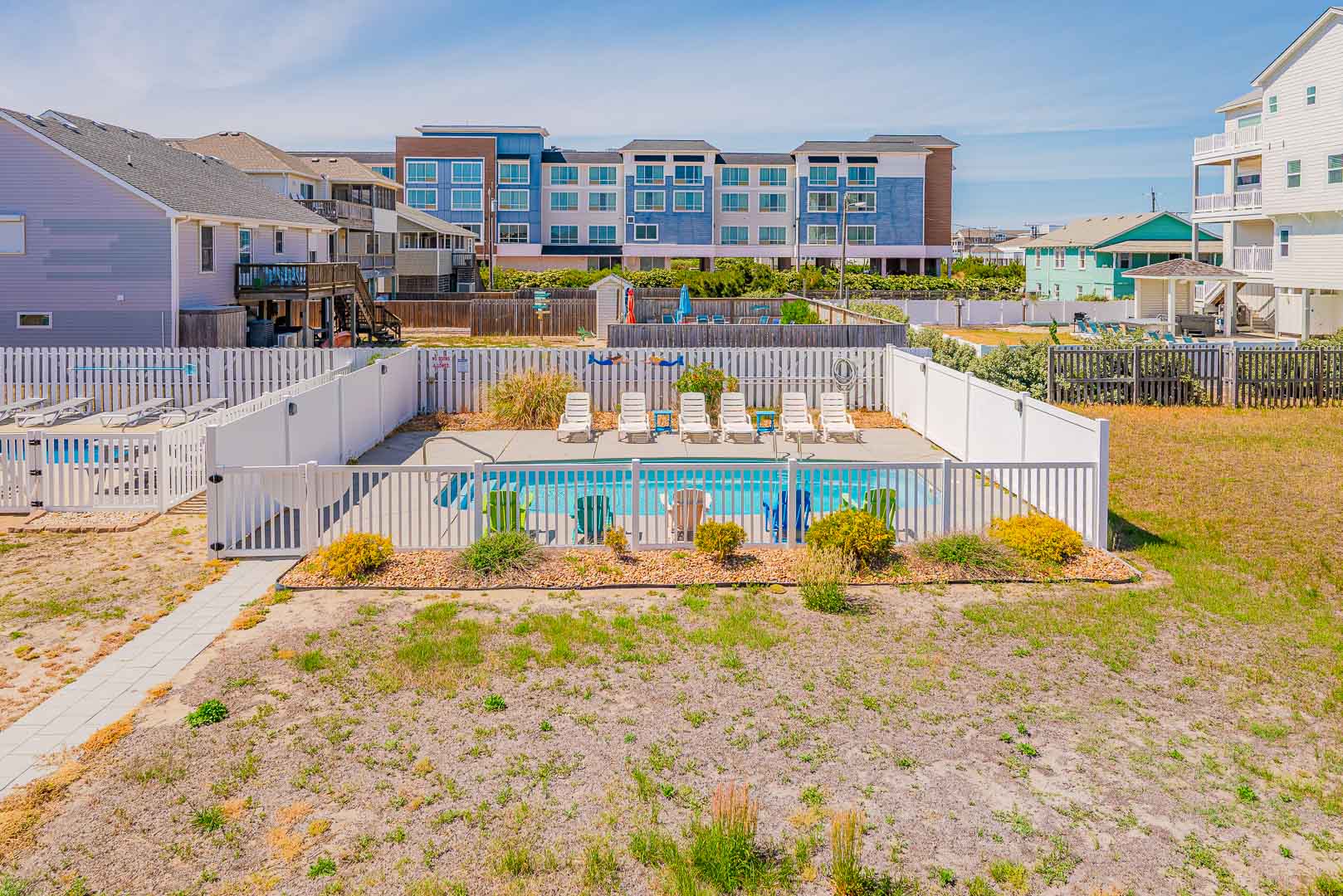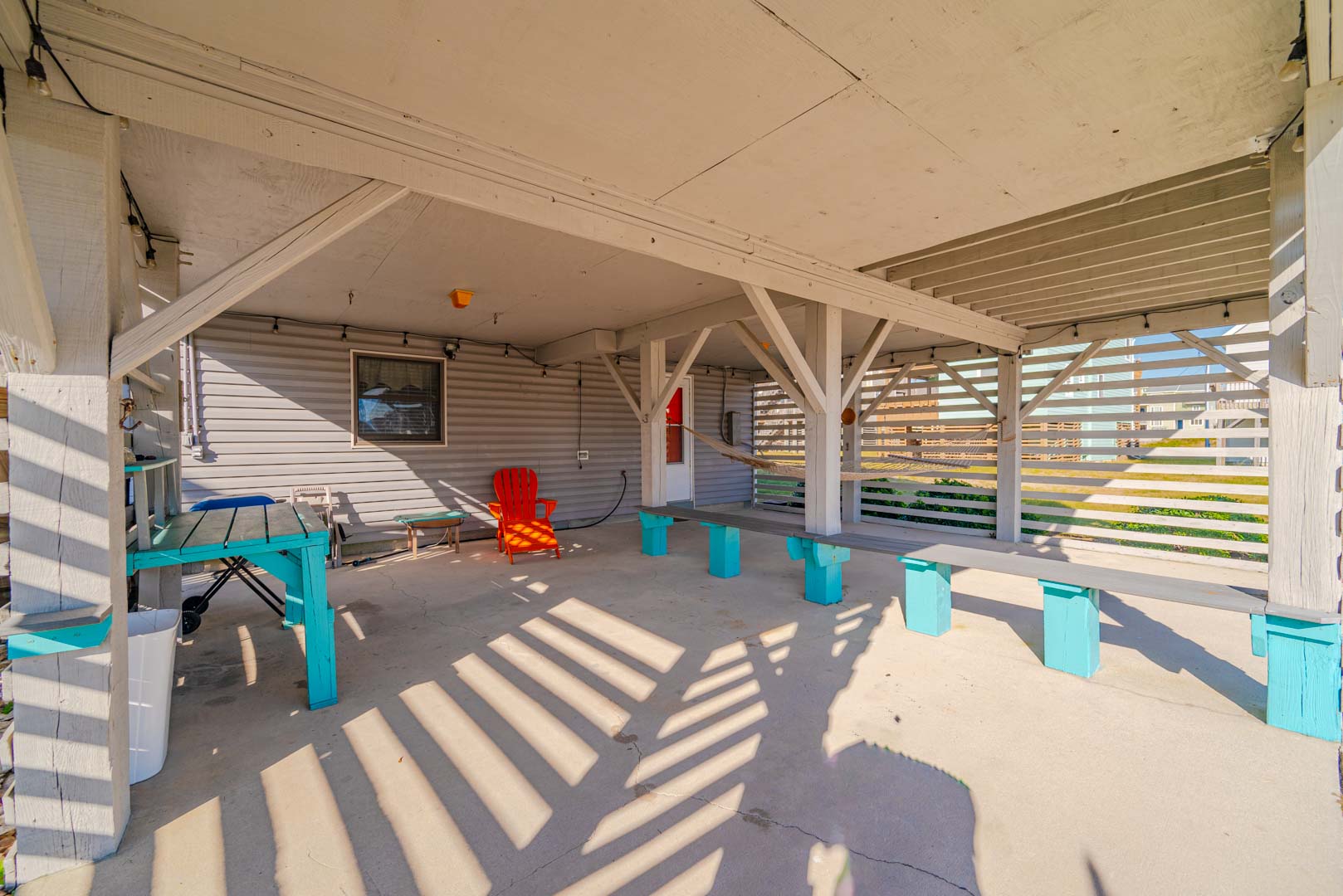 Ground Level: Parking for 4 Cars, Sitting Area, Covered Entry, Laundry Room, Refrigerator, Bedroom w/1 Bunk Set, and 1 Single w/Trundle, TV, Half Bath, Window AC Unit, Enclosed Outside Shower, and Private Swimming Pool (Open Seasonally), Lounge Chairs, and Pool Deck.