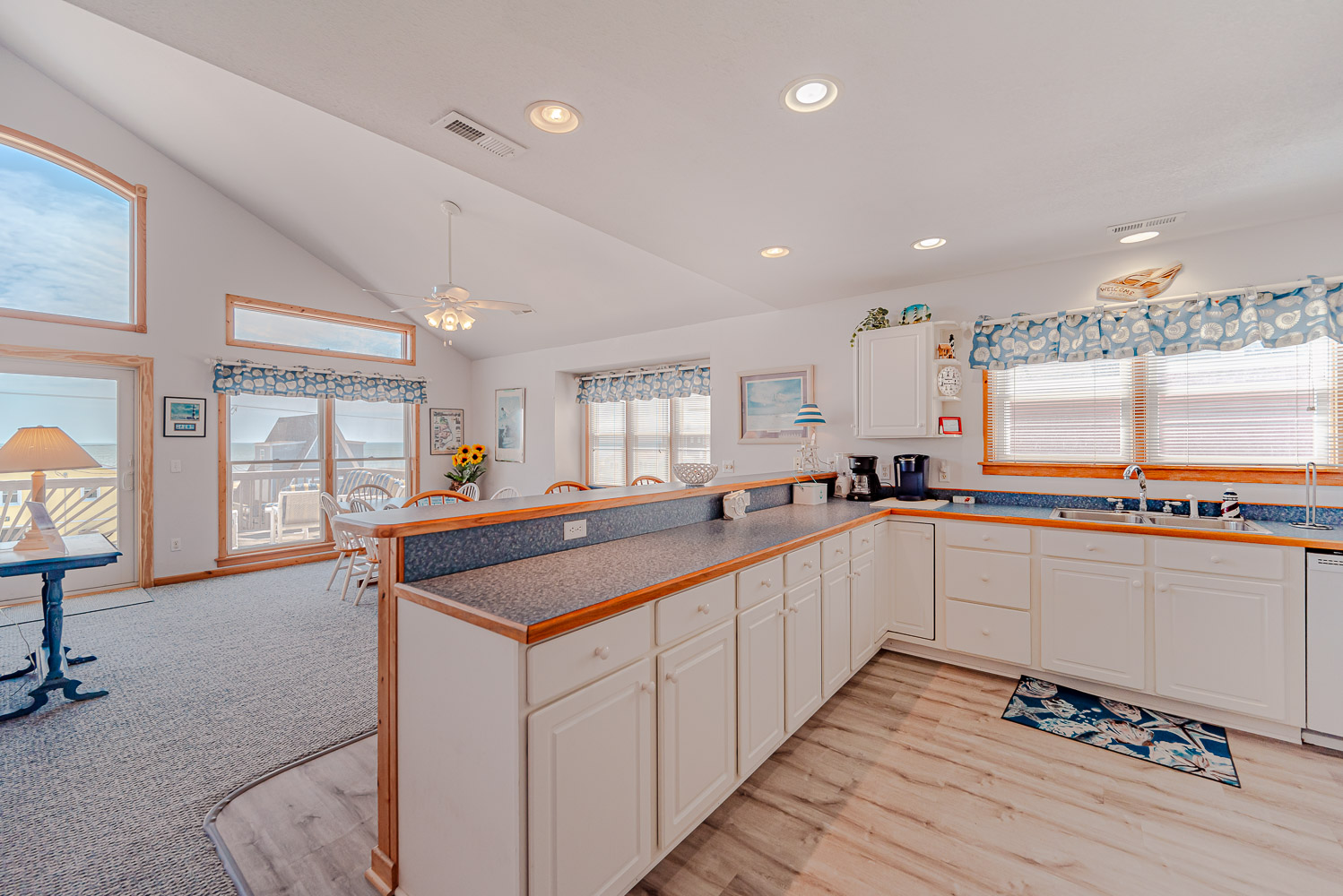 Top Level: Living/Dining/Kitchen Area, 59 Inch TV, Sun Deck w/Deck Furniture and Stunning Ocean Views, and Private Suite w/King, TV, Full Bath w/Tub/Shower.