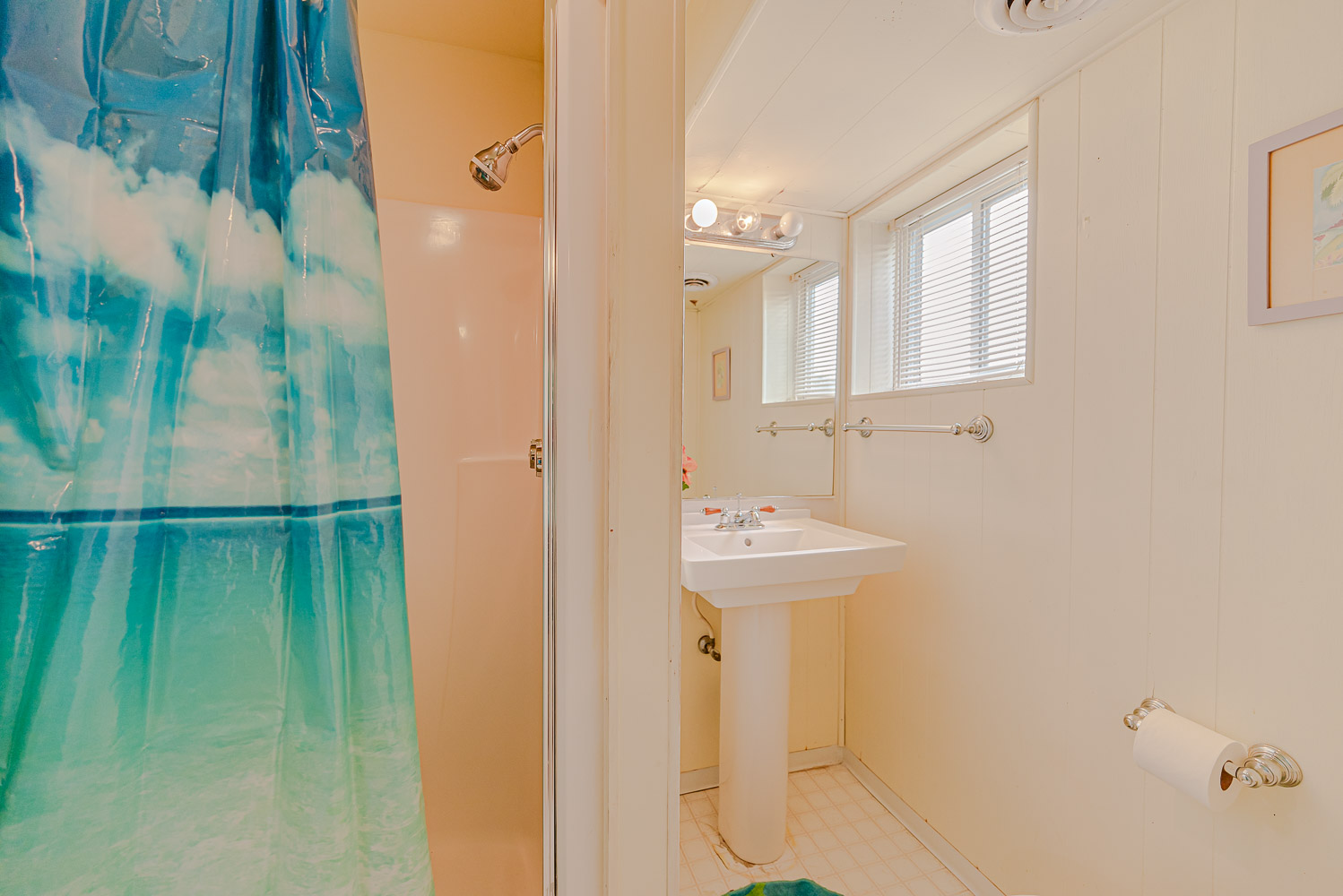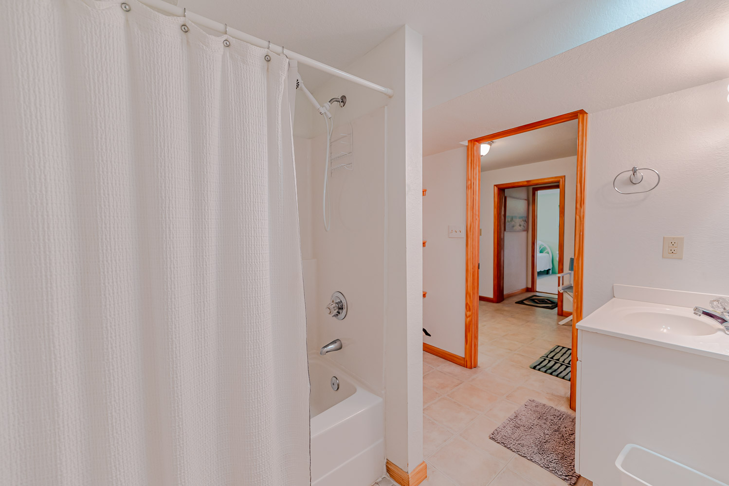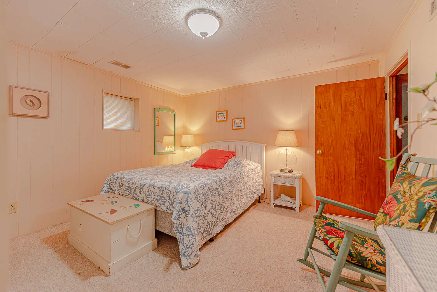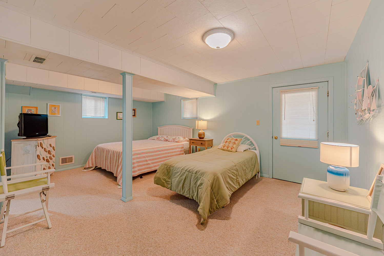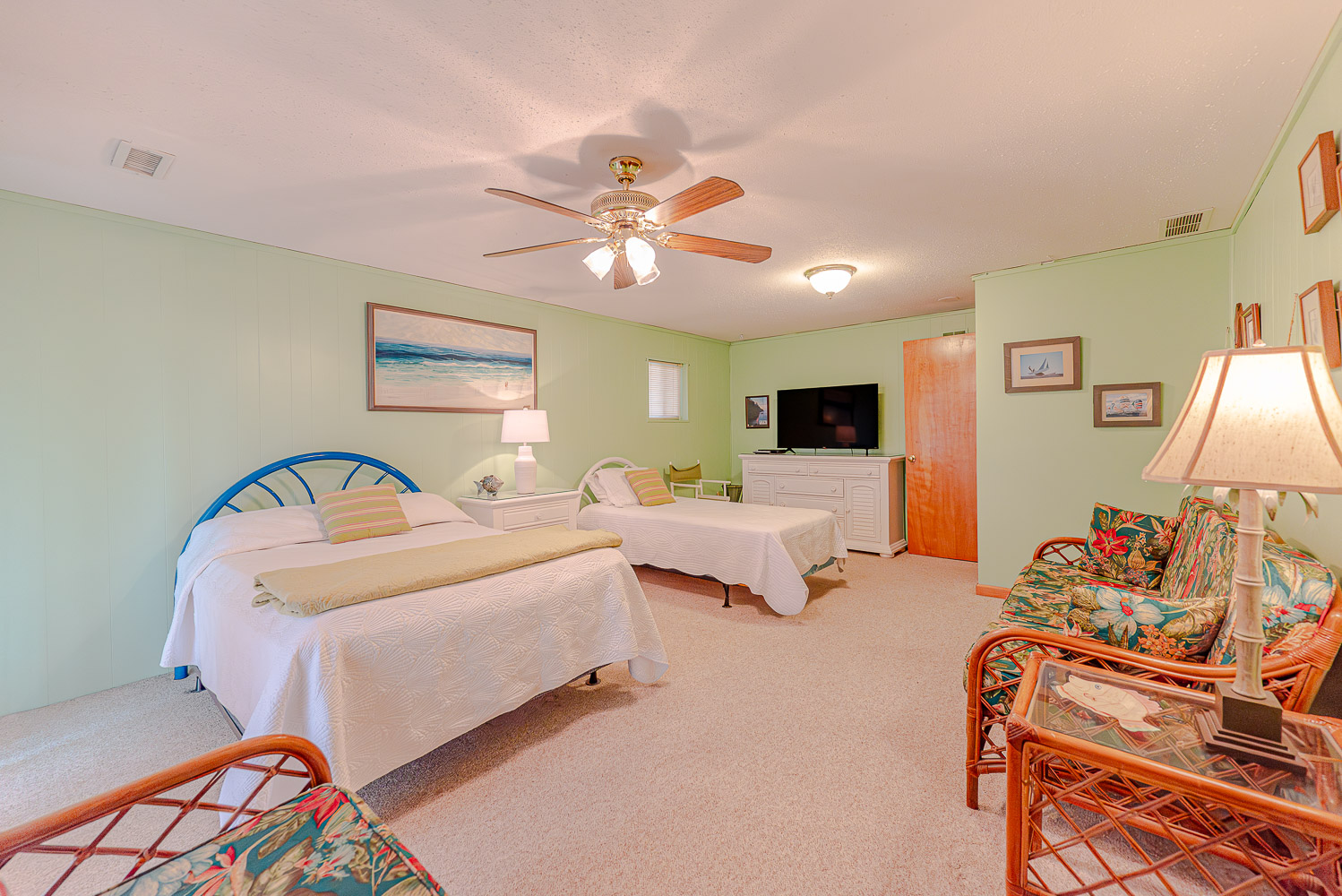 Ground Level: Parking for 6 Cars, Laundry Room, 3 Bedrooms (1 Private Suite w/Queen, Single, TV, Full Bath w/Walk-In Shower; 1 w/Queen; 1 w/Double, Single, TV), Full Hall Bath w/Tub/Shower, Enclosed Outside Shower, and Park Grill.