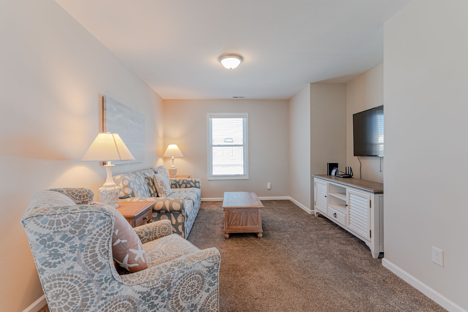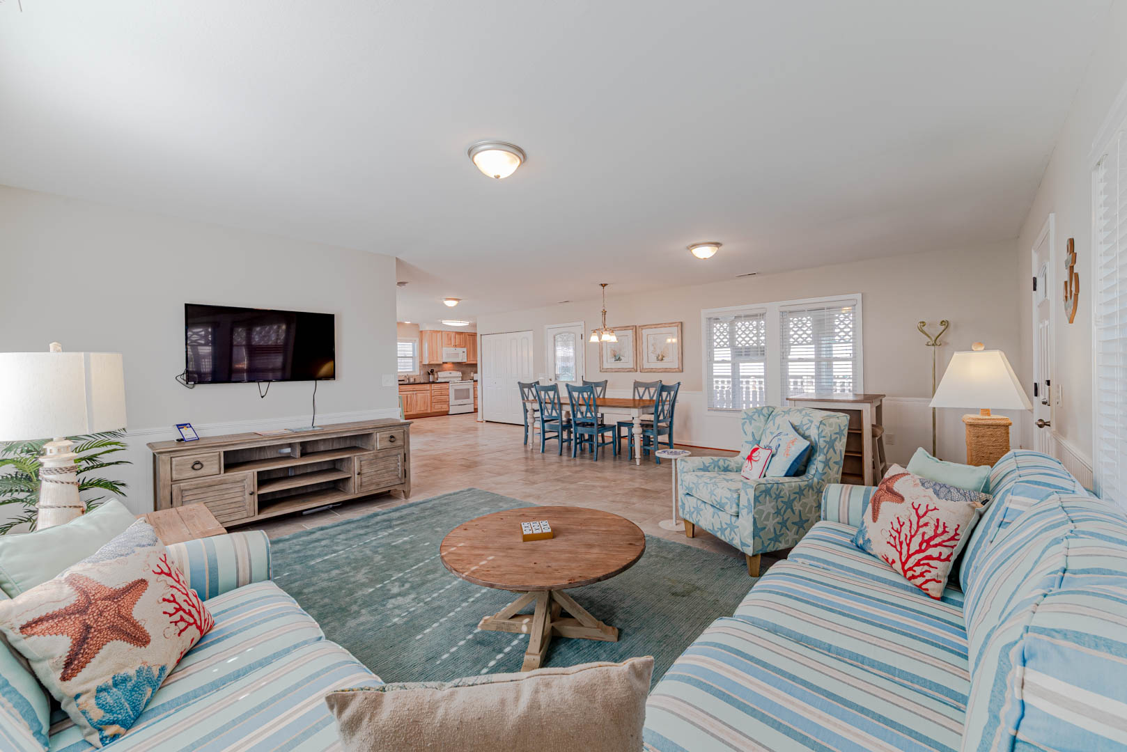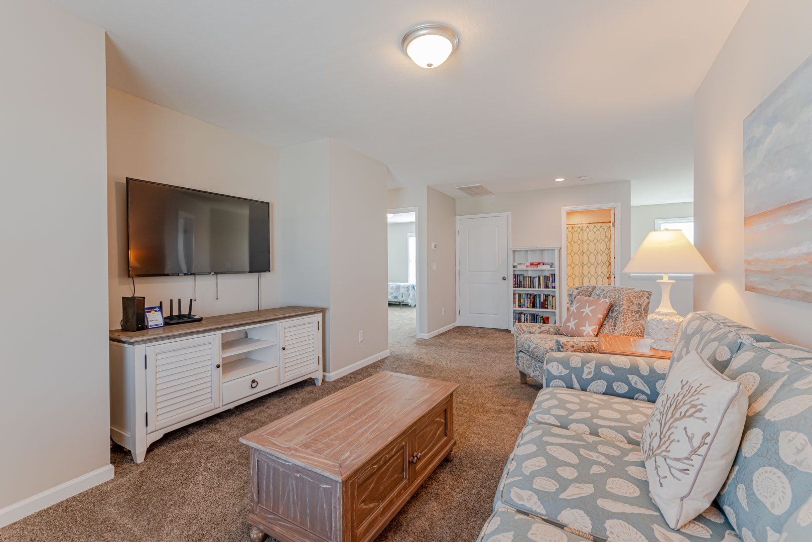 Top Level: Living Area, TV, 3 Bedrooms (Private Suite w/King, TV, Full Bath; 1 w/Queen; 1 w/2 Singles), Full Hall Bath, Access to Covered Deck w/Deck Furniture.