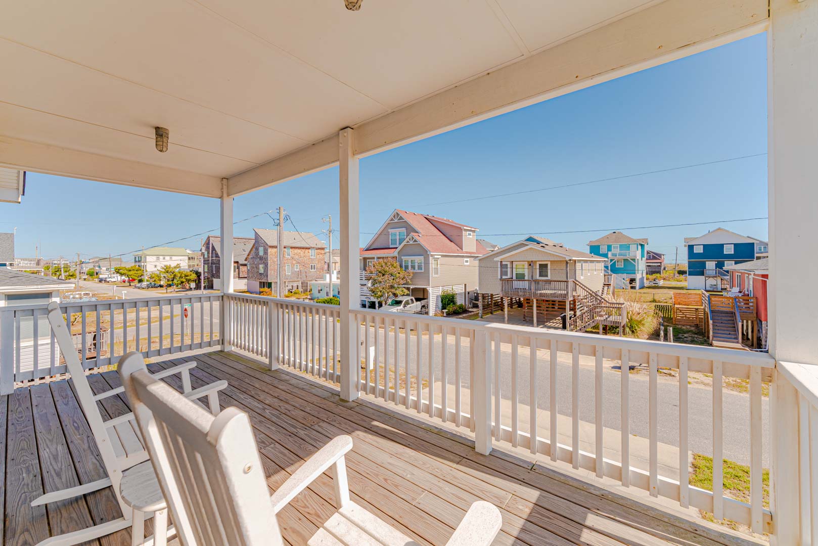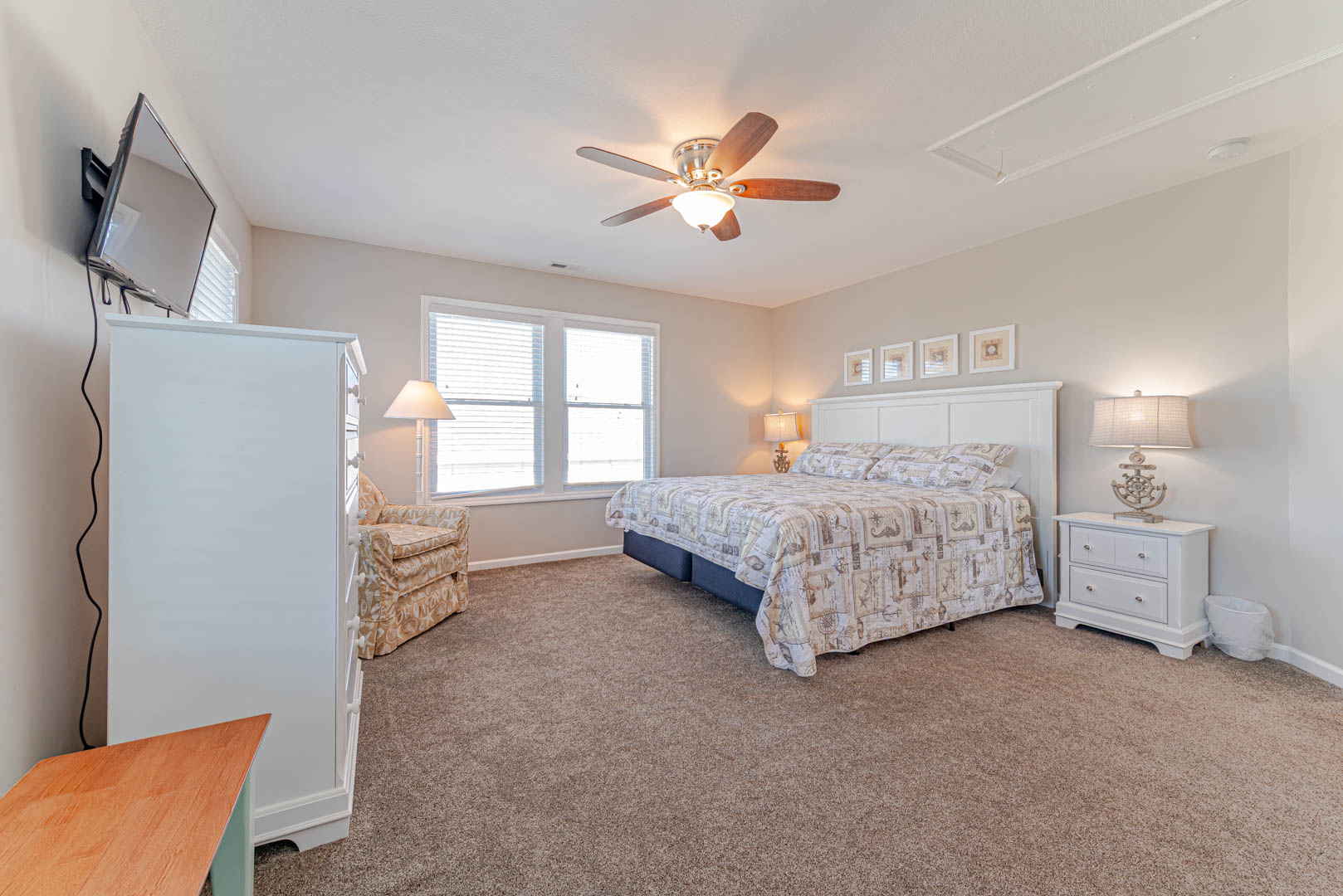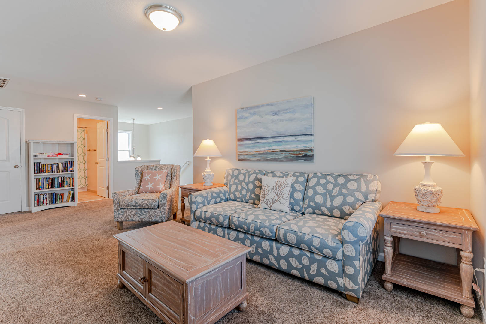 Top Level: Living Area, TV, 3 Bedrooms (Private Suite w/King, TV, Full Bath; 1 w/Queen; 1 w/2 Singles), Full Hall Bath, Access to Covered Deck w/Deck Furniture.