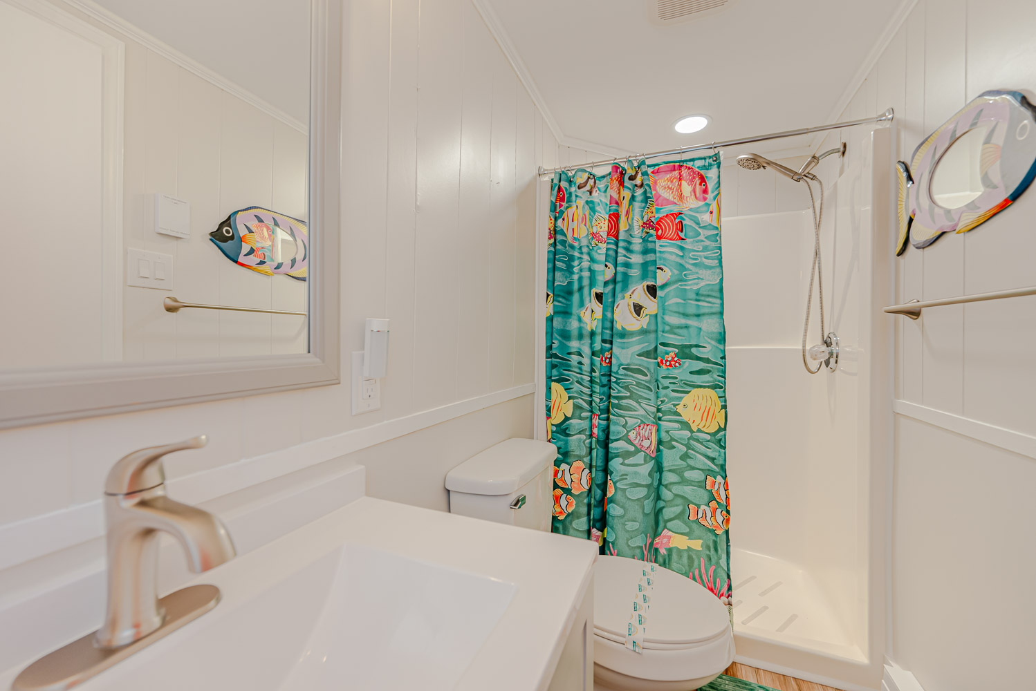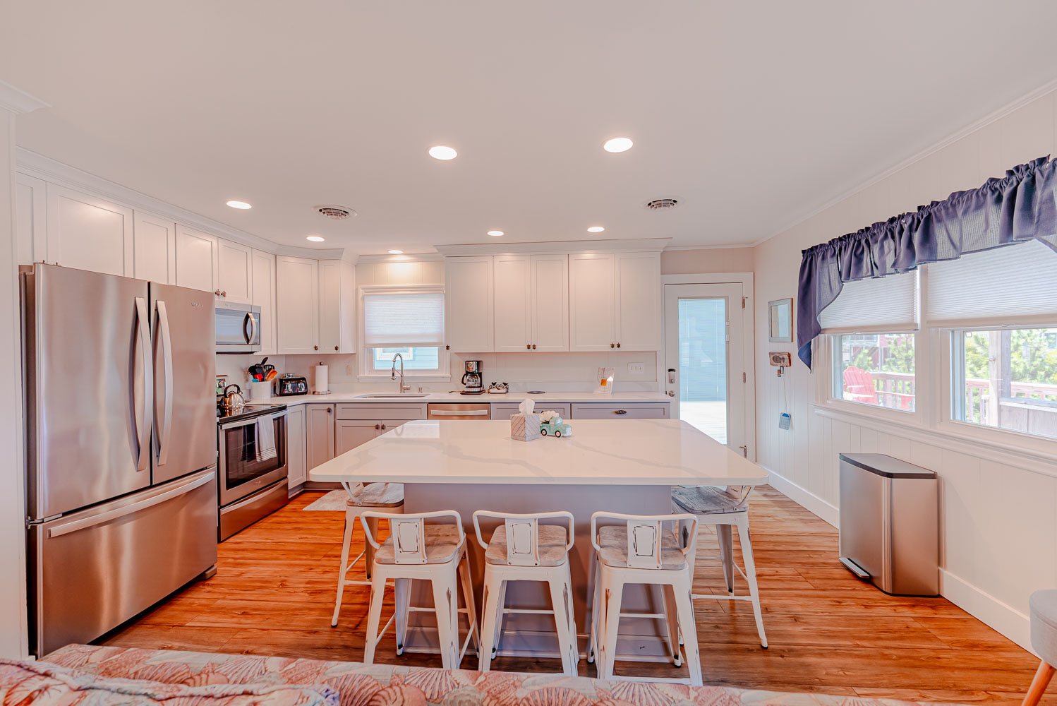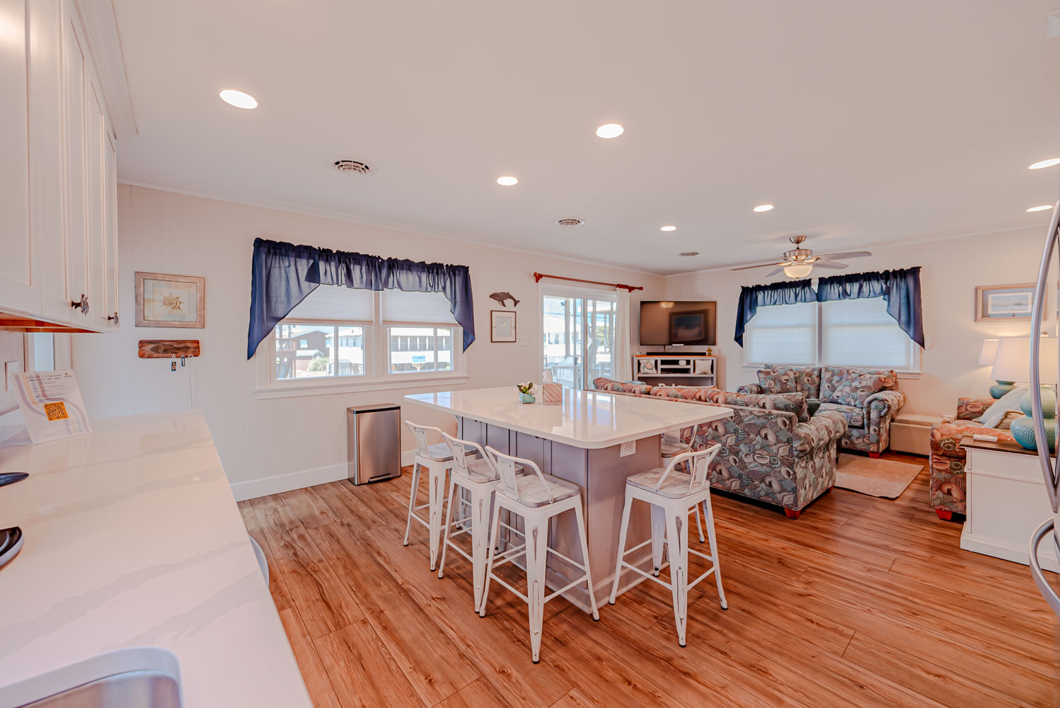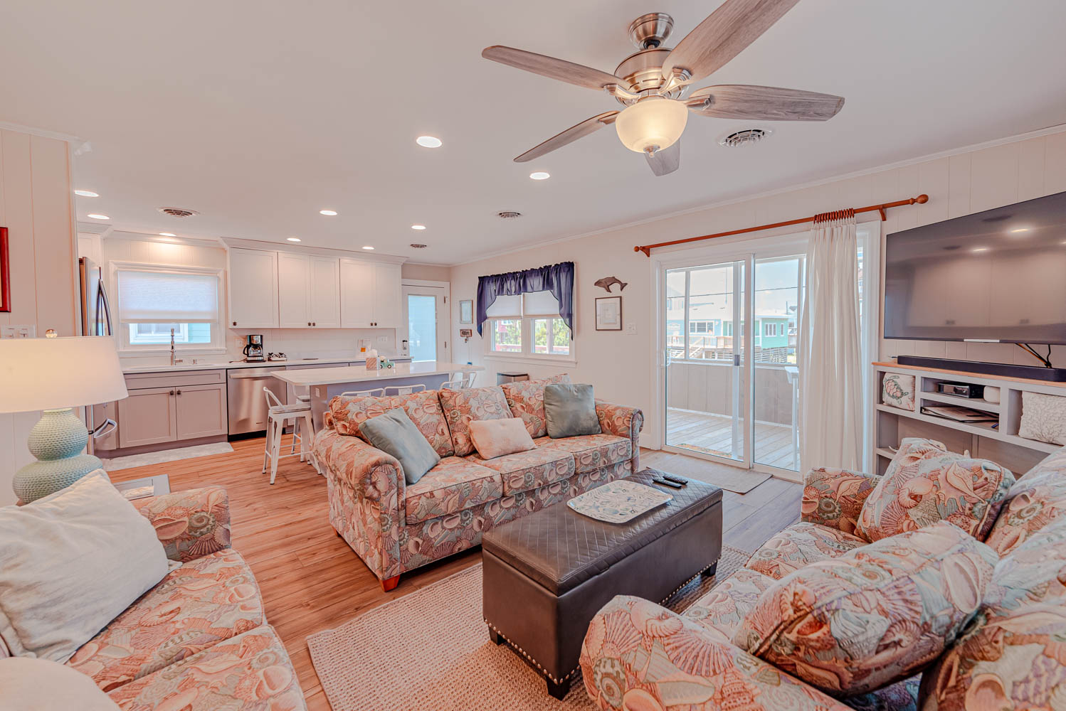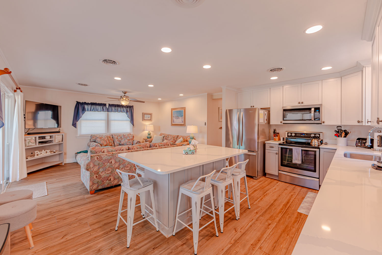Main Level: Open Living Area w/Large HDTV, Kitchen Area w/Stainless Steel Appliances, Island Bar w/Seating for Six (6), 3 Bedrooms (Private Suite w/King, TV, Full Bath w/Walk-In Shower, 2 w/Queens, TVs), Full Hall Bath w/Tub/Shower, Covered Deck w/Deck Furniture, and Sun Deck w/Deck Furniture and Picnic Table.