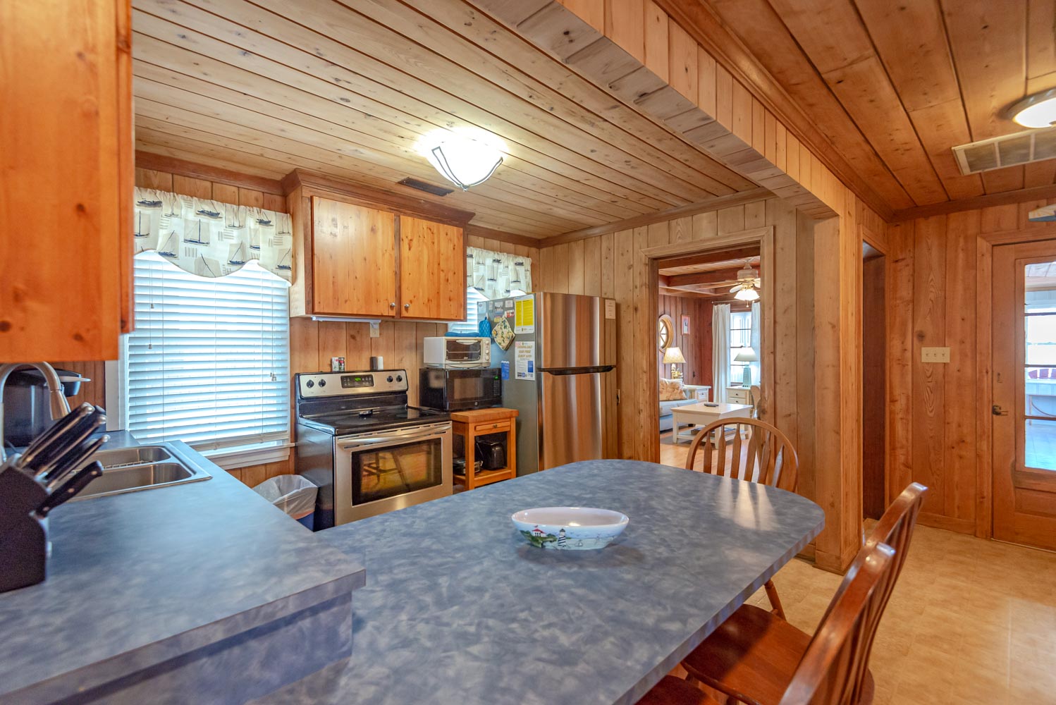 Ground Level: Parking for 4 Cars, Entry, Steps to Top Level Entry (No Interior Steps to Top Level), Kitchen/Dining Area, Den w/TV, 3 Bedrooms (1 w/Queen, 1 w/Double, 1 w/2 Singles), Full Bath, Laundry Area, & Gas Grill.