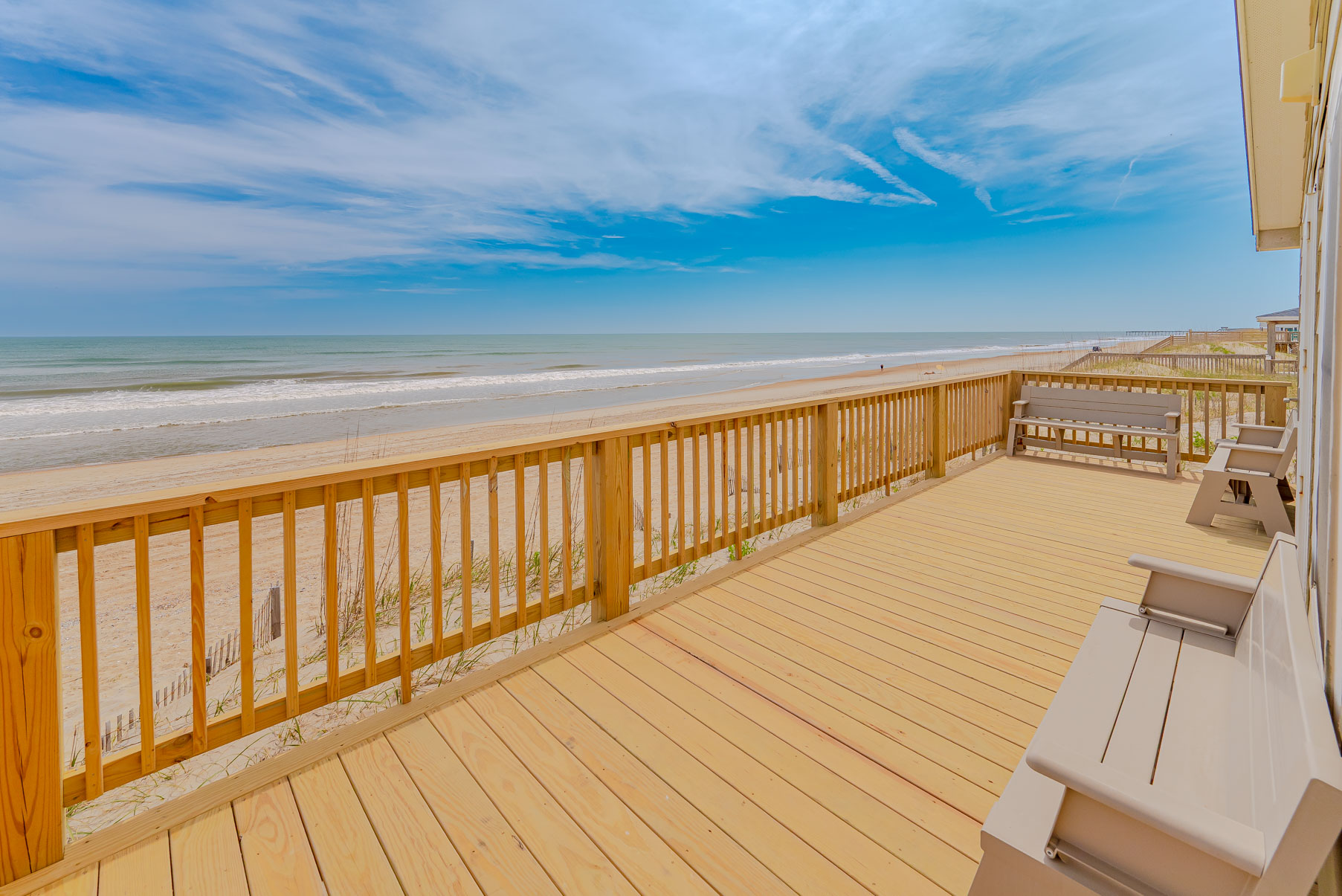 Main Level: Living Area, Eat-In Kitchen, Dining Table Seating Eight (8), 4 Bedrooms (Private Suite w/King, TV, Full Bath w/Tub/Shower; 1 w/Queen, TV; 1 w/Bunk Set, Single; 1 w/Bunk Set w/Stack Washer/Dryer), Full Hall Bath w/Shower, and Sun Deck w/Great Ocean and Beach Views.