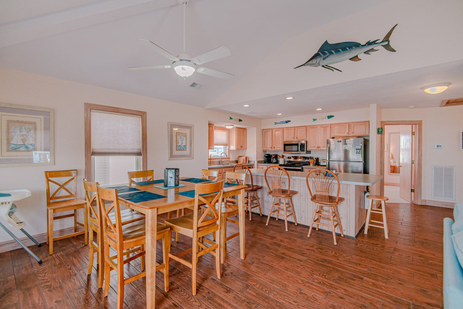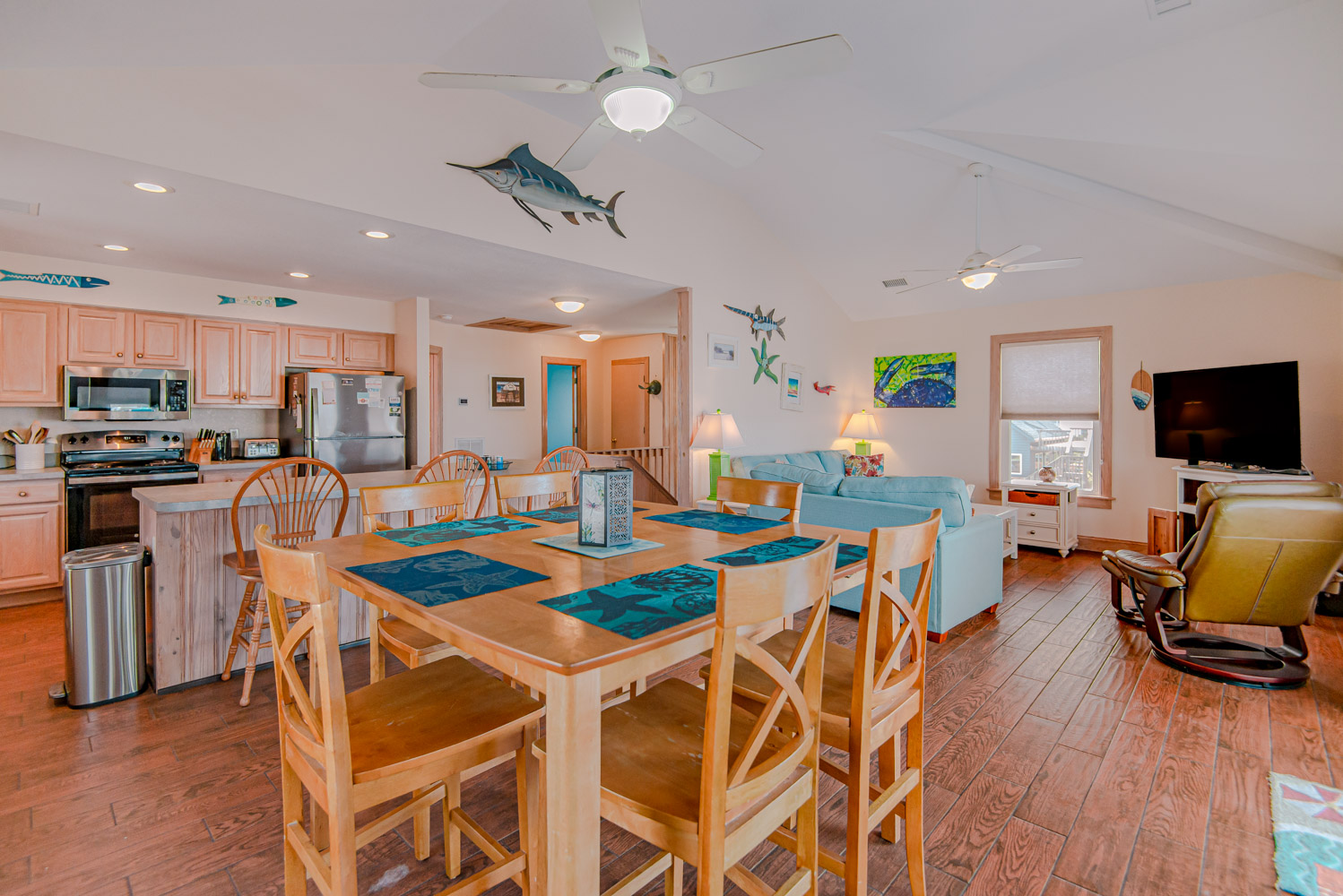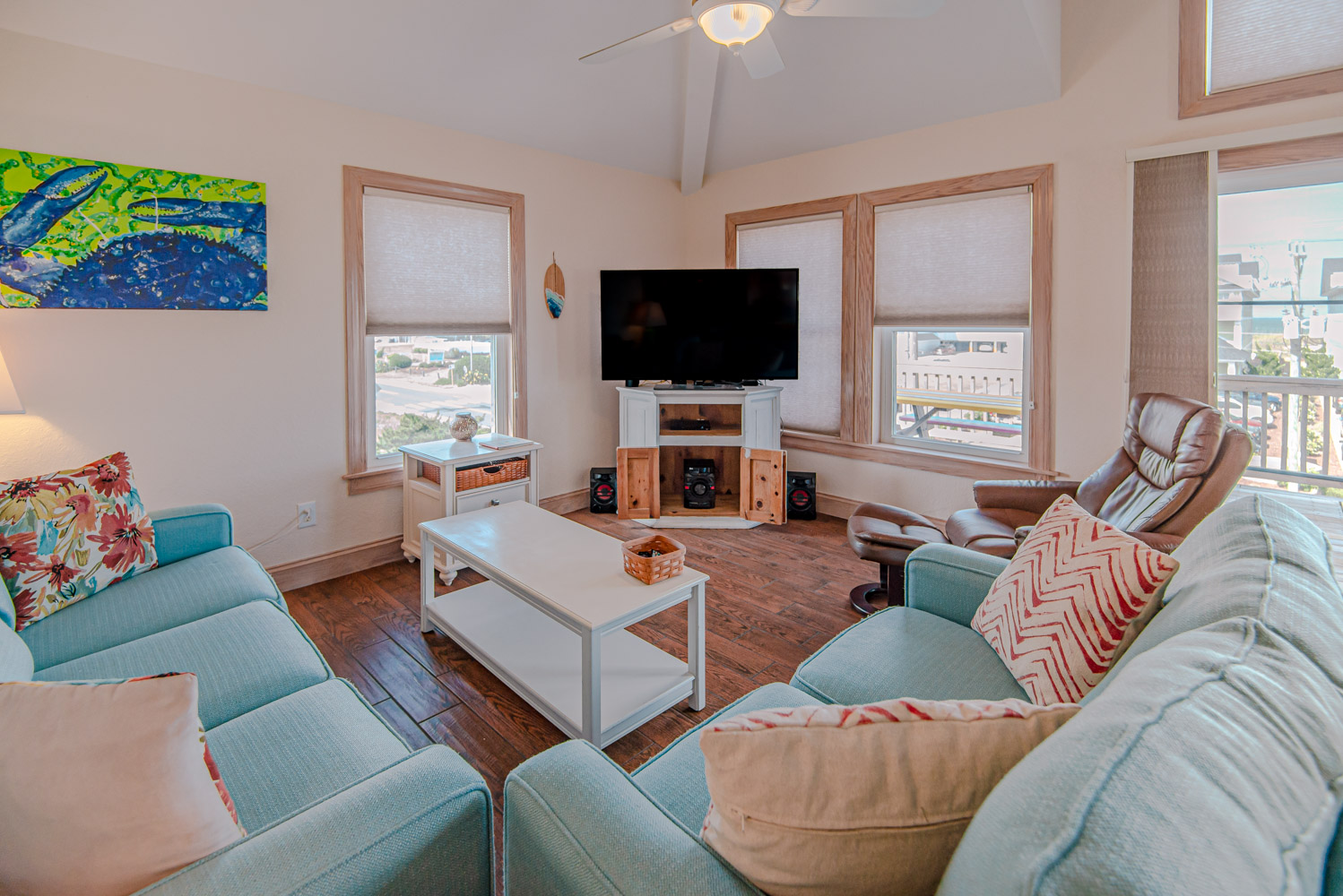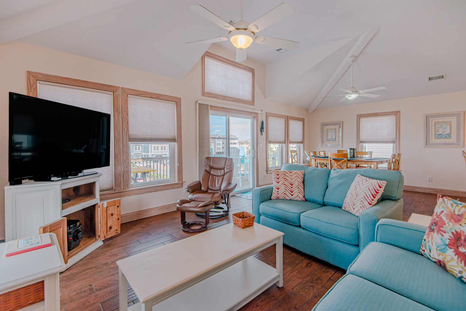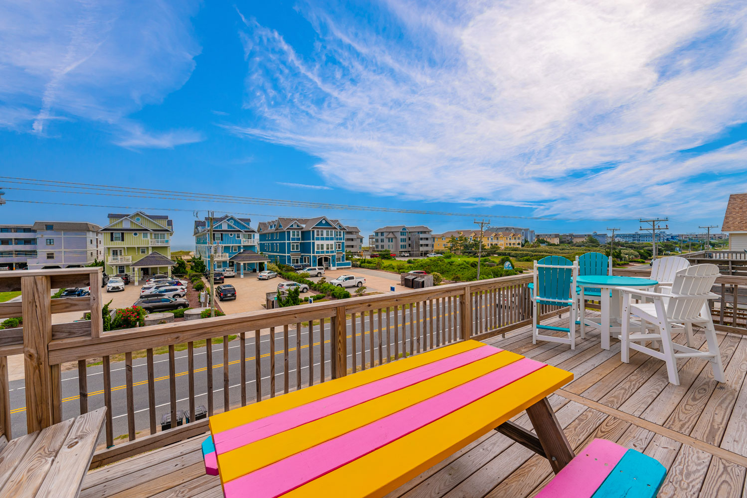 Top Level: Living Area, Dining Area w/Seating for Eight (8), Kitchen Area w/Bar Seating for Three (3), TV, Custom Blinds, Half Bath, Private Suite w/King, TV & Full Bath, & Sun Deck w/Deck Furniture & Built-In Seating.