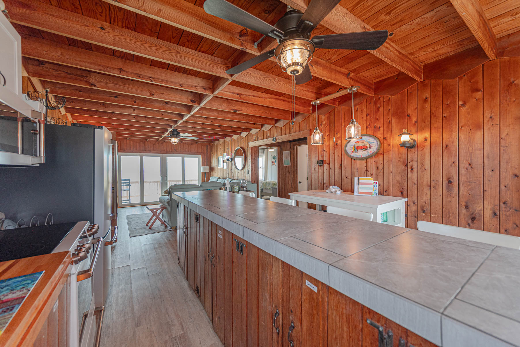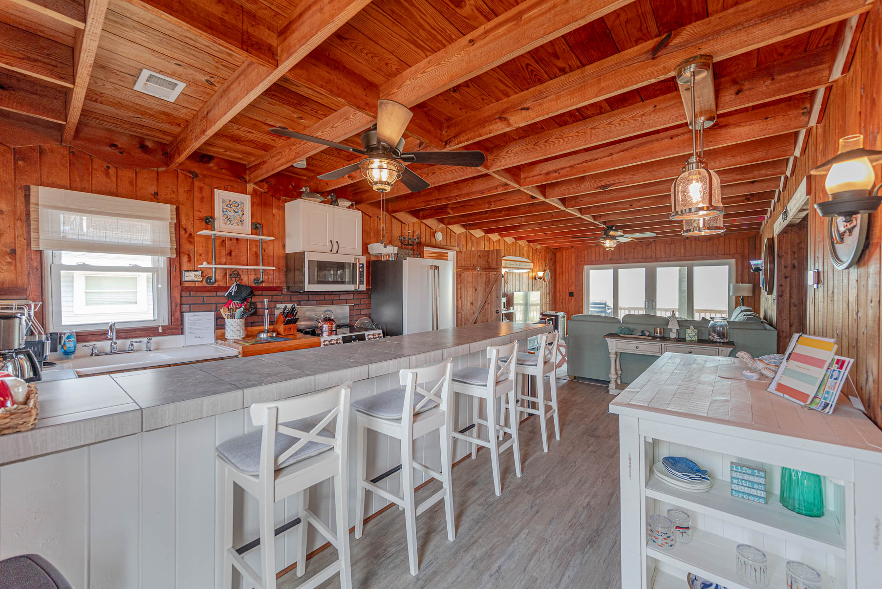 Main Level: Living Area, TV, Ocean Views, Fully Equipped Kitchen w GE Cafe Refrigerator, Range, & Microwave, Breakfast Bar, new Dining Table, 3 Bedrooms (Private Suite w/King, Full Bath w/Tub, Separate Shower; 1 w/Queen; 1 w/Queen, Single), Full Shared Bath w/Shower, Laundry Area, Sun Deck, and Covered Porch.