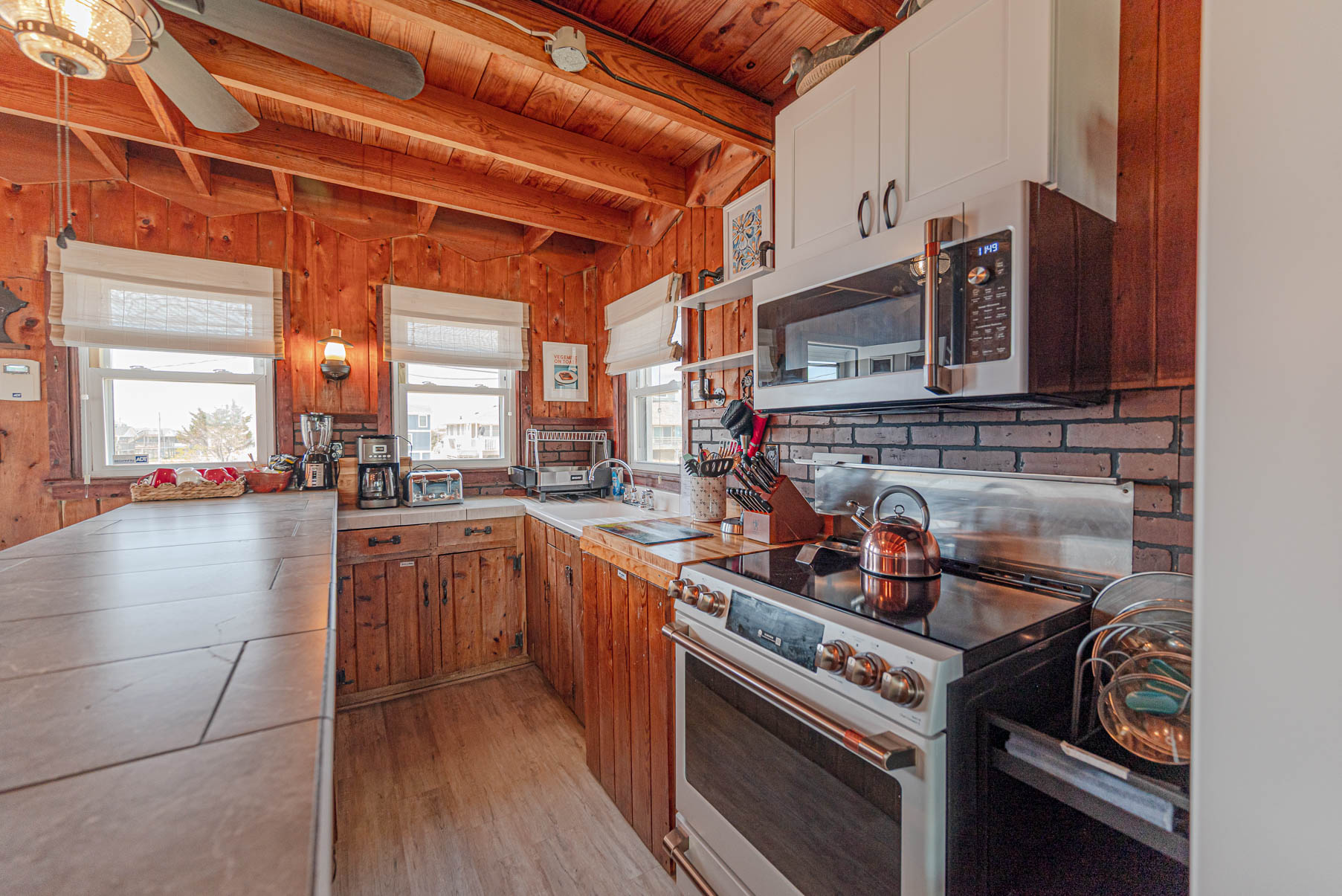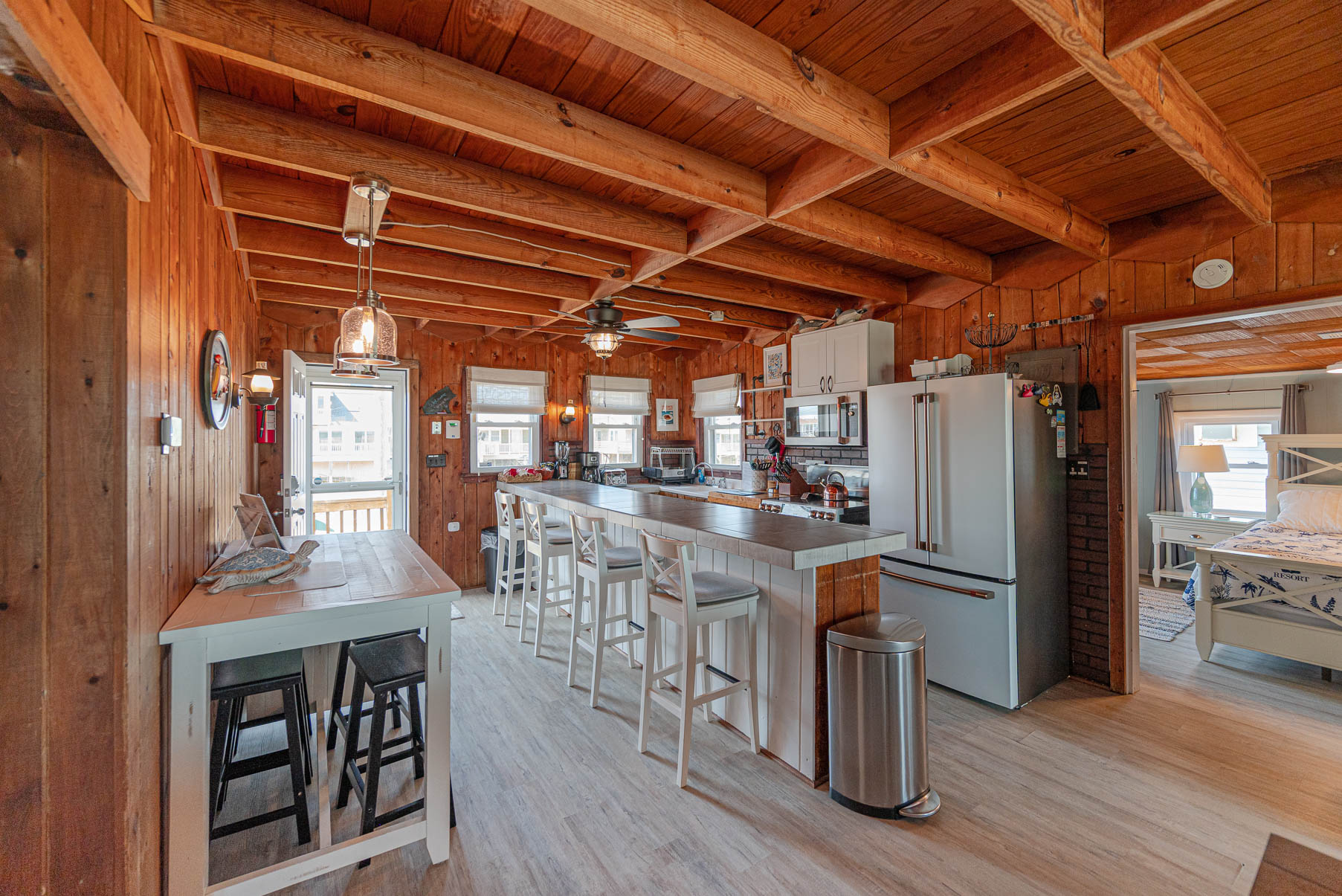 Welcome to Kingfisher, a stylish oceanfront cottage where the pace slows and the ocean takes center stage. This classic 1970s retreat blends retro charm with thoughtful modern comfort, offering ocean views and direct beach access. Inside, warm knotty pine walls, tongue-and-groove ceilings, exposed beams, and coastal decor create a relaxed, inviting space.