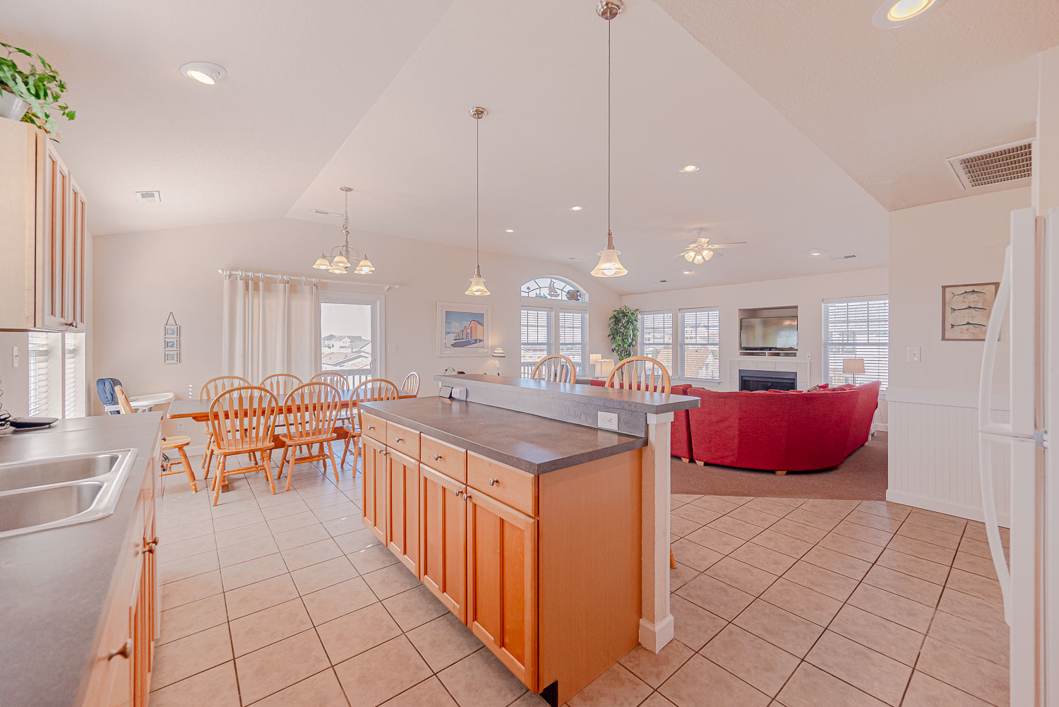 Top Level: Living/Dining/Kitchen Area, TV, DVD, Electric Fireplace, Half Bath, Bedroom w/King, Partial Covered Deck w/Deck Furniture, and Sun Deck w/Deck Furniture.