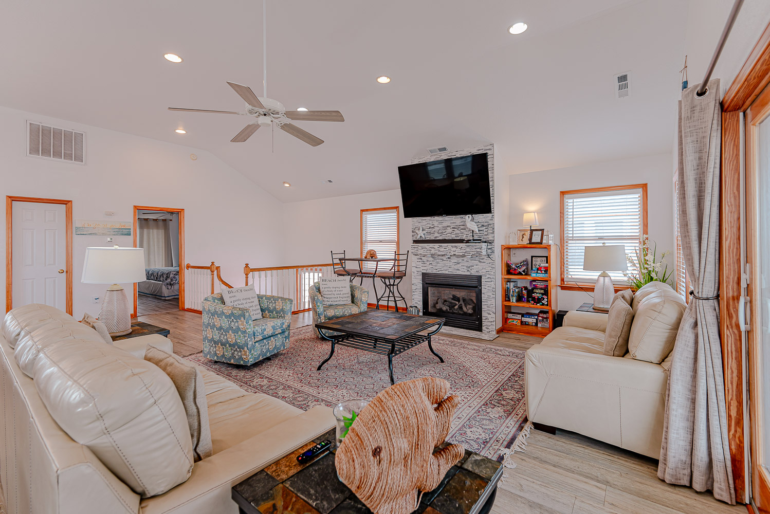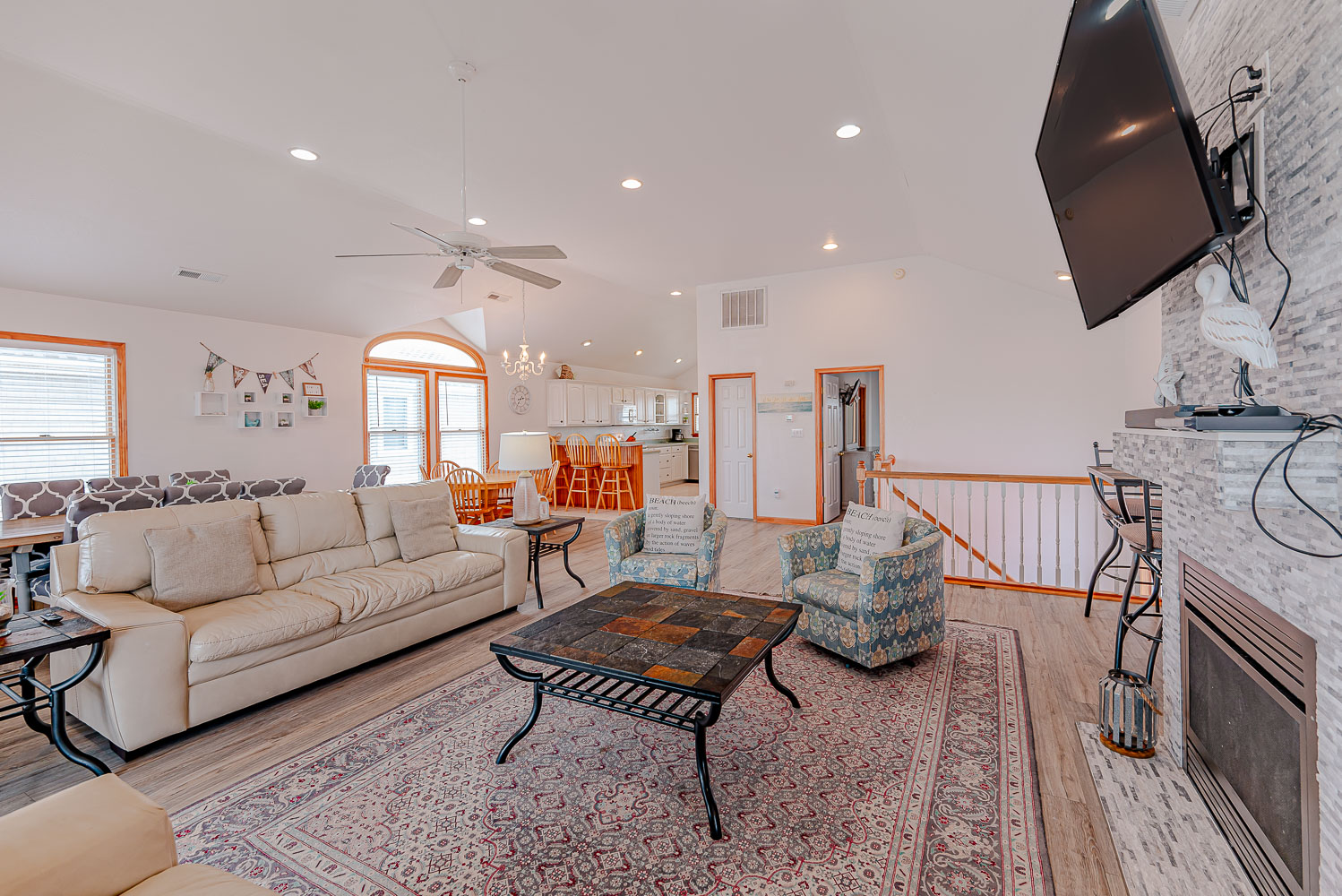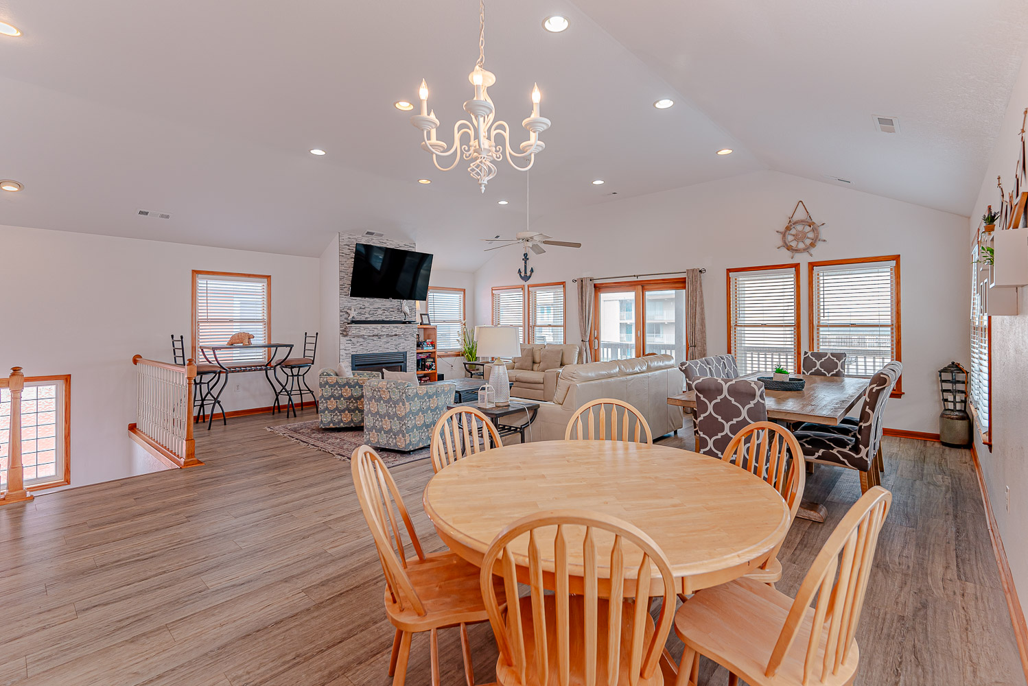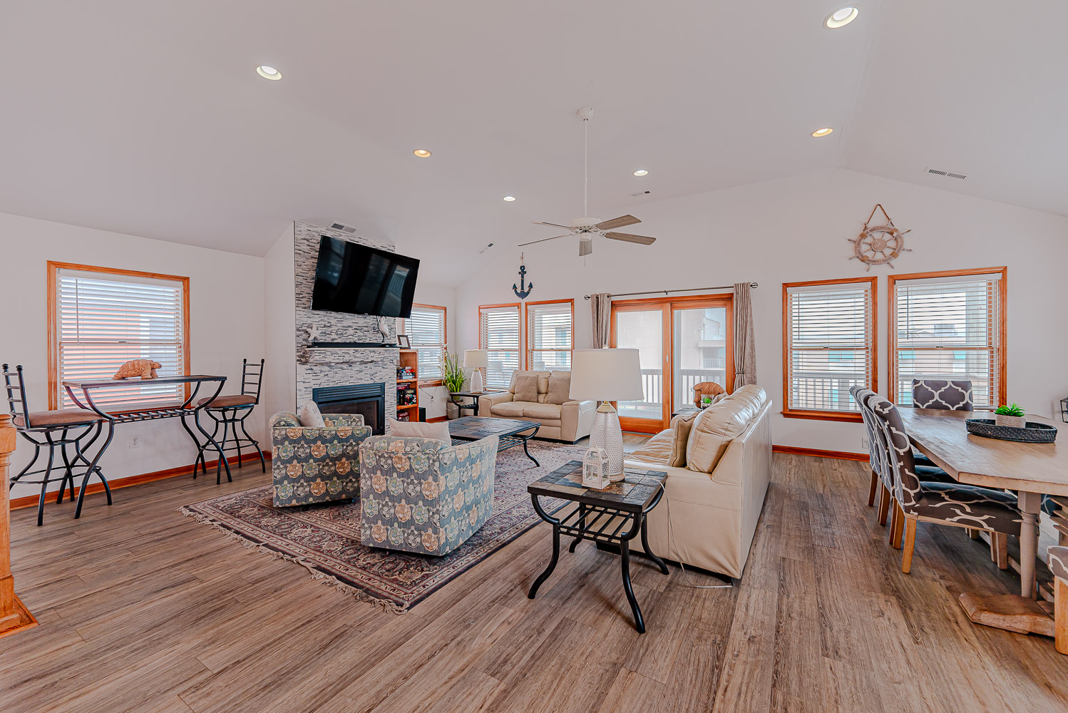 Top Level: Spacious Living/Dining/Kitchen Area, TV, DVD, Half Bath, Partial Ocean Views, Private Suite w/King, Full Bath & Smart TV, Front Covered Deck w/Deck Furniture & Ocean Views, & Back Covered Deck Overlooking Pool Area.