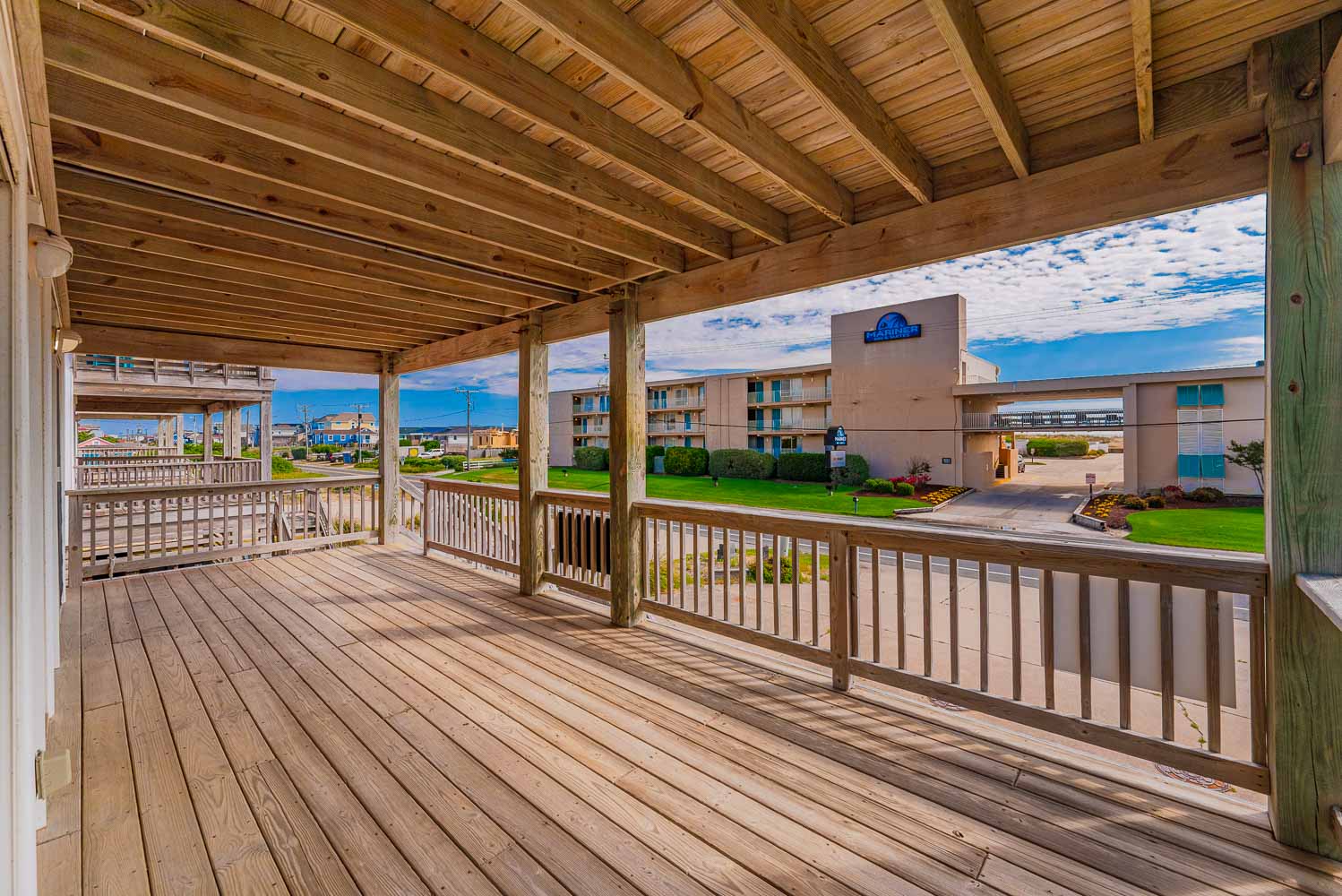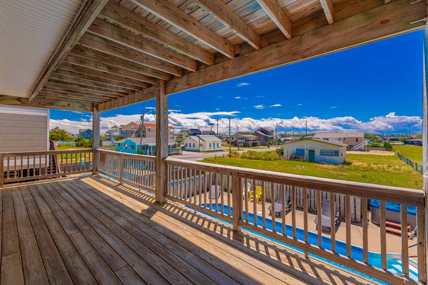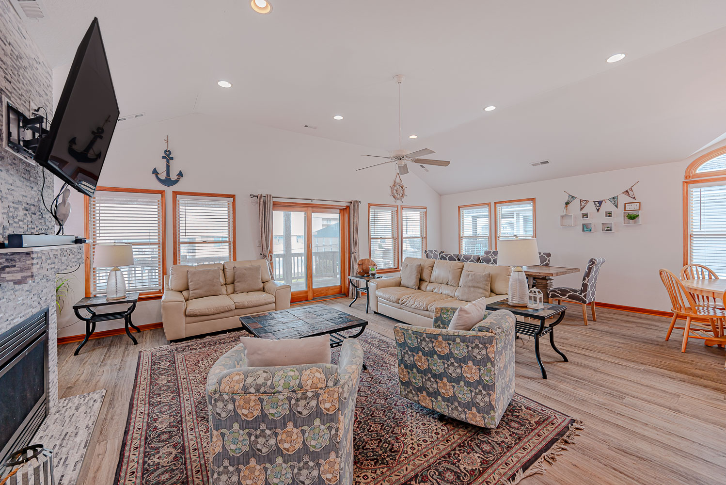 Top Level: Spacious Living/Dining/Kitchen Area, TV, DVD, Half Bath, Partial Ocean Views, Private Suite w/King, Full Bath & Smart TV, Front Covered Deck w/Deck Furniture & Ocean Views, & Back Covered Deck Overlooking Pool Area.