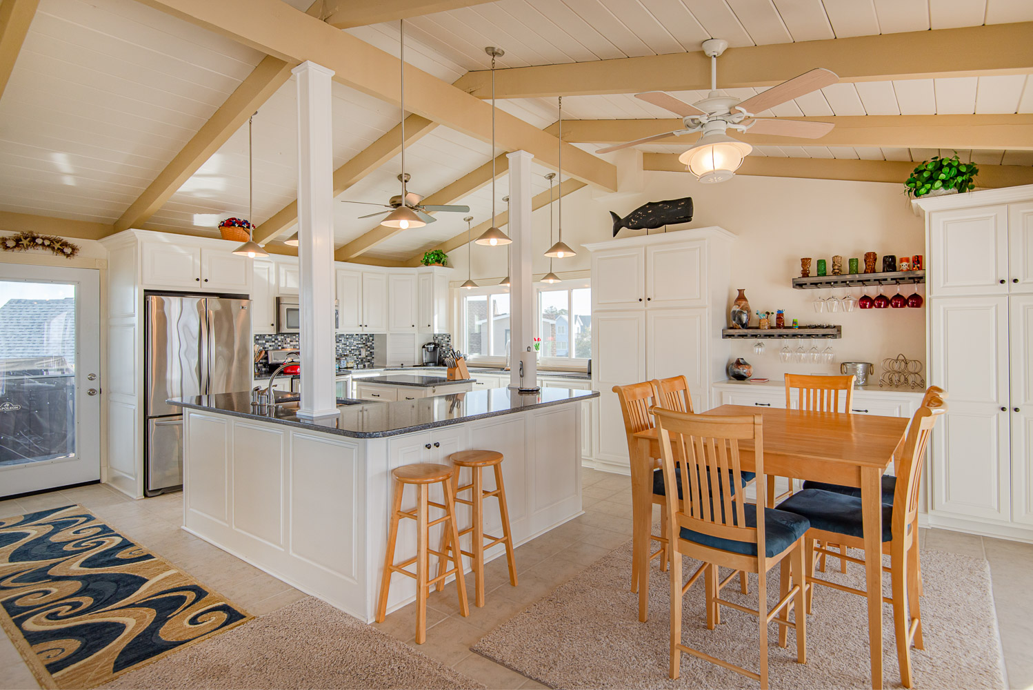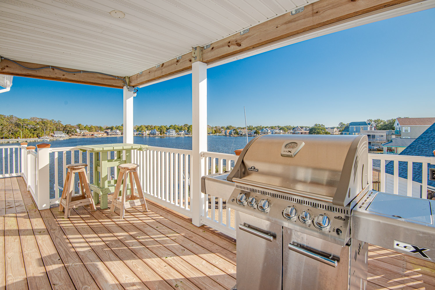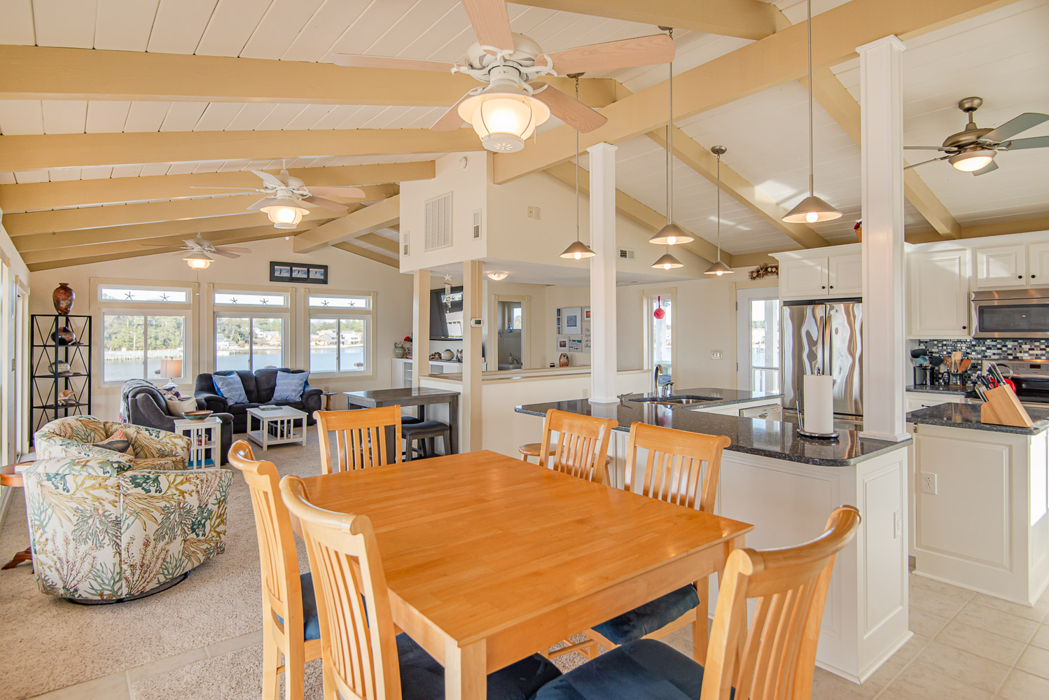 Top Level: Spacious Living Area, Large Flat Screen TV, Kitchen w/Stainless Steel Appliances, Dining w/Seating for Six (6), Half Bath, Access to Covered Wrap Around Deck w/Deck Furniture, & Beautiful Water Views.