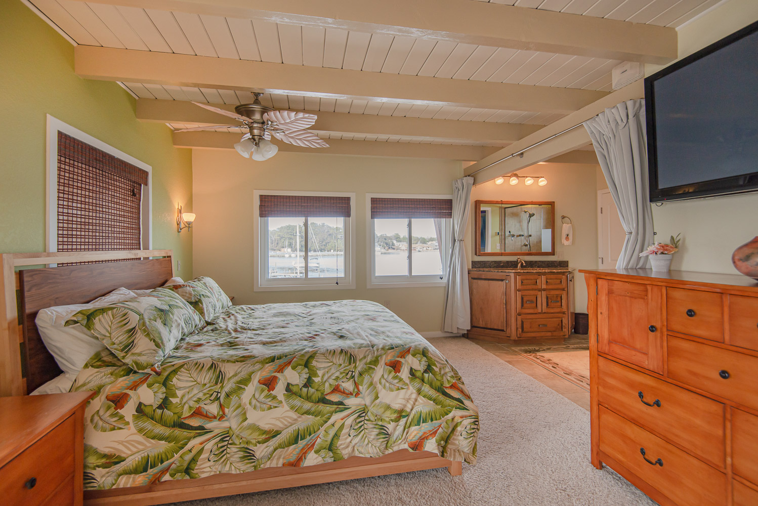 Mid Level: 3 Bedrooms (Private Suite w/King, TV, Walk-In Closet, & Full Bath w/Tiled Shower, 1 w/Queen, 1 w/Double), Shared Full Bath, Front Covered Deck w/Sound Views, & Covered Deck w/Hot Tub & Harbour Views.