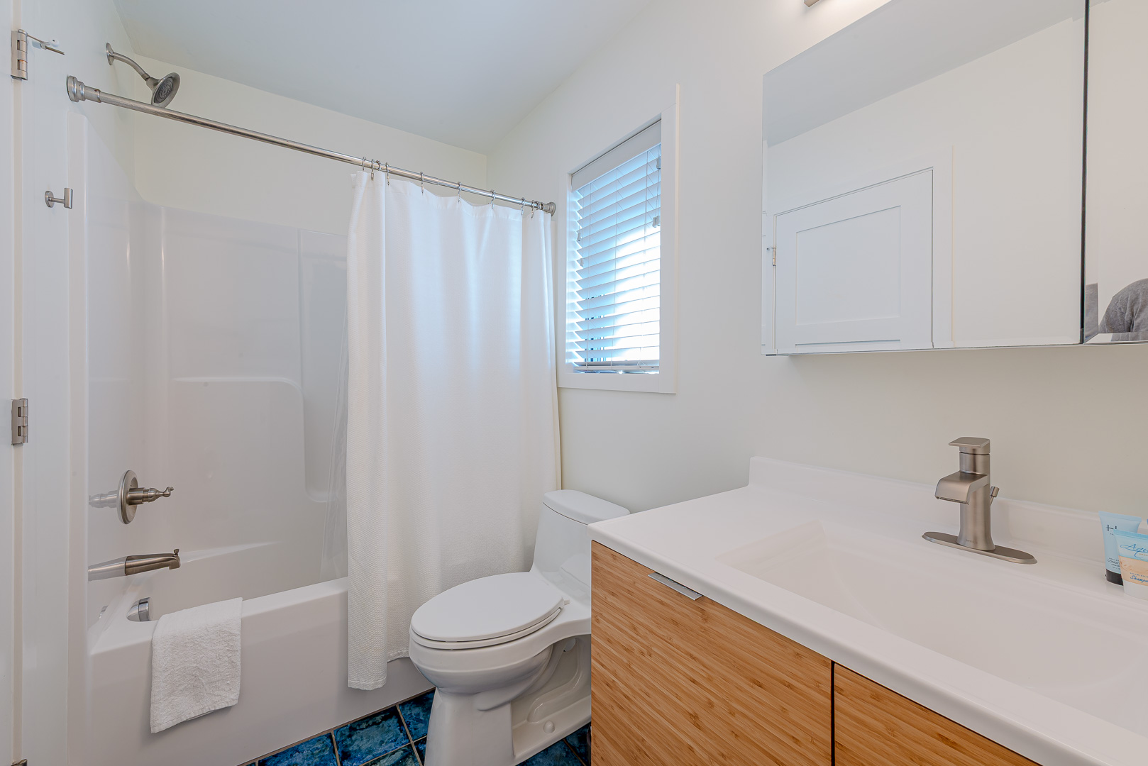 Steps to Covered Entry, Open, Spacious Living Area, TV, Gas Fireplace, Beautiful Sound Views, Well Equipped Modern Kitchen, Stainless Steel Appliances, Gas Stove, Island Bar, Seating for Six (6), Private Suite w/King, TV, Access to Covered Soundfront Deck, Full Bath, Soaking Tub, and Walk-In Shower.