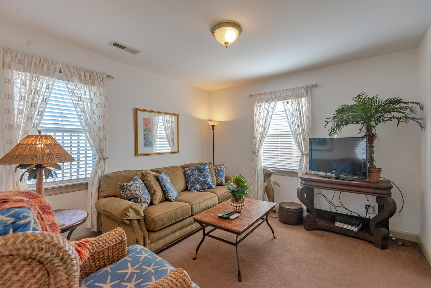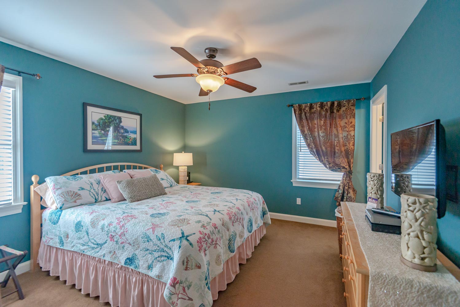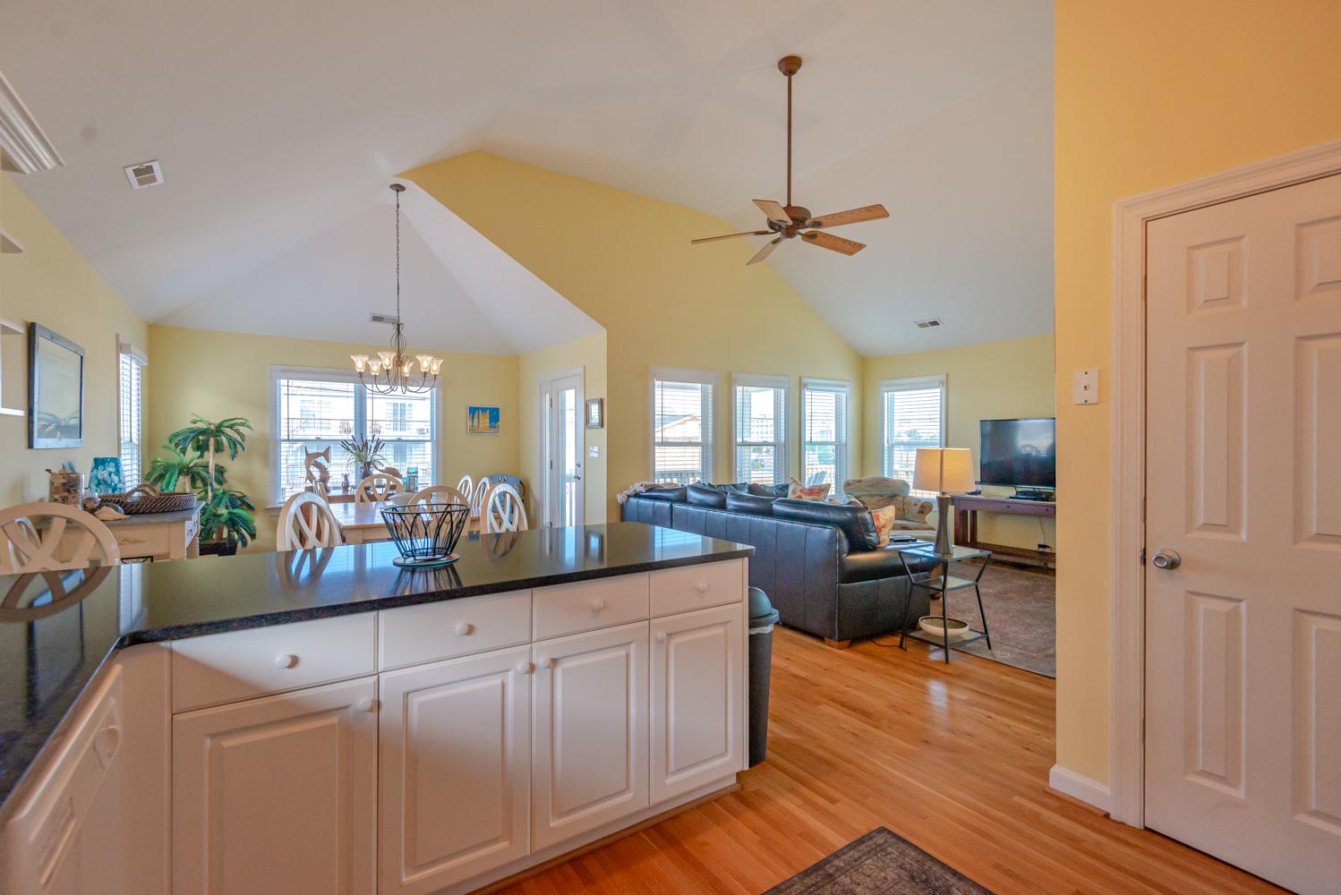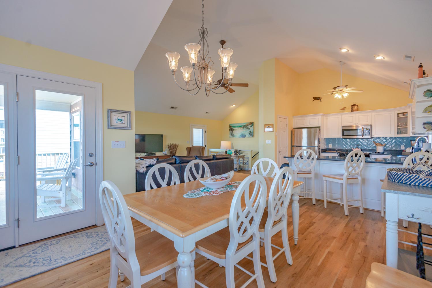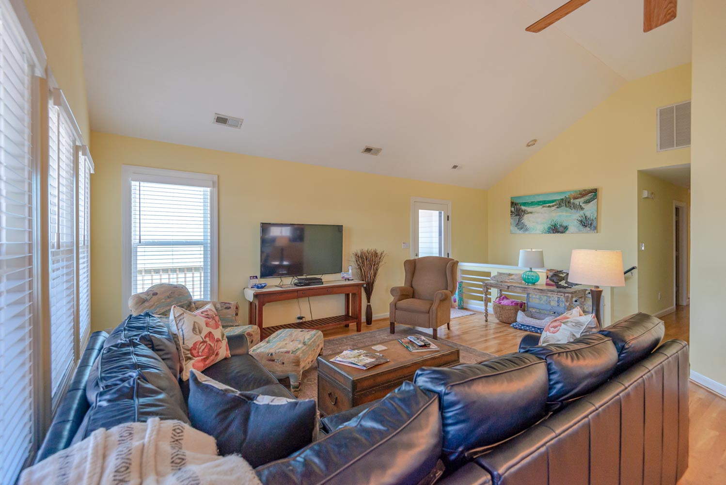 Main Level: Living/Dining/Kitchen Area, Flat Screen TV, DVD, Stereo, Hardwood Floors, Stainless Steel Appliances, Ceiling Fans, 3 Bedrooms (1 Private Suite w/King, Flat Screen TV, & Full Bath, 2 w/Queens, 1 w/Queen), Full Hall Bath, Covered Deck w/Deck Furniture, & Sun Deck.