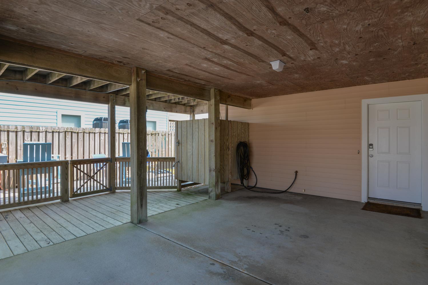 Ground Level: Parking for 4 Cars, Covered Entry, Den w/Flat Screen TV, Bedroom w/Queen, Full Bath, Laundry Area, Garage w/Ping Pong Table (Accessible from Den), Enclosed Outside Shower, Patio w/Charcoal Grill, & Fenced Back Yard.