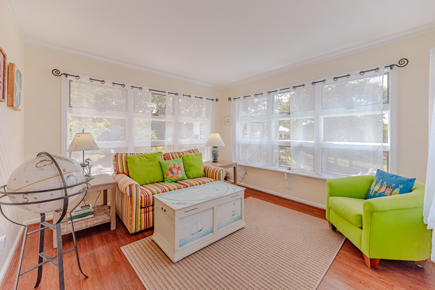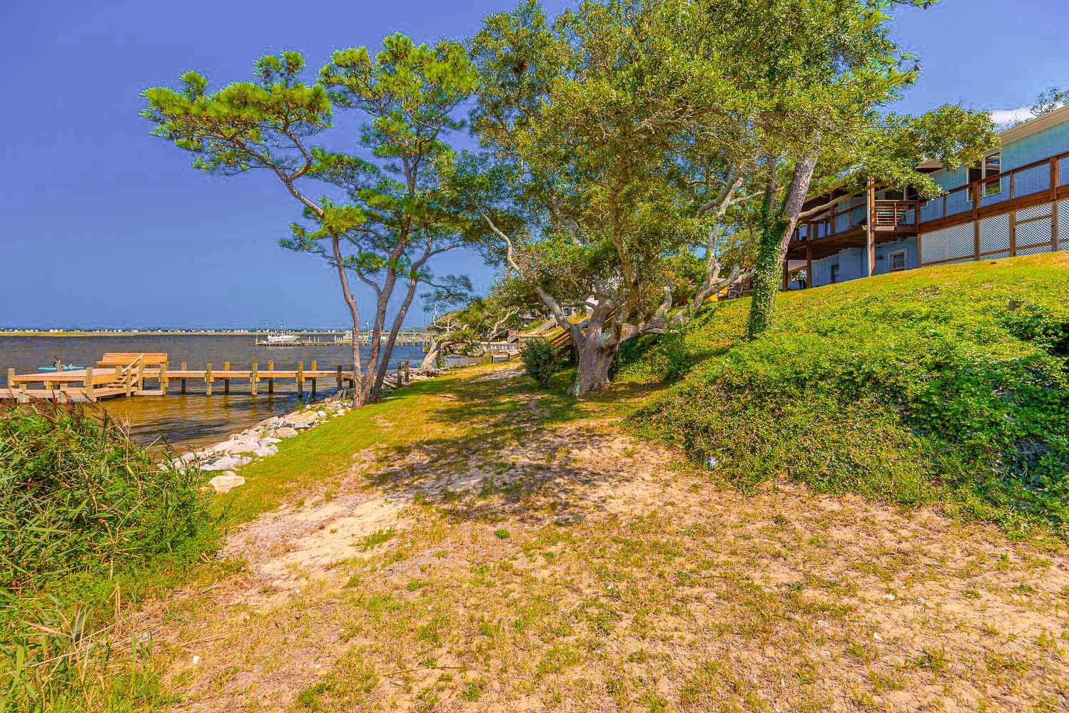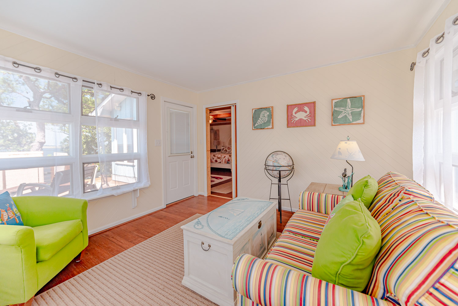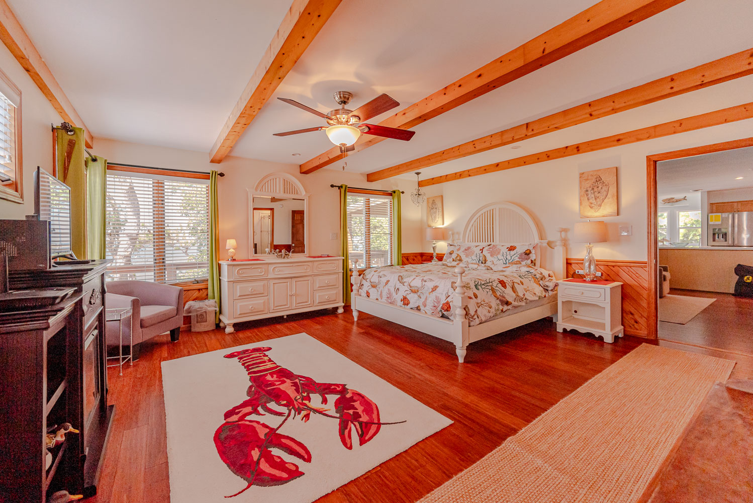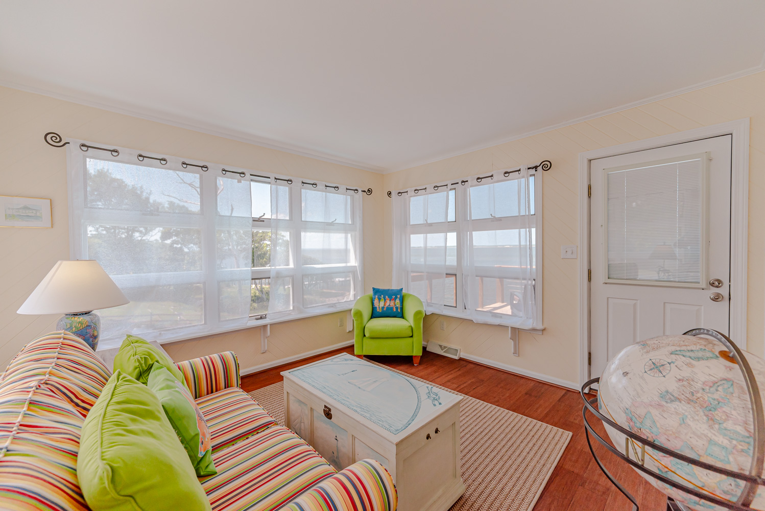 Main Level: Living/Dining/Kitchen Areas, Outstanding Sound Views, Hardwood Floors, 4 Bedrooms (Grand Private Suite w/King, TV, Full Bath, Private Sunroom; Private Suite w/Queen, TV, Full Bath; 1 w/Queen; 1 w/2 Singles), Full Hall Bath, Covered Deck, and Sun Deck with Deck Furniture.