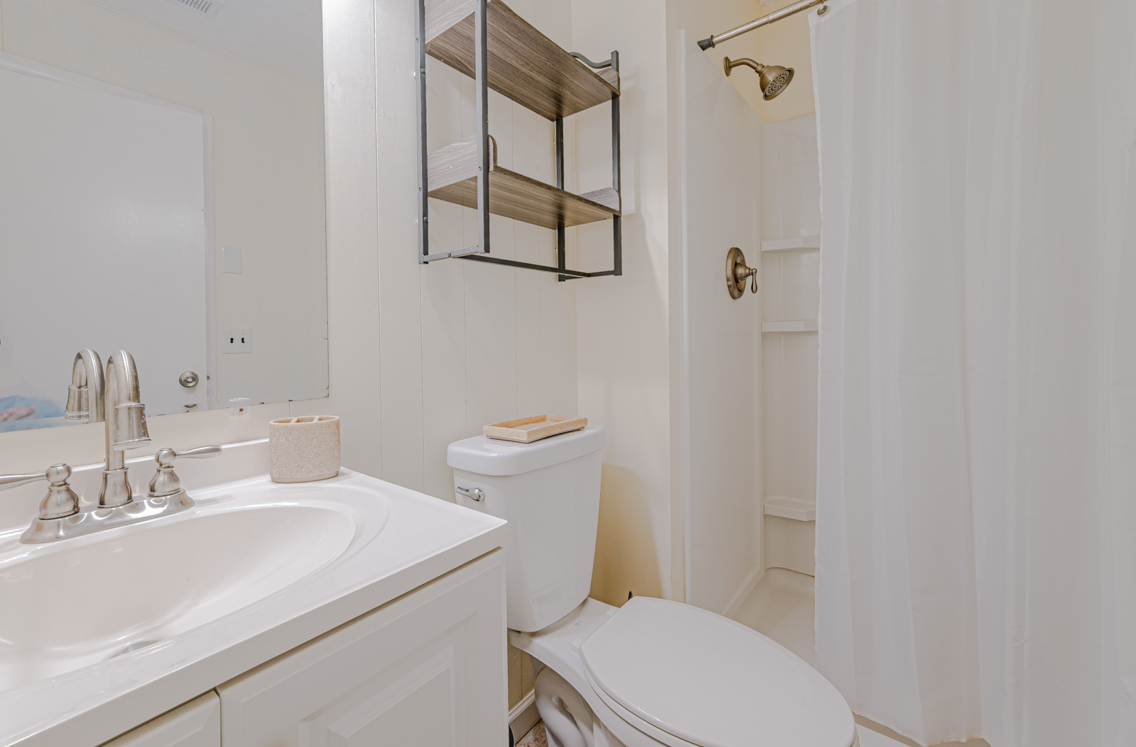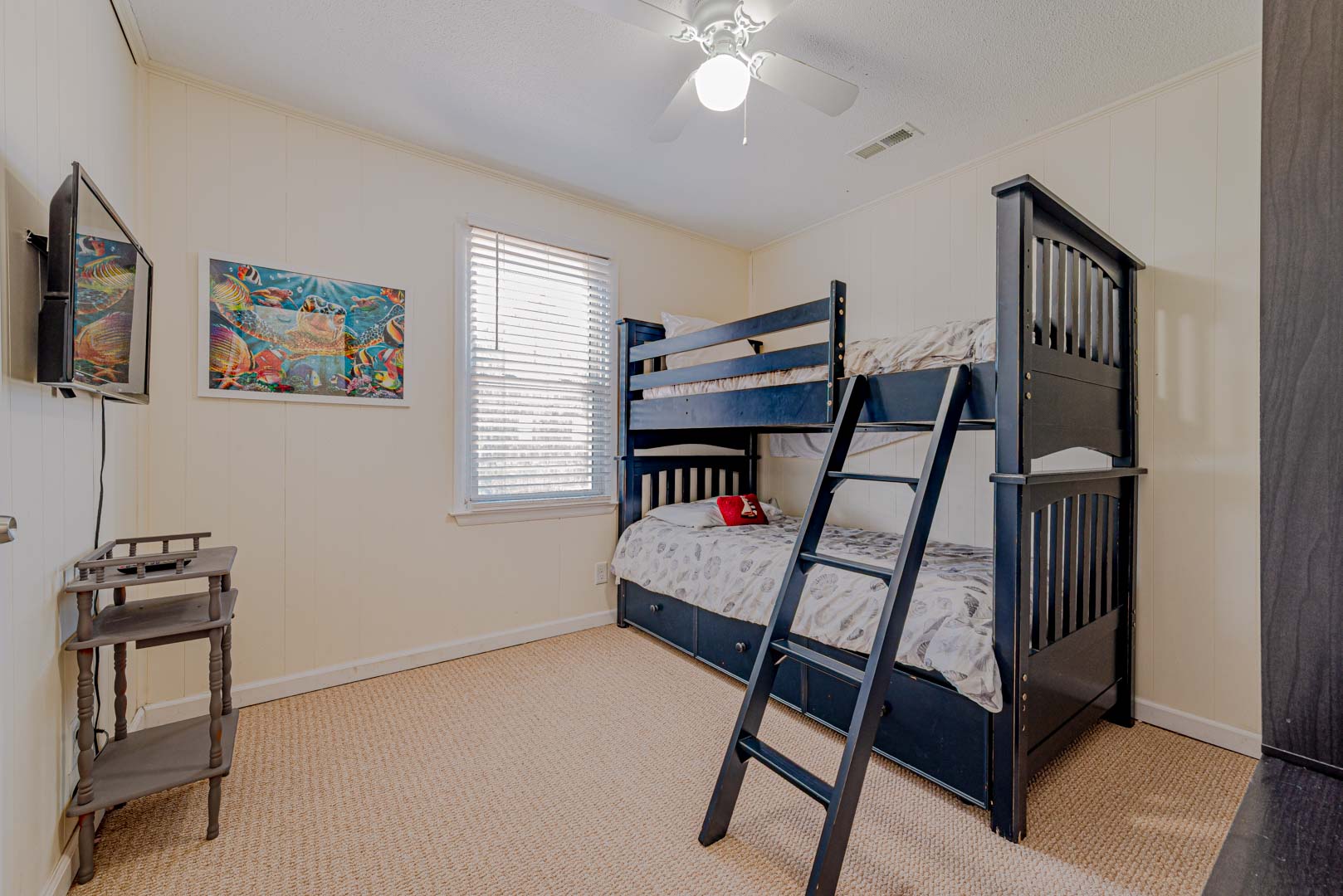 Main Level: Living/Dining/Kitchen, TV, Island Bar, 3 Bedrooms (Private Suite w/Queen, Full Bath w/Shower; Bedroom w/Queen; Bedroom w/Bunk Set, TV), Full Hall Bath w/Shower, and Covered Porch w/Furniture.
