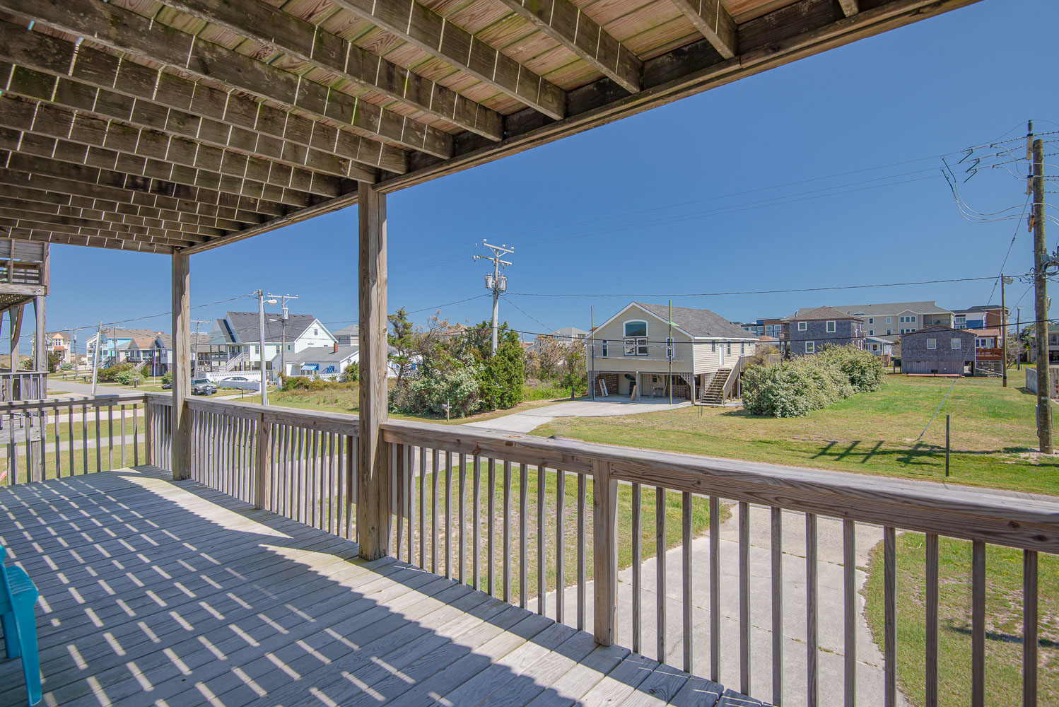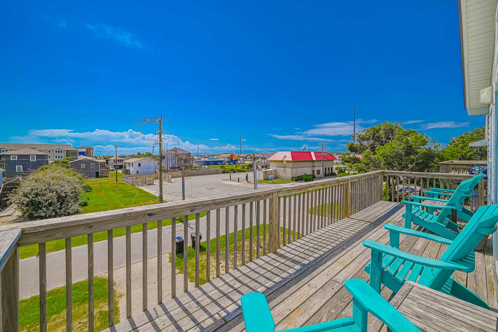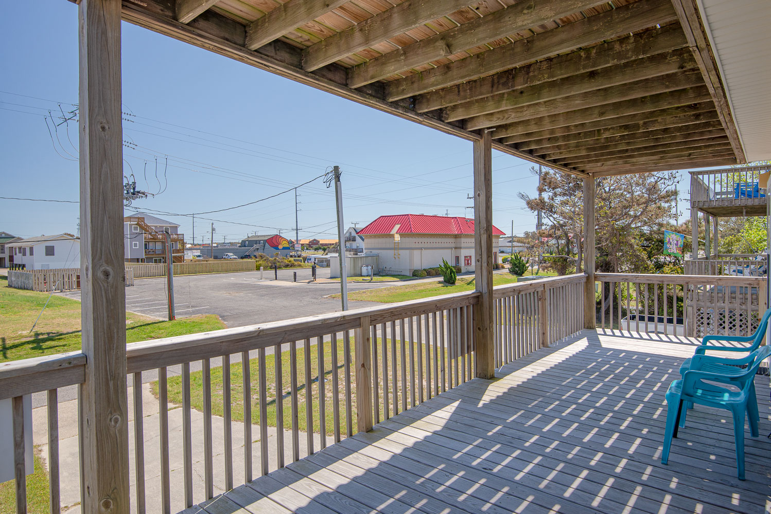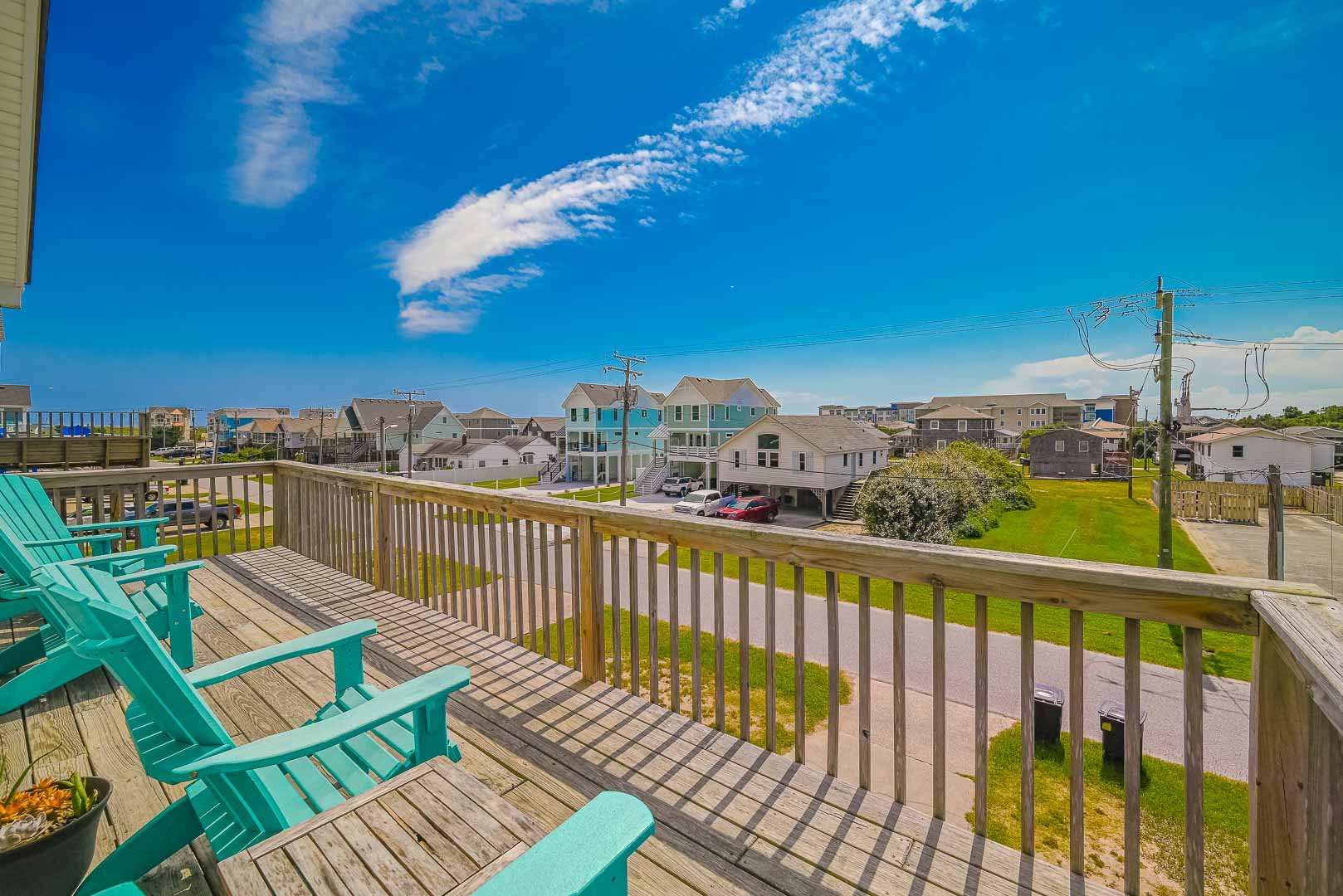 Top Level: Living/Dining/Kitchen Area, HDTV and DVD, 1 Bedroom w/Queen, Full Bath, and Sun Deck w/Deck Furniture and Ocean Views.