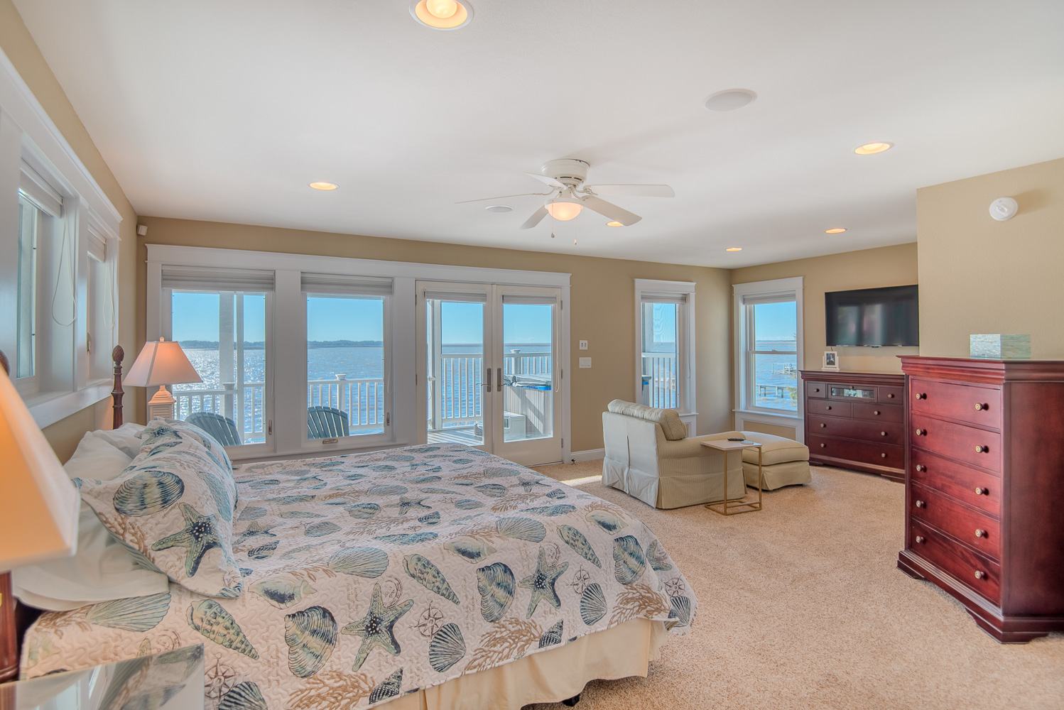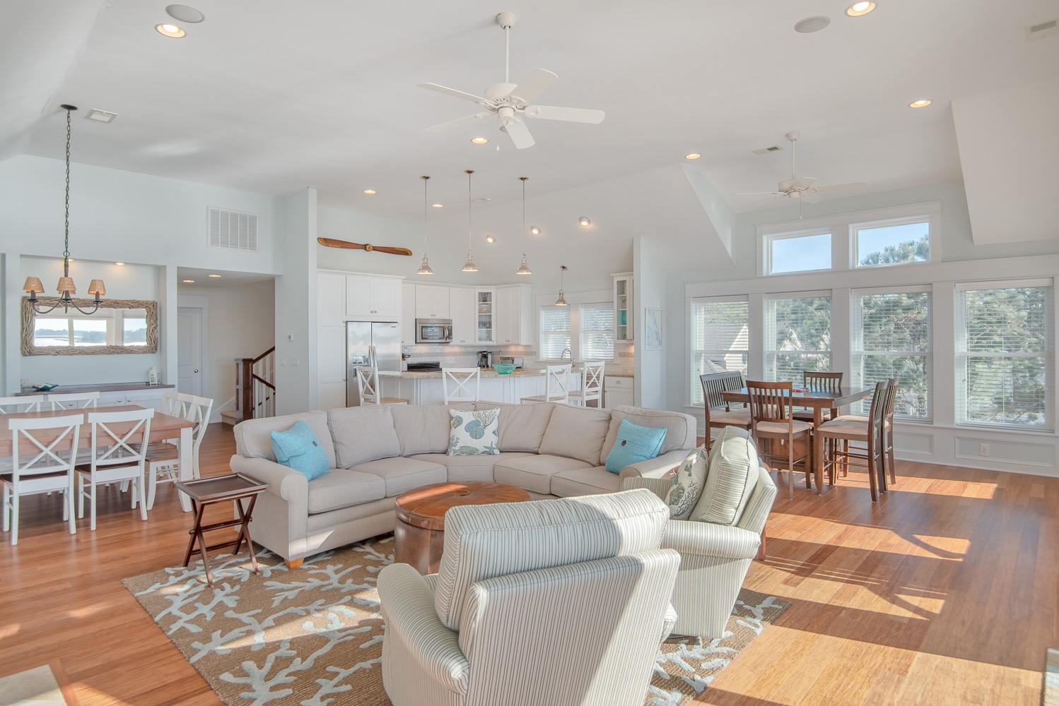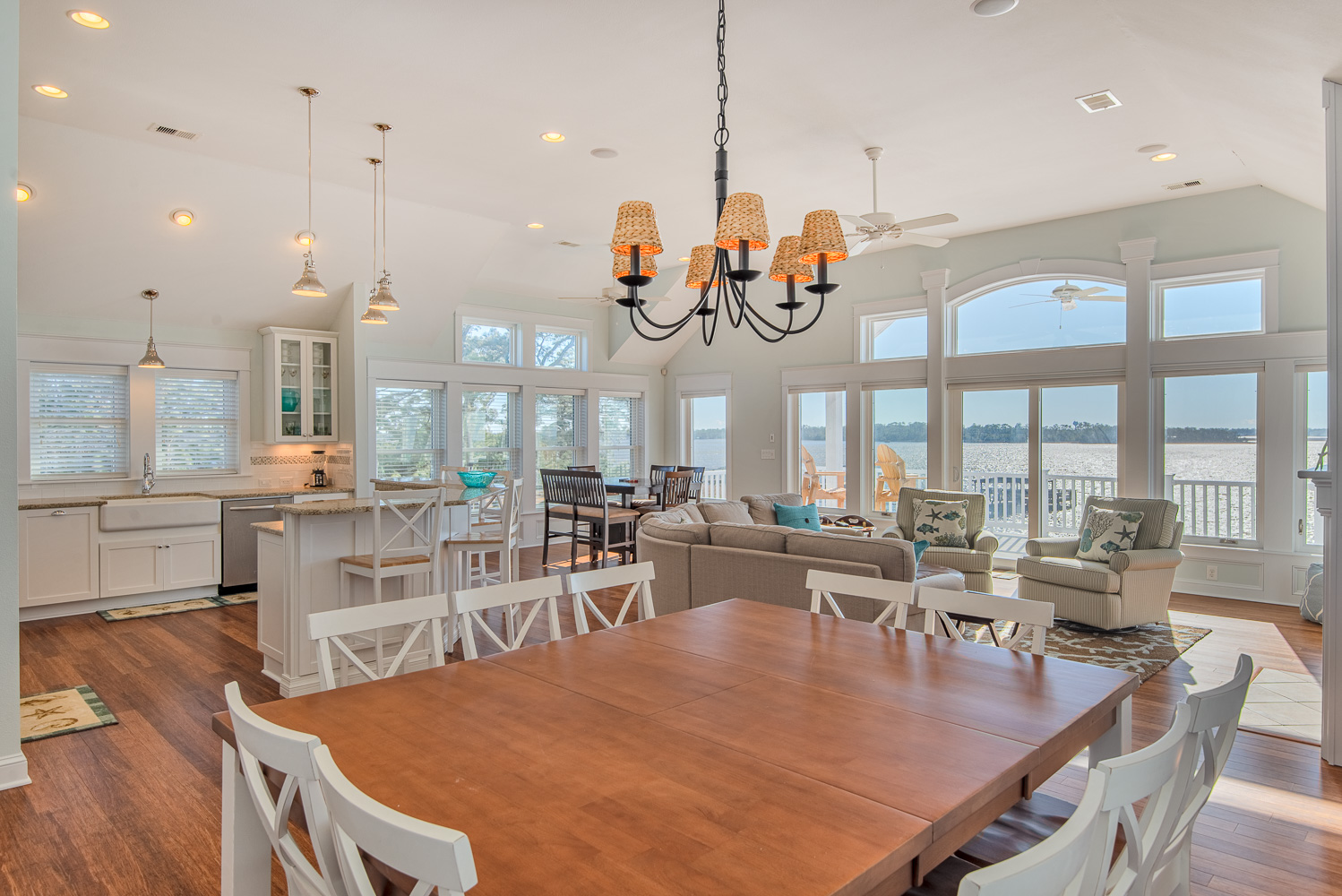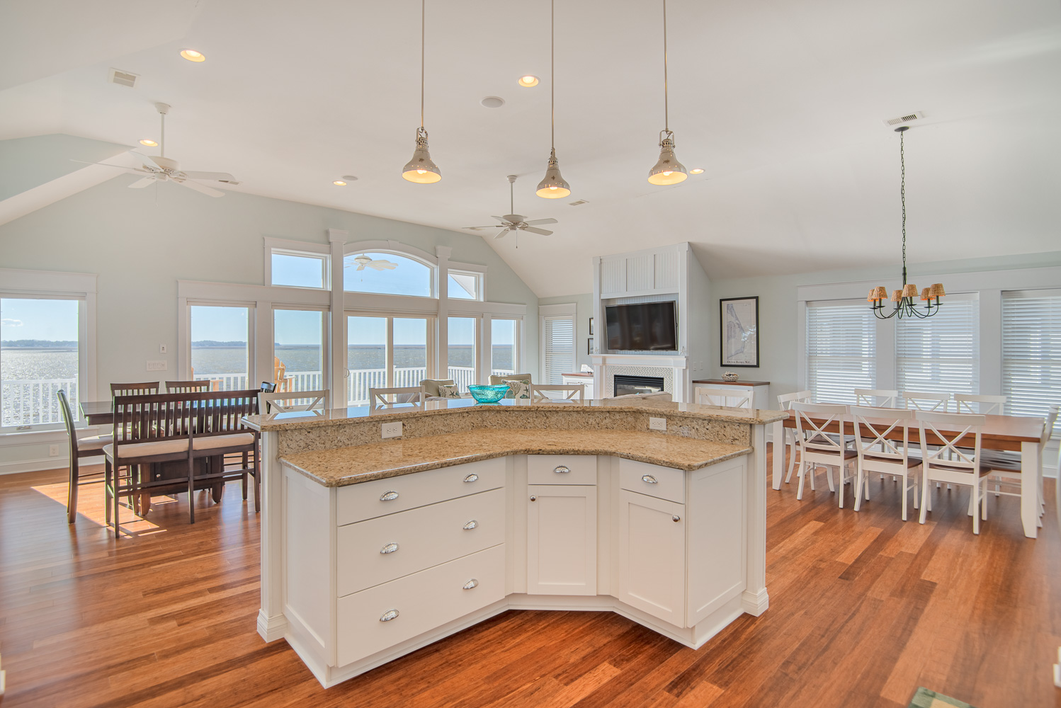 Top Level: Spacious Living/Dining/Kitchen Area, Cathedral Ceilings, Flat Panel TV, Gourmet Kitchen, Granite Counters, Gas Range, Stainless Steel Appliances; Access to Ship’s Watch, Private Suite w/King, TV, Full Bath w/Tub/Shower, and Great Sound Views.