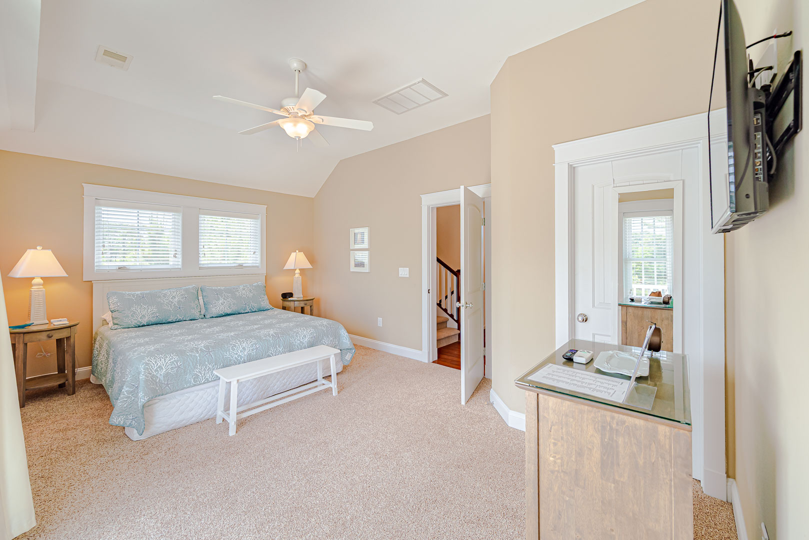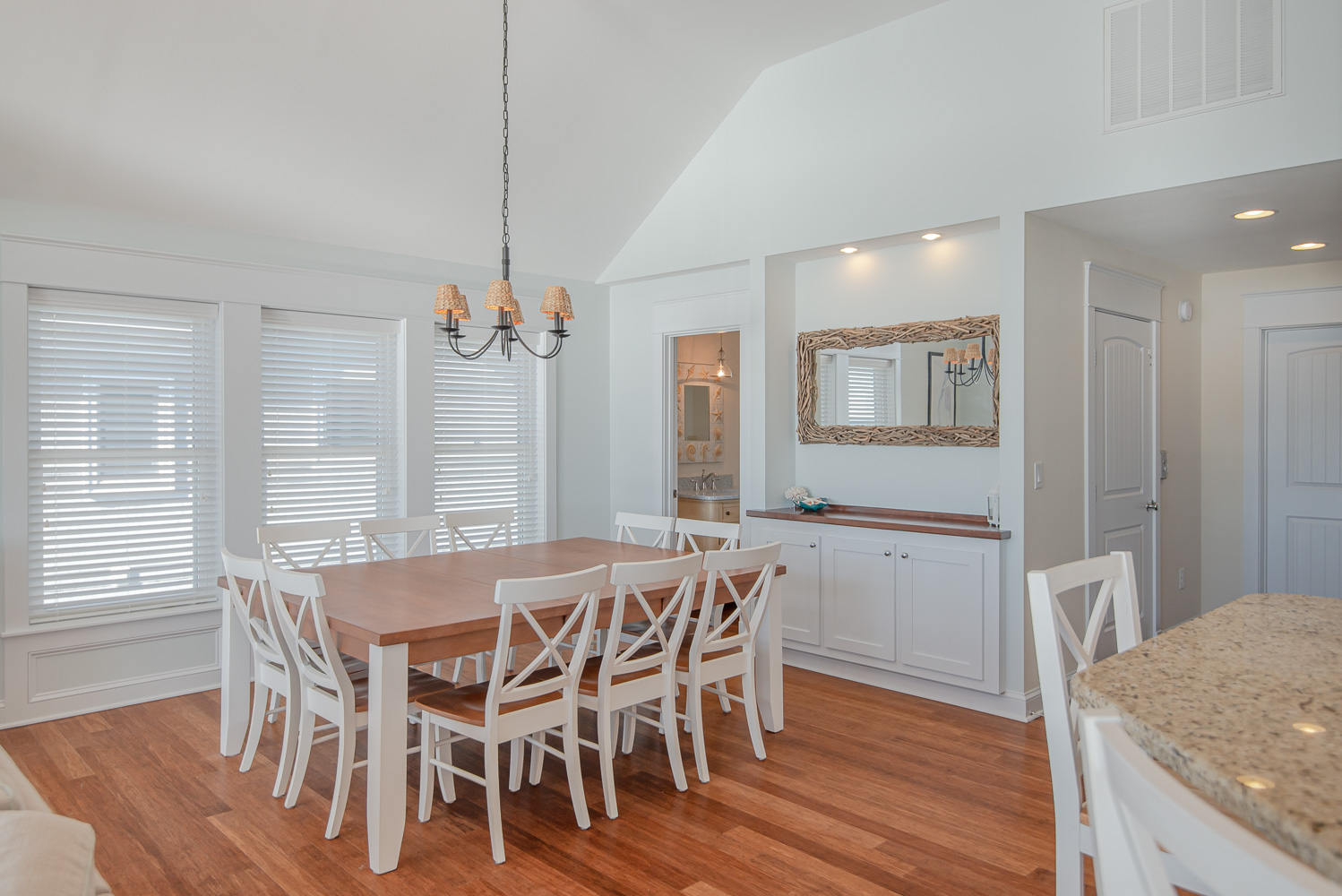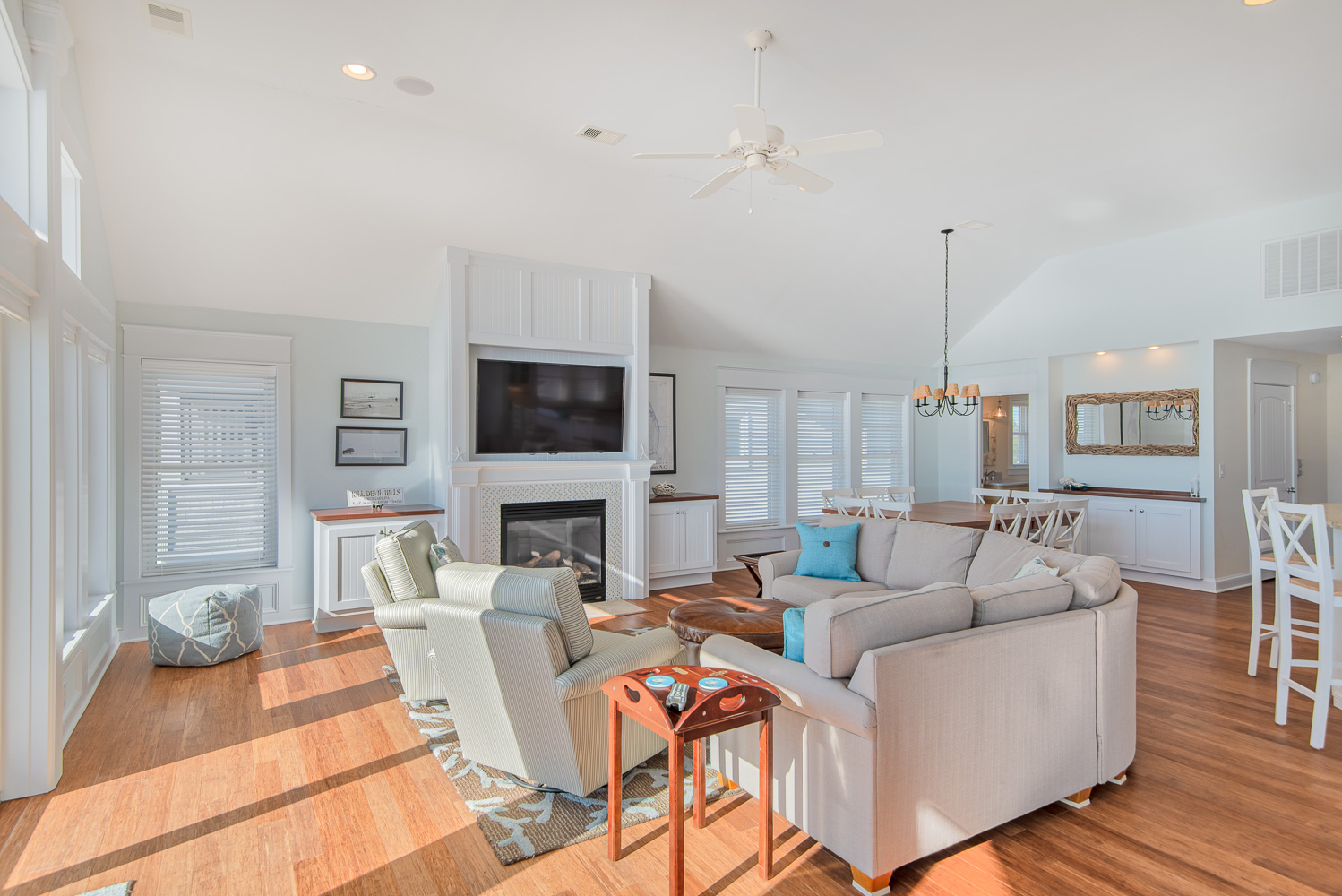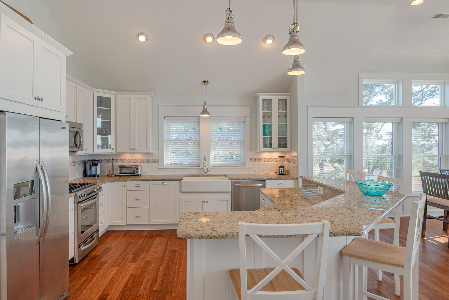 Top Level: Spacious Living/Dining/Kitchen Area, Cathedral Ceilings, Flat Panel TV, Gourmet Kitchen, Granite Counters, Gas Range, Stainless Steel Appliances; Access to Ship’s Watch, Private Suite w/King, TV, Full Bath w/Tub/Shower, and Great Sound Views.