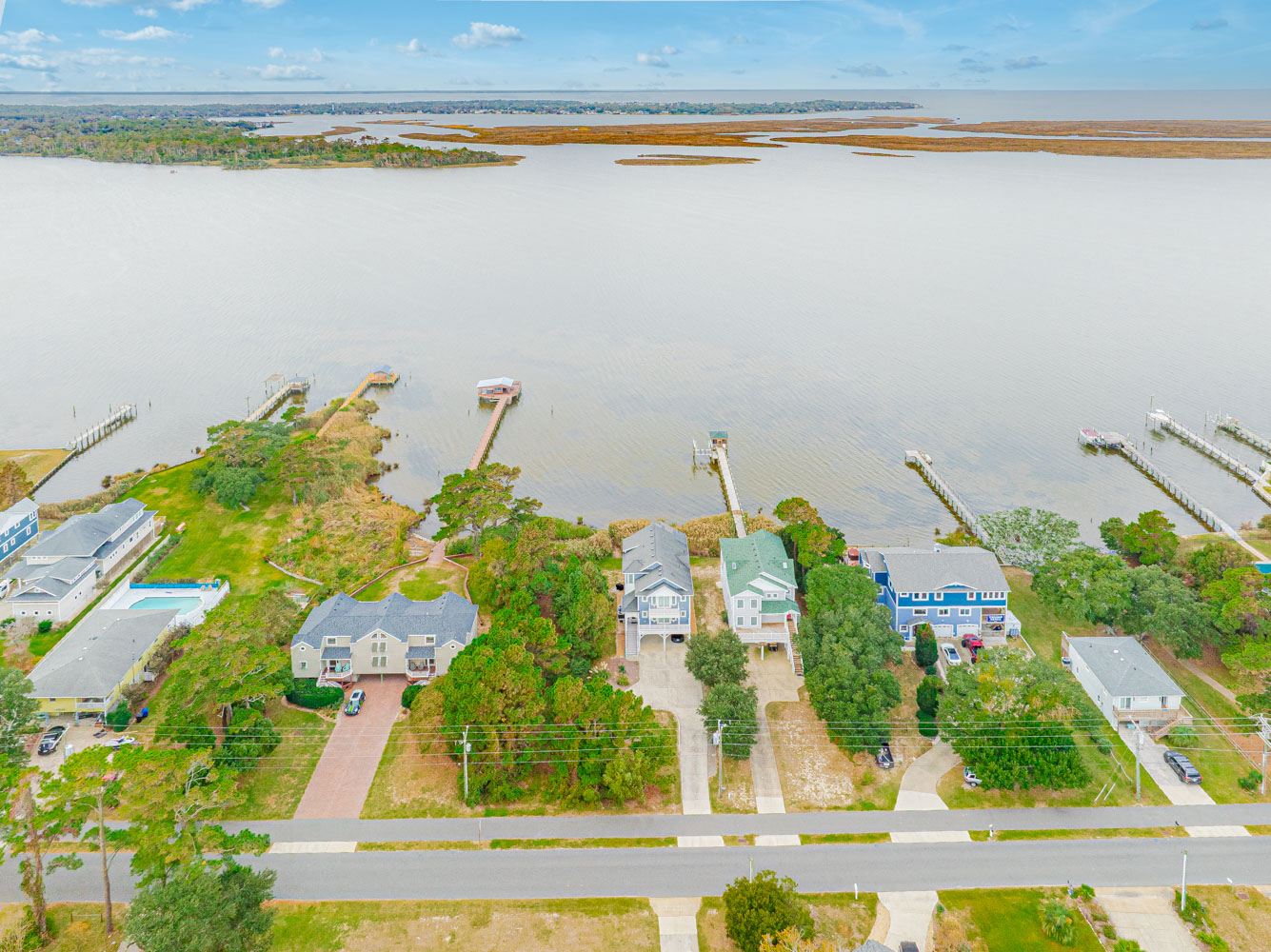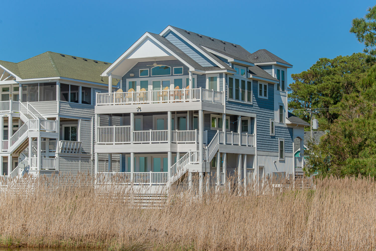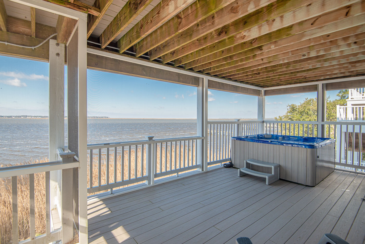 Level Two: 3 Bedrooms (Private Grand Soundfront Suite w/King, TV, Full Bath w/Shower; Private Suite w/Queen, Bunk Set, TV, Full Bath w/Tub/Shower; 1 w/Duo Bunk, TV, Full Bath w/Tub/Shower), Laundry Area, Sound Views, and Large Screen Porch w/Hot Tub, Sound Views, and Deck Furniture.
