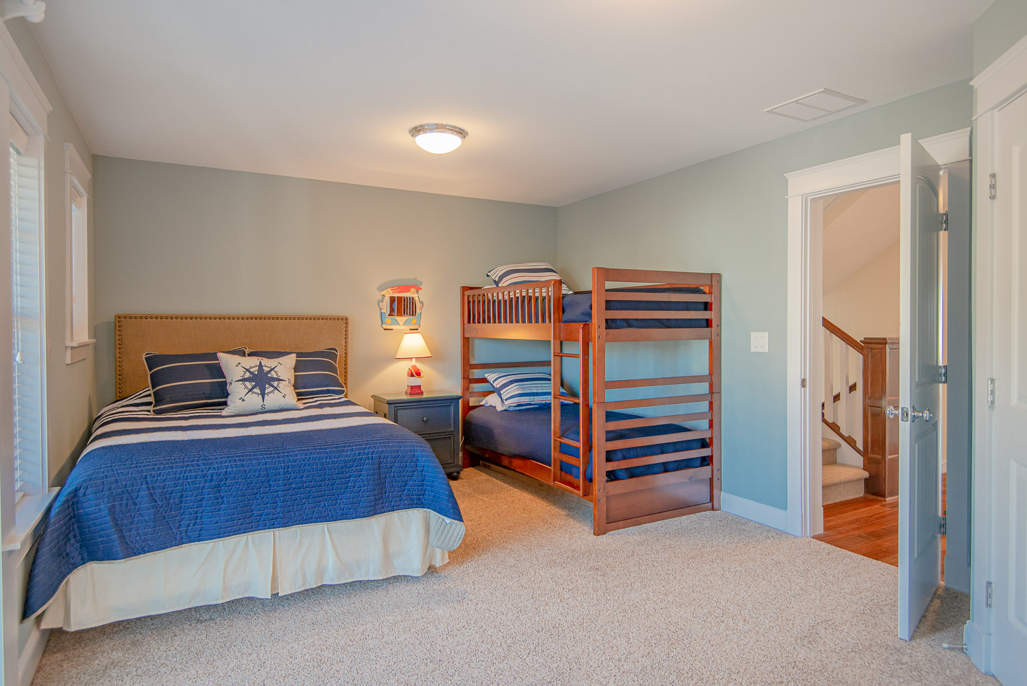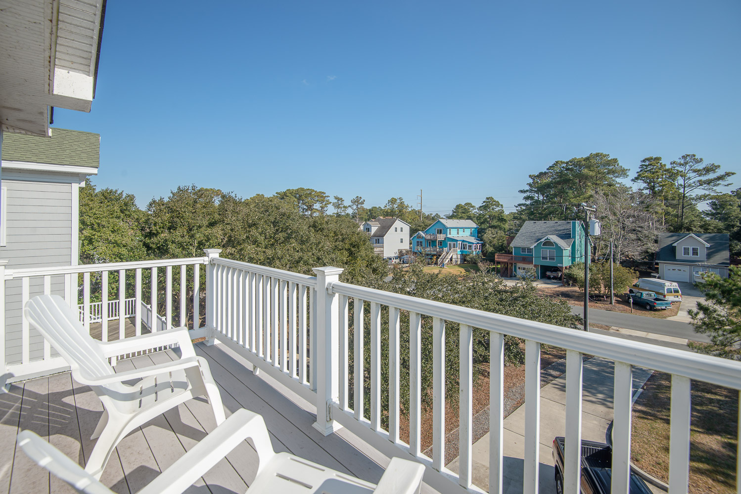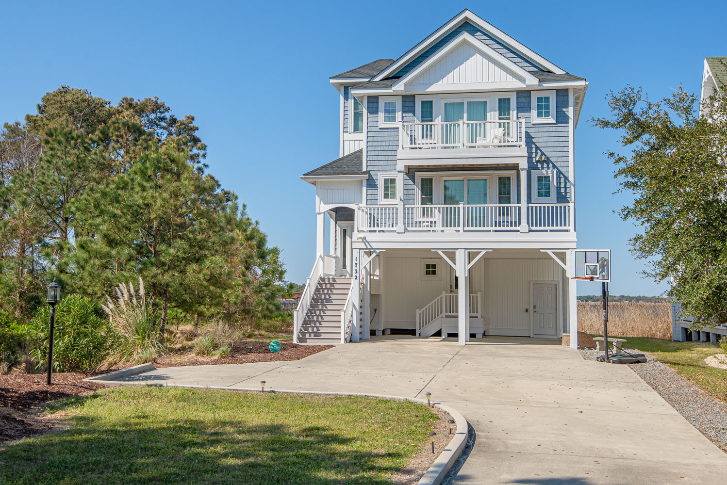 Level Two: 3 Bedrooms (Private Grand Soundfront Suite w/King, TV, Full Bath w/Shower; Private Suite w/Queen, Bunk Set, TV, Full Bath w/Tub/Shower; 1 w/Duo Bunk, TV, Full Bath w/Tub/Shower), Laundry Area, Sound Views, and Large Screen Porch w/Hot Tub, Sound Views, and Deck Furniture.