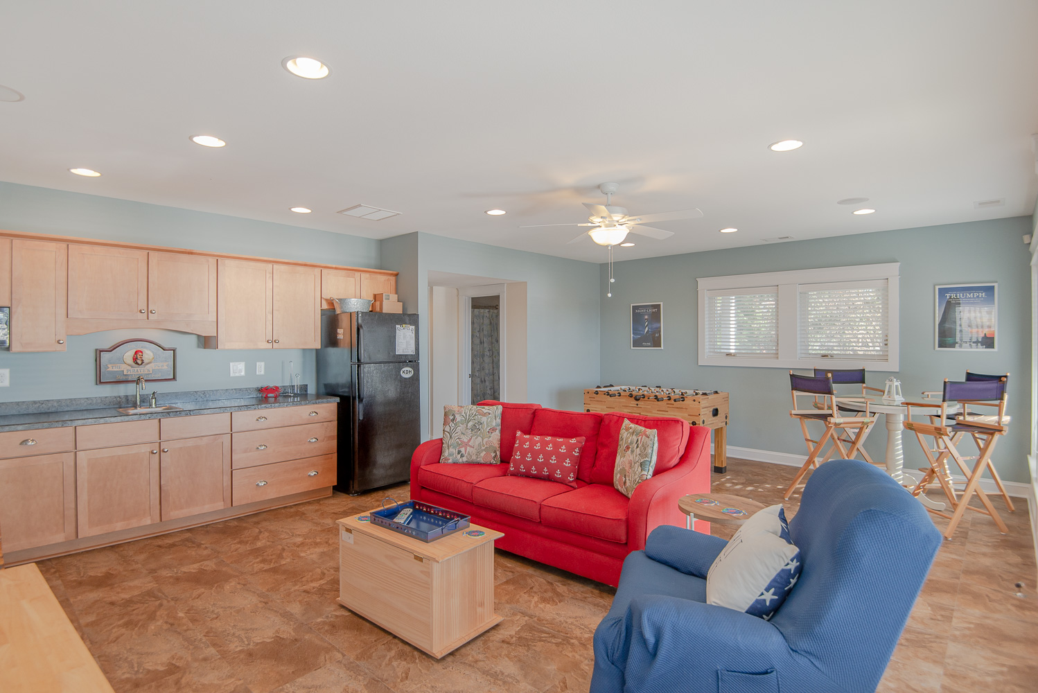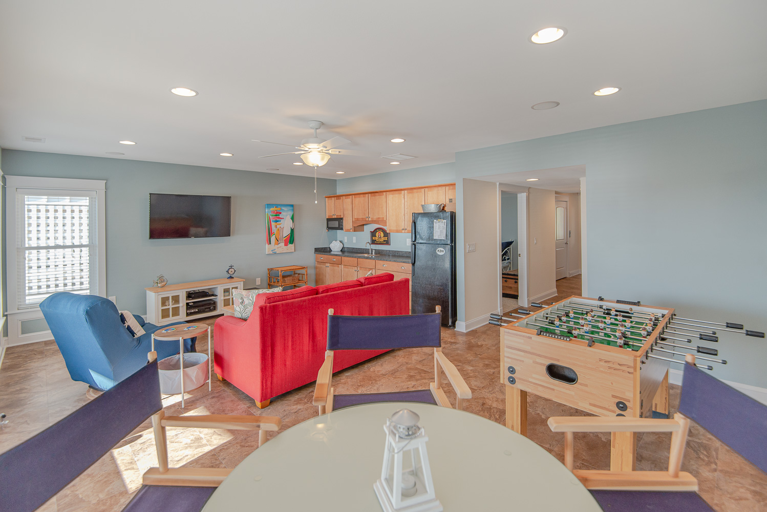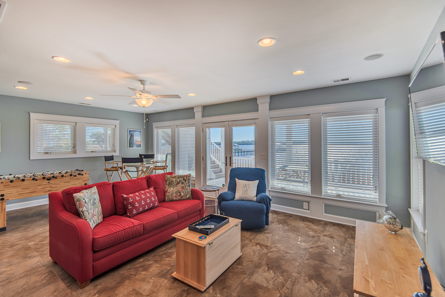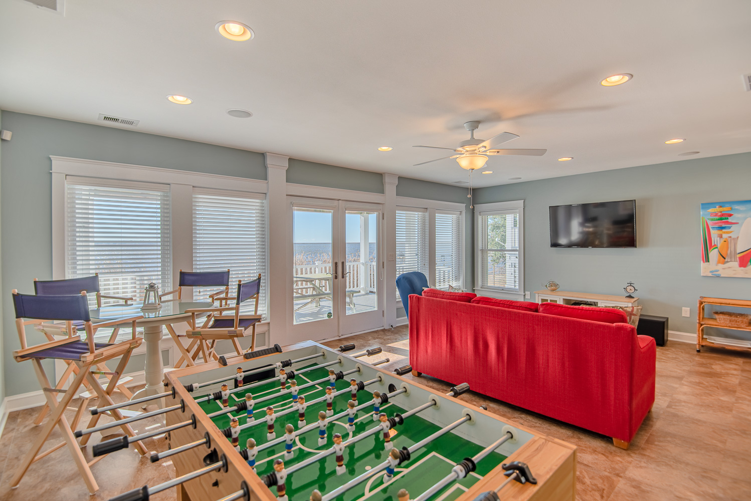 Level One: Rec. Room w/Foosball Table, Den w/Sitting Area, Large Flat Screen TV, Wet Bar, Full Size Refrigerator, Sound Views, Bonus Room/Office w/Single Daybed, Full Hall Bath w/Tub/Shower, and Covered Deck w/Deck Furniture.
