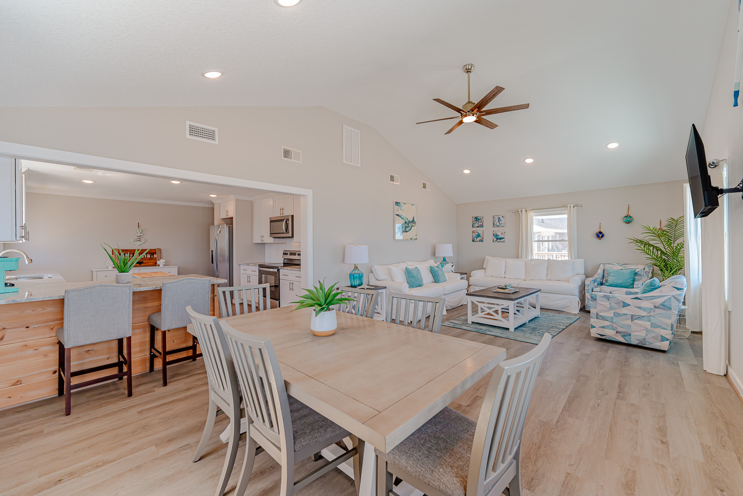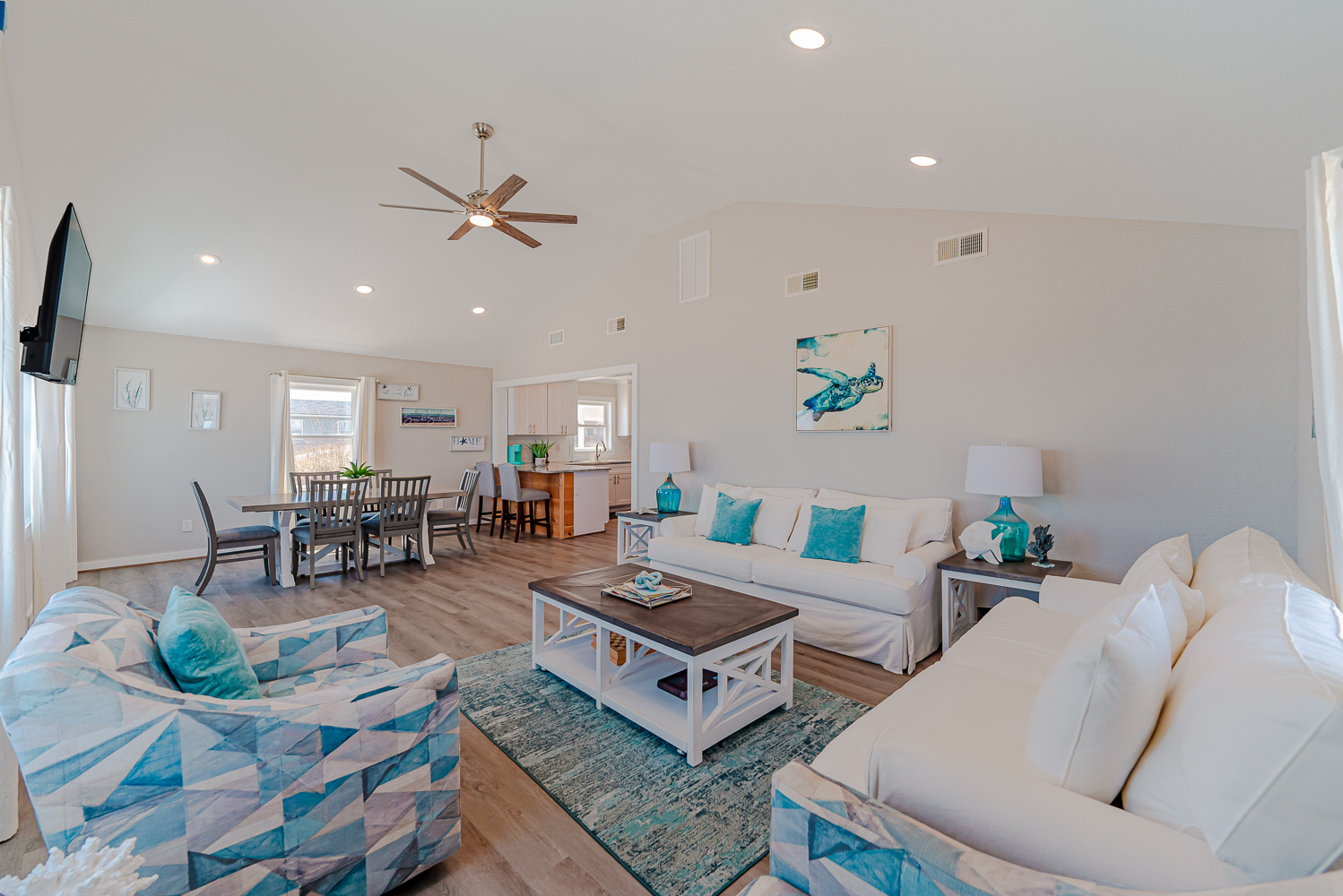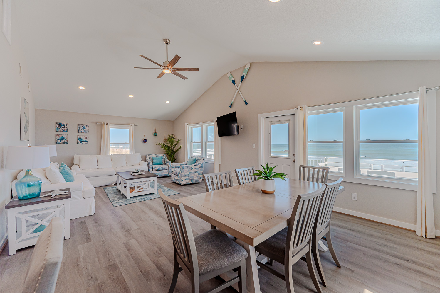The cottage interior offers an open living, dining, kitchen area that feature magnificent views from inside & from the oceanfront deck & south-side covered porch. Upscale renovations provide a coastal elegance experience with an all new kitchen with granite countertops, stainless steel appliances, tiled bathrooms & luxury vinyl plank flooring throughout. Below the cottage you will find the perfect spot to enjoy the cool ocean breeze while relaxing around the picnic table & sitting area with sand path to the beach.