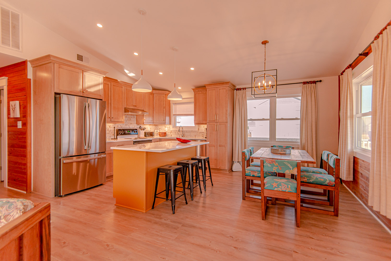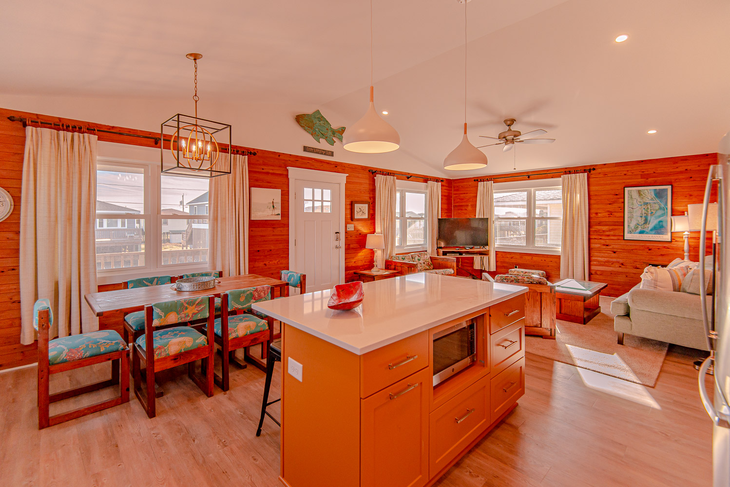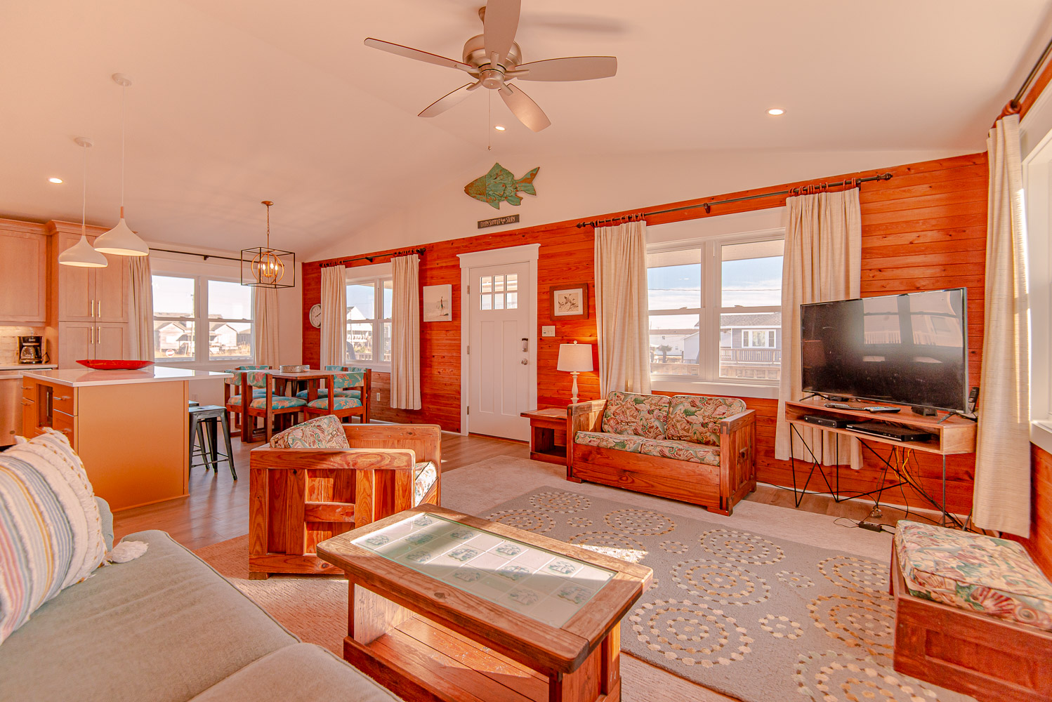 Main Level: Open Concept Living Area, Kitchen Area w/Island Bar Seating for Three (3), Dining Area w/Seating for Six (6), 3 Bedrooms (Private Suite w/Queen, Smart TV, and Full Bath w/Tiled Walk-In Shower, 1 w/Queen, Smart TV, 1 w/2 Singles, Smart TV), Full Hall Bath w/Tub/Shower, Covered Deck, and Steps to Observation Deck w/Ocean Views.