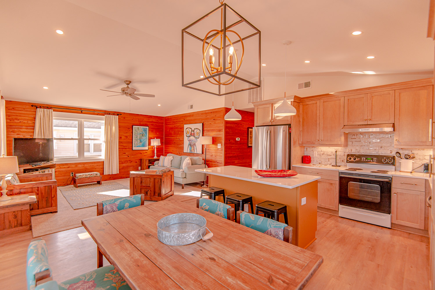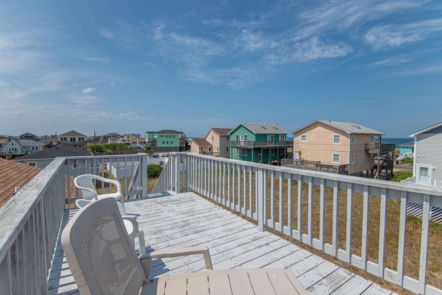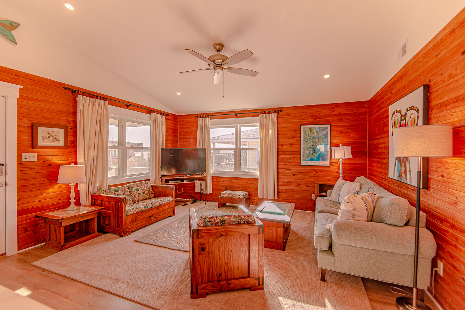 Main Level: Open Concept Living Area, Kitchen Area w/Island Bar Seating for Three (3), Dining Area w/Seating for Six (6), 3 Bedrooms (Private Suite w/Queen, Smart TV, and Full Bath w/Tiled Walk-In Shower, 1 w/Queen, Smart TV, 1 w/2 Singles, Smart TV), Full Hall Bath w/Tub/Shower, Covered Deck, and Steps to Observation Deck w/Ocean Views.