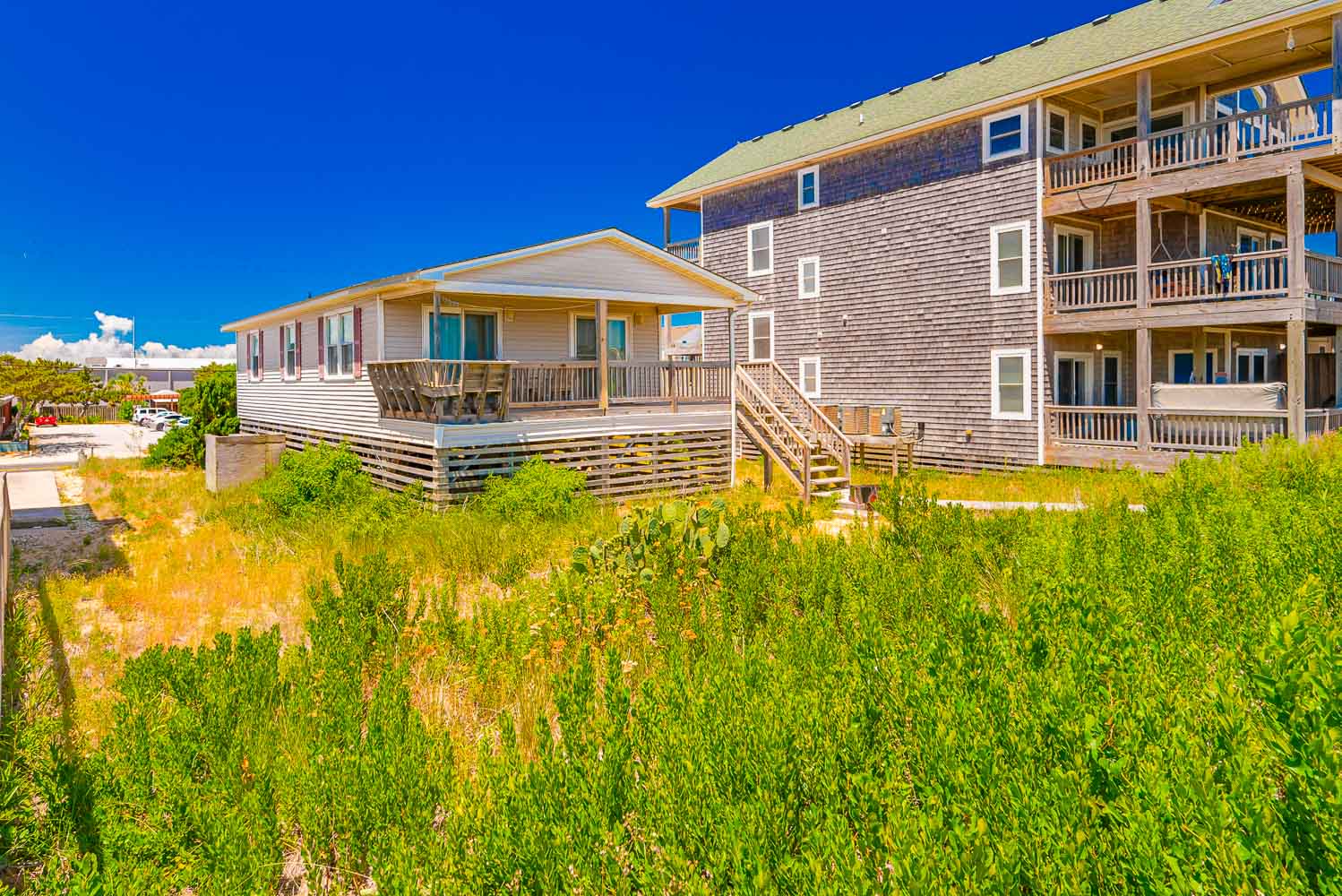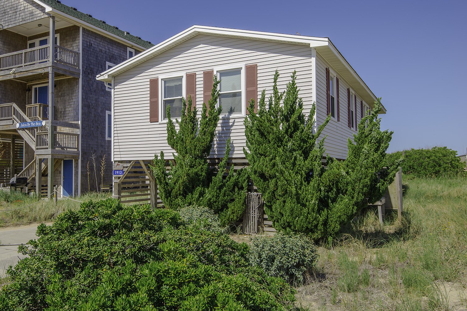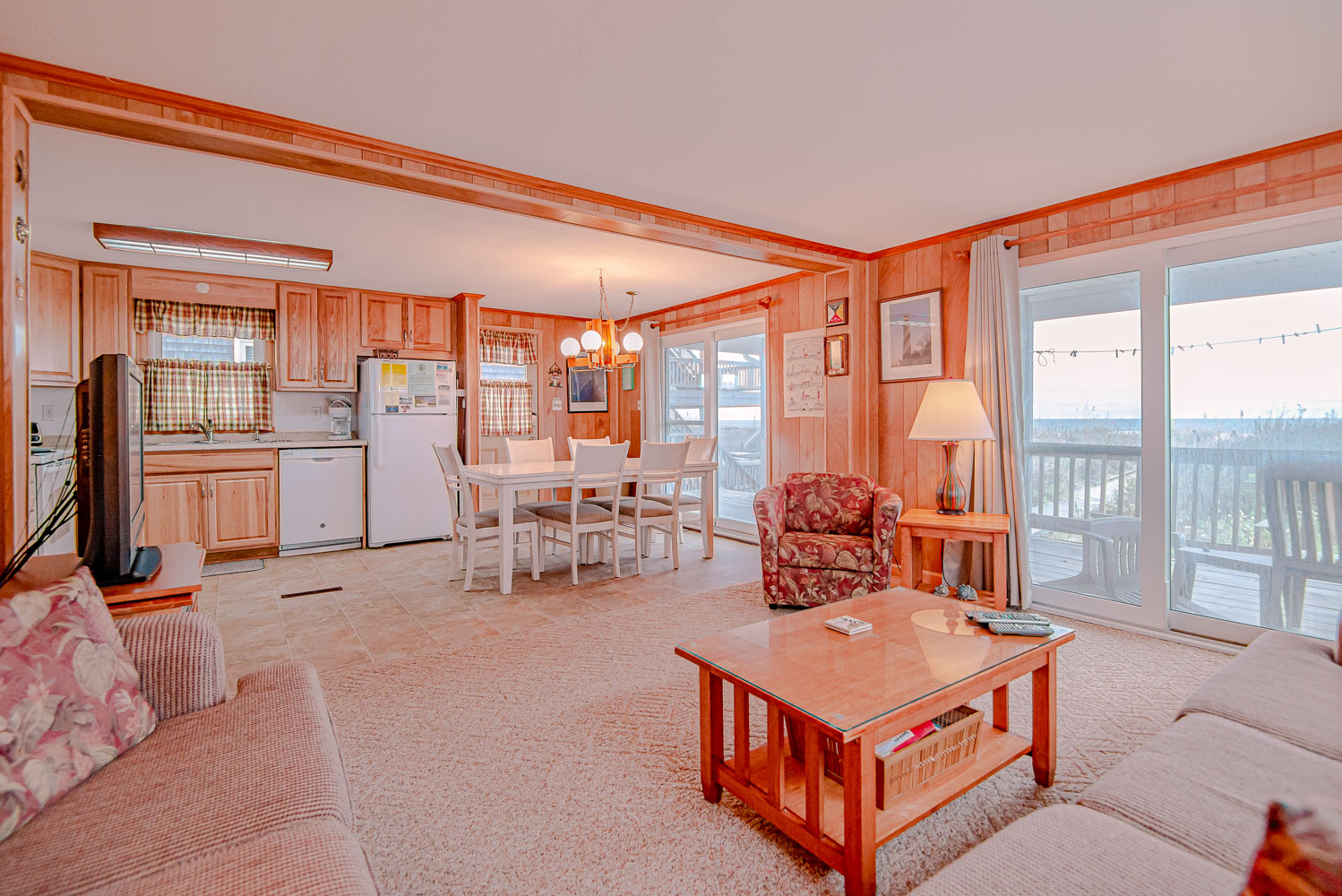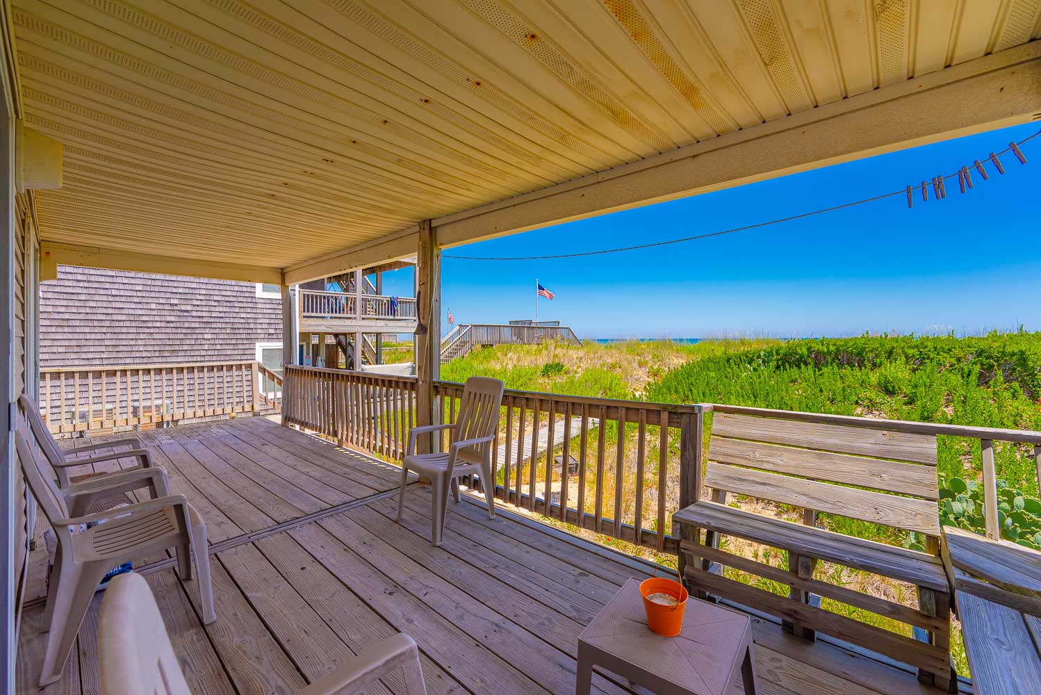 Main Level: Living Area, TV, DVD, Kitchen Area, Dining Area w/Seating for Six (6), 3 Bedrooms (Private Suite w/Queen, TV, Private Half Bath; 1 w/Queen, TV; 1 w/2 Singles, TV), Full Hall Bath w/Tub/Shower, Access to Covered Deck w/Ocean Views, Deck Furniture, Built-in-Seating, and Steps to Boarded Walkway to Beach.