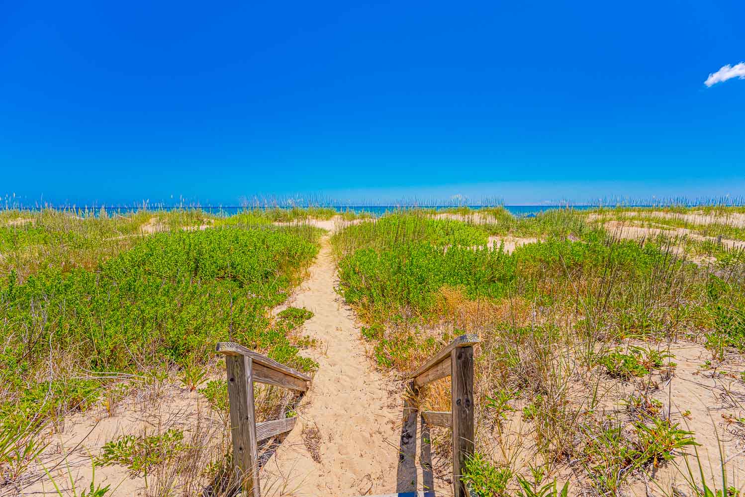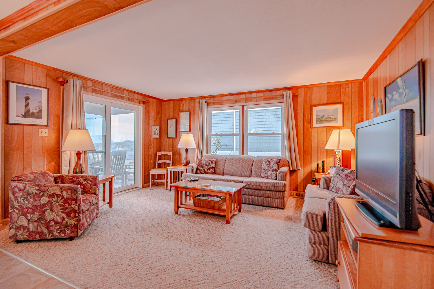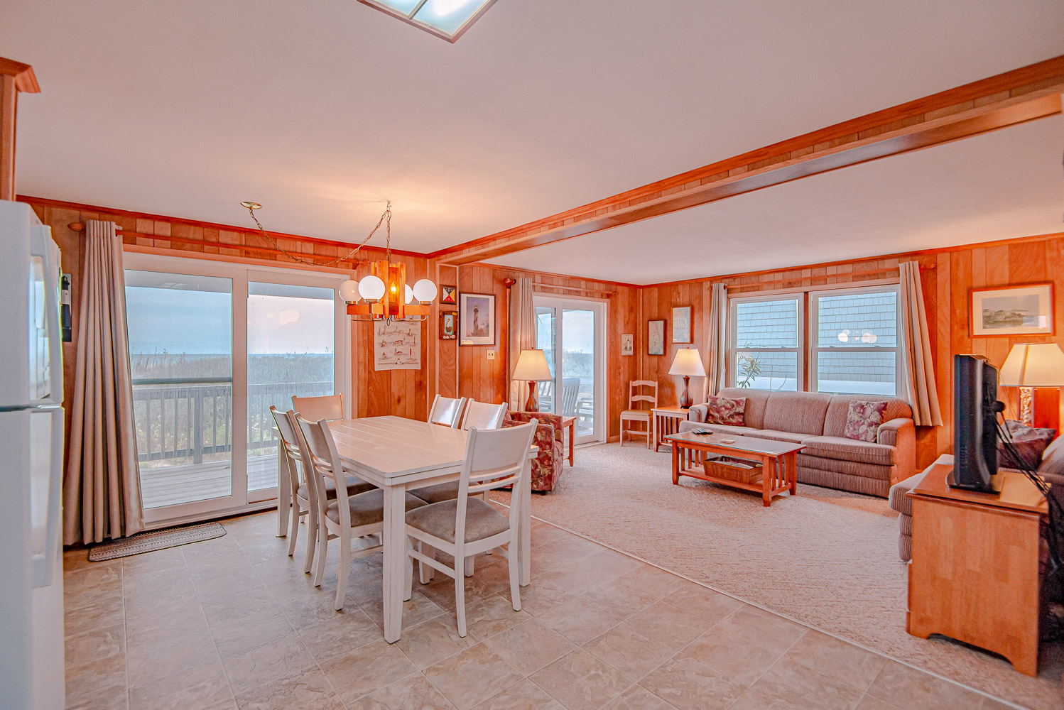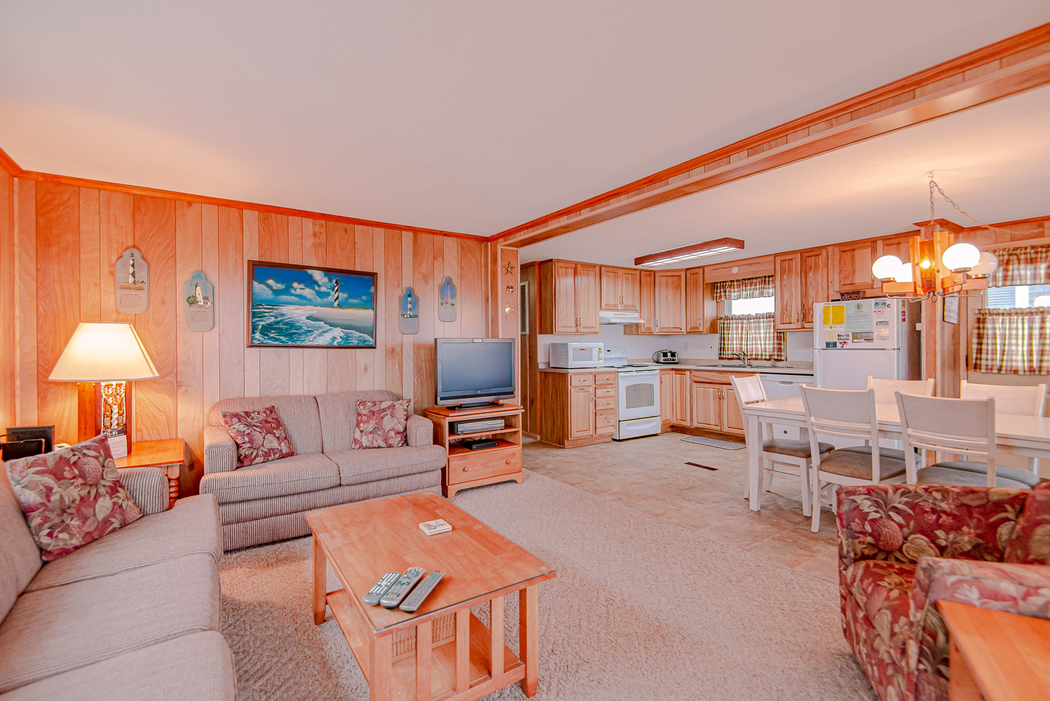 Main Level: Living Area, TV, DVD, Kitchen Area, Dining Area w/Seating for Six (6), 3 Bedrooms (Private Suite w/Queen, TV, Private Half Bath; 1 w/Queen, TV; 1 w/2 Singles, TV), Full Hall Bath w/Tub/Shower, Access to Covered Deck w/Ocean Views, Deck Furniture, Built-in-Seating, and Steps to Boarded Walkway to Beach.