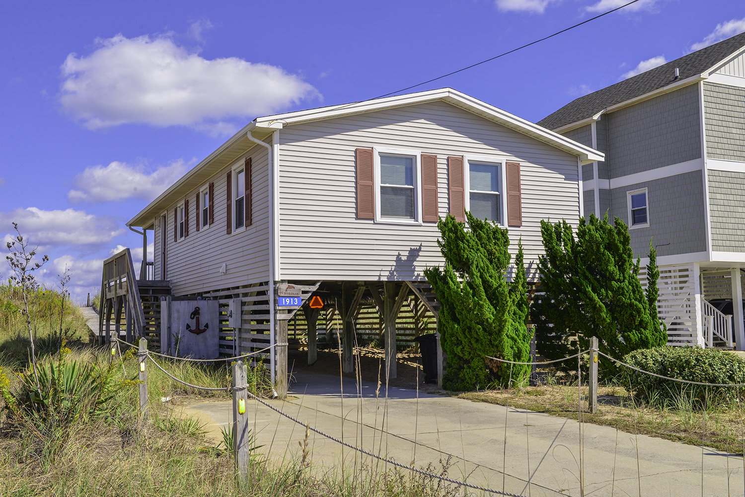 Ground Level: Parking for 3 Cars, Steps to Main Level Entry, Enclosed Outside Shower, Park Grill, and Walkway to Beach.