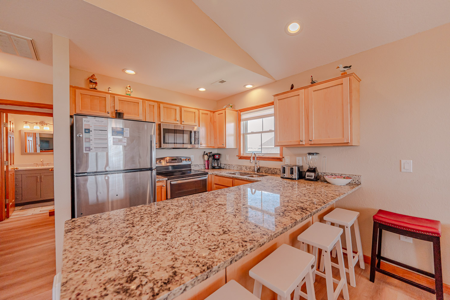 Top Level: Living Area w/Large Flat Screen TV, Hardwood Floors, Beautiful Ocean Views, Fully Equipped Kitchen Area w/Stainless Steel Appliances, Keurig, Bar Seating for Four (4), Dining Area w/Seating for Eight (8), Bedroom w/King, TV, Full Semi-Private Bath w/Tub/Shower (Shared w/Living Area but with Hall Door for Enhanced Privacy), Access to Covered Porch w/Outdoor Dining Area w/Seating for Six (6), and Sun Deck w/Premium Deck Furniture and Amazing Ocean Views.