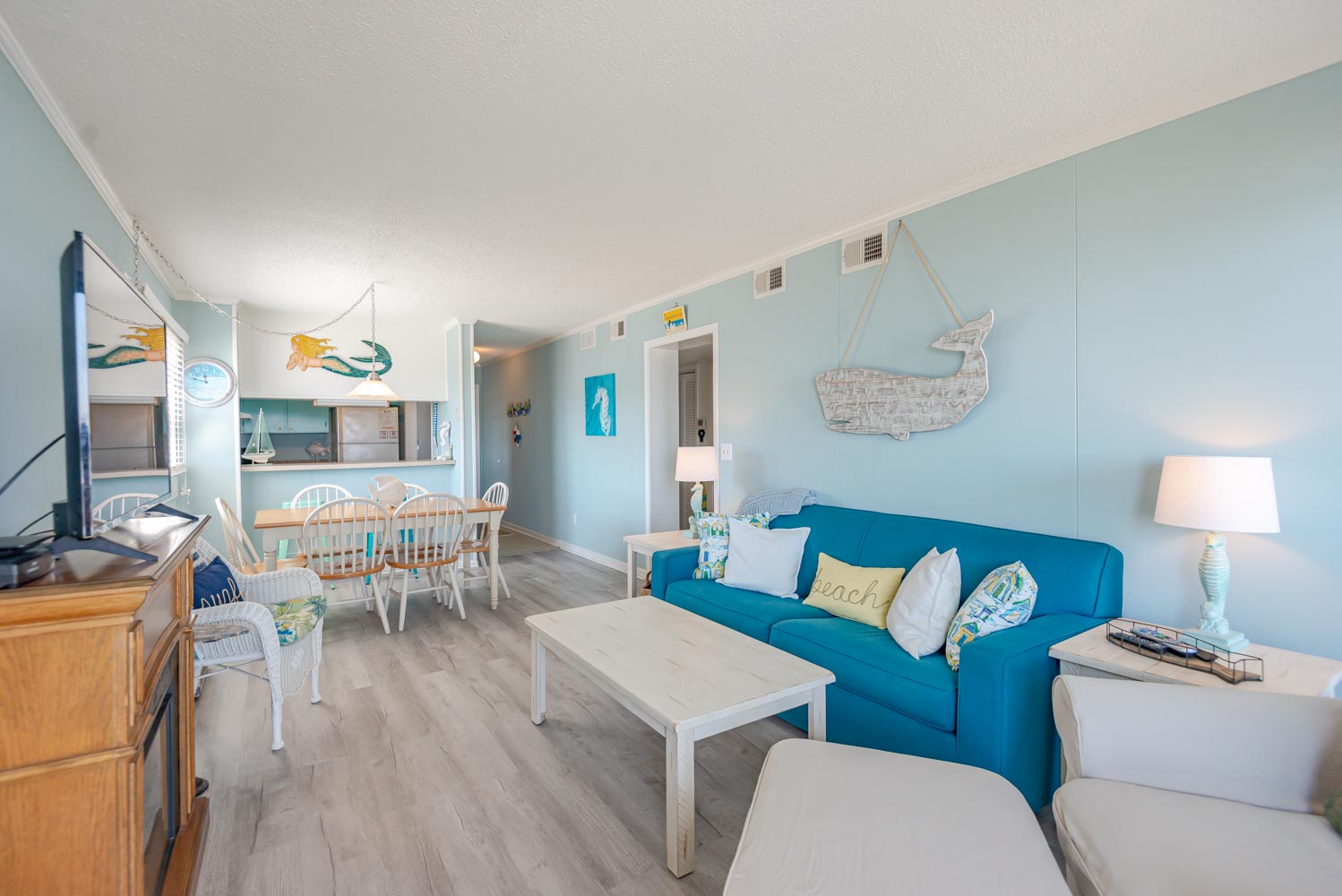 Main Level: Living Area, TV, Beautiful Flooring, Full Equipped Kitchen Area, Dining Area w/Seating for Six (6), 2 Bedrooms (Oceanfront Private Suite w/Queen, TV, & Full Bath w/Walk-In Shower, 1 w/2 Singles & TV), Full Hall Bath w/Tub/Shower, & Covered Porch w/Furniture & Ocean Views.