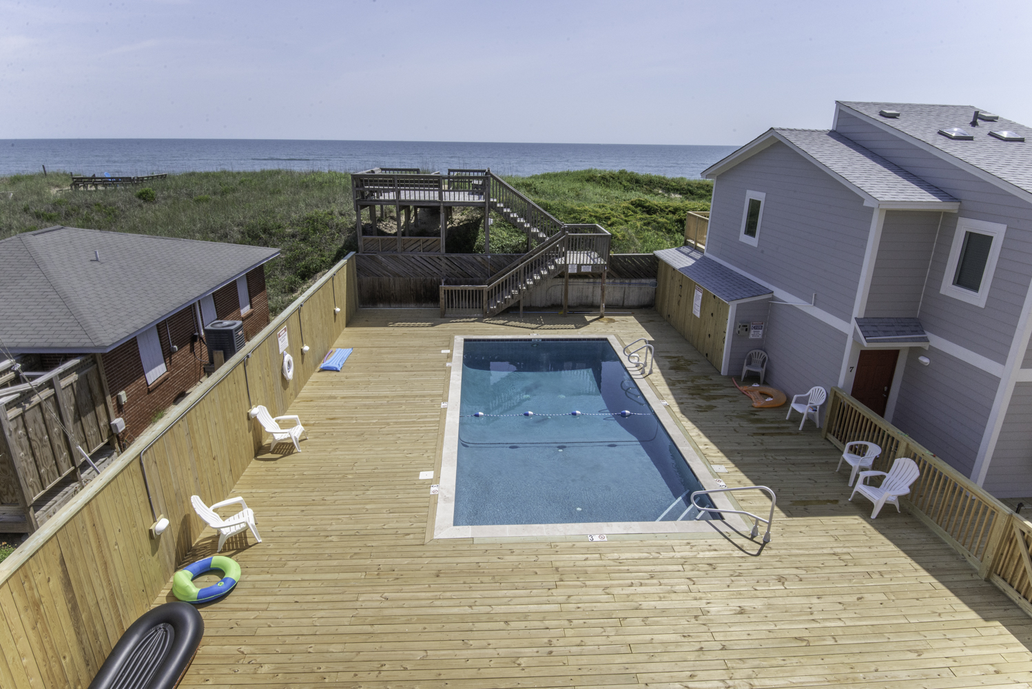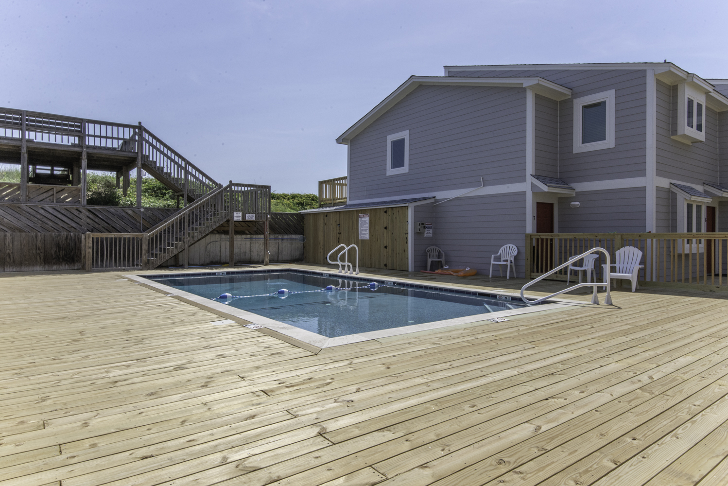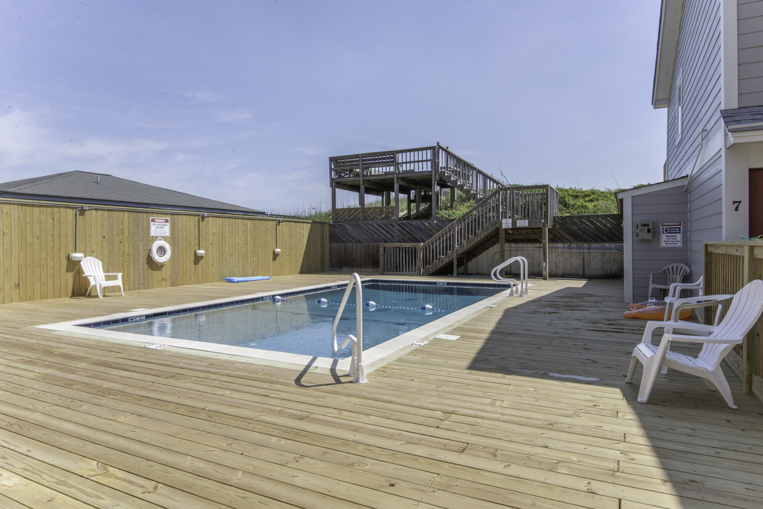 Ground Level: Parking for 1 Car, Community Swimming Pool, Steps to Large Dune Deck, and Beach Access.