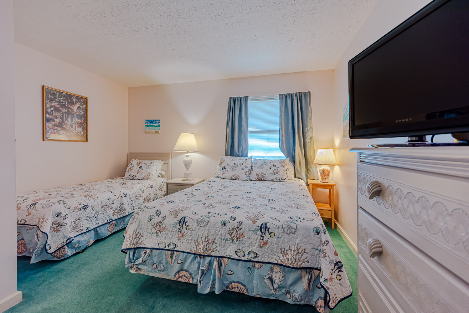 Top Level Unit: Spacious Living/Dining/Kitchen Area, Wet Bar, 3 Bedrooms (Private Suite w/ King, TV, Full Bath w/Tub/Shower, Ocean Views; 1 w/Queen, Single, TV; 1 w/2 Singles, TV), Full Shared Hall Bath w/Tub/Shower, Screened Porch w/Furniture, and Covered Deck w/Deck Furniture Facing the Ocean.